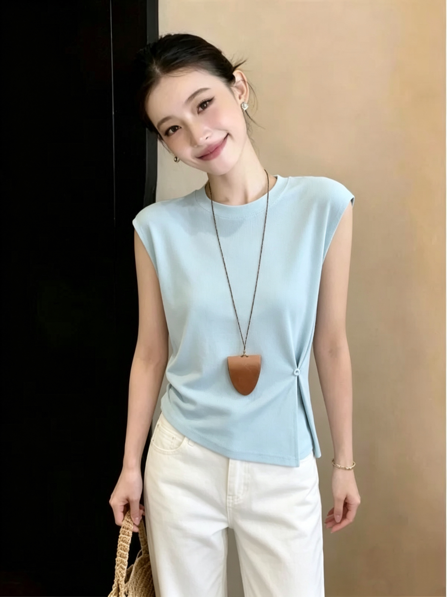 재고 있음 2026 여름 새로운 달콤한 스타일 리본 V넥 스택 착용 조끼 작은 청신 셔츠