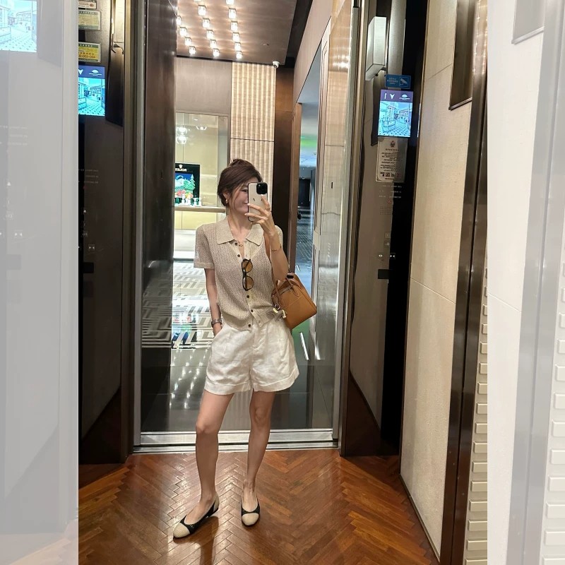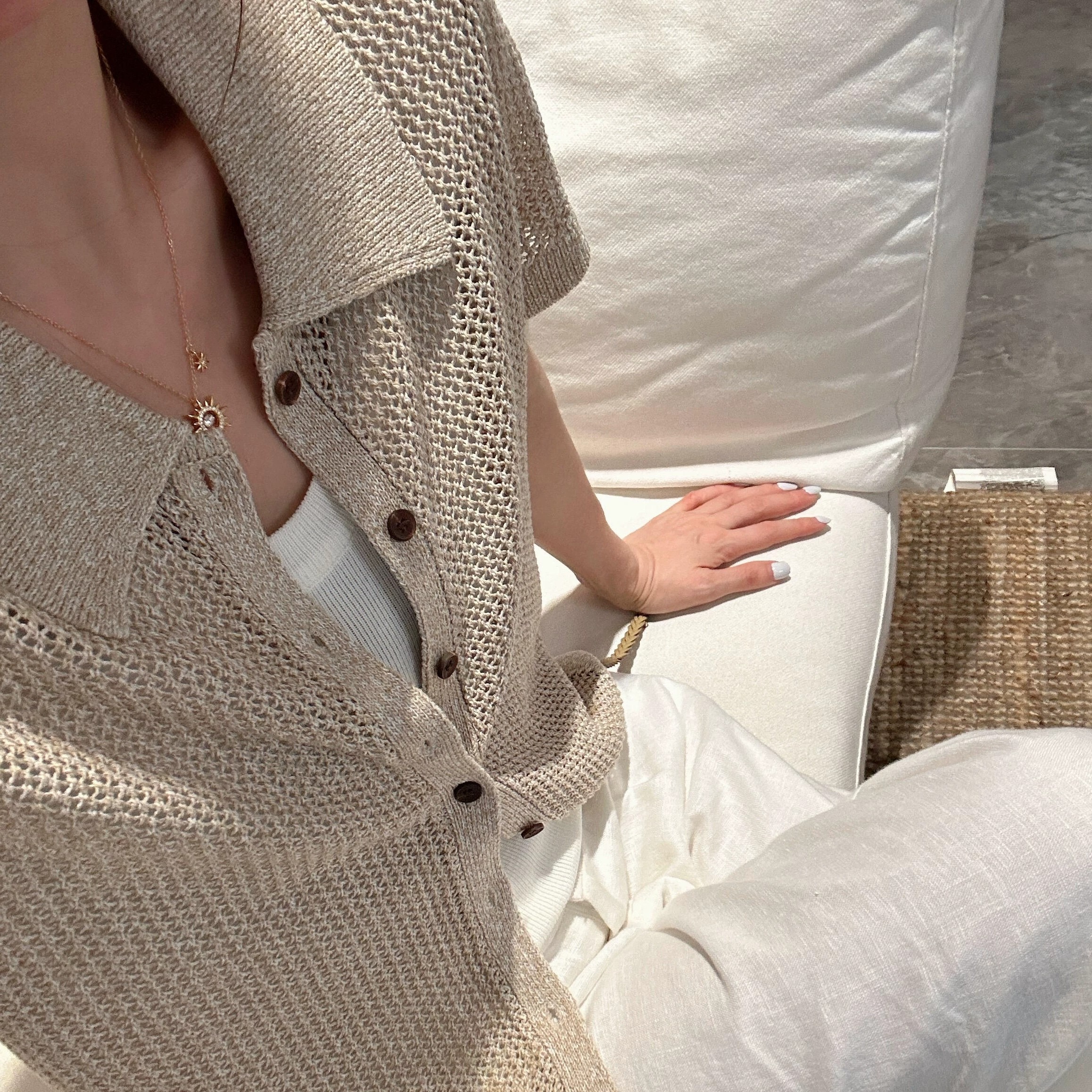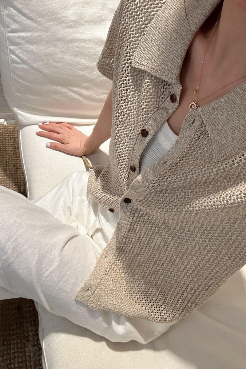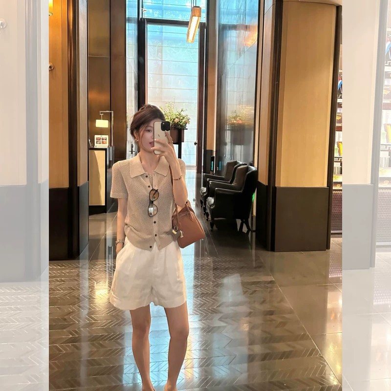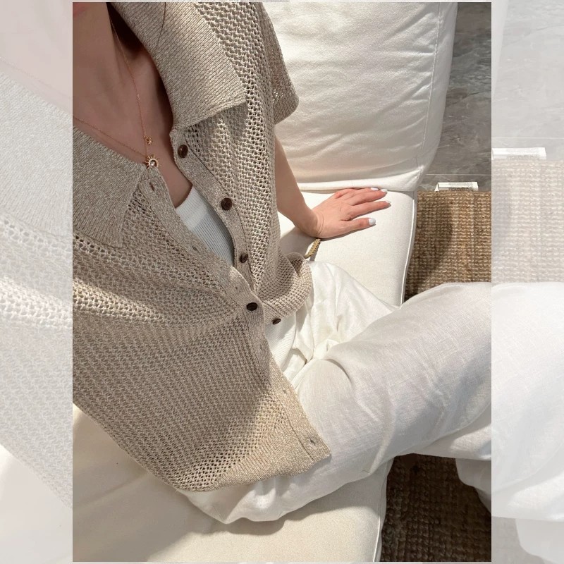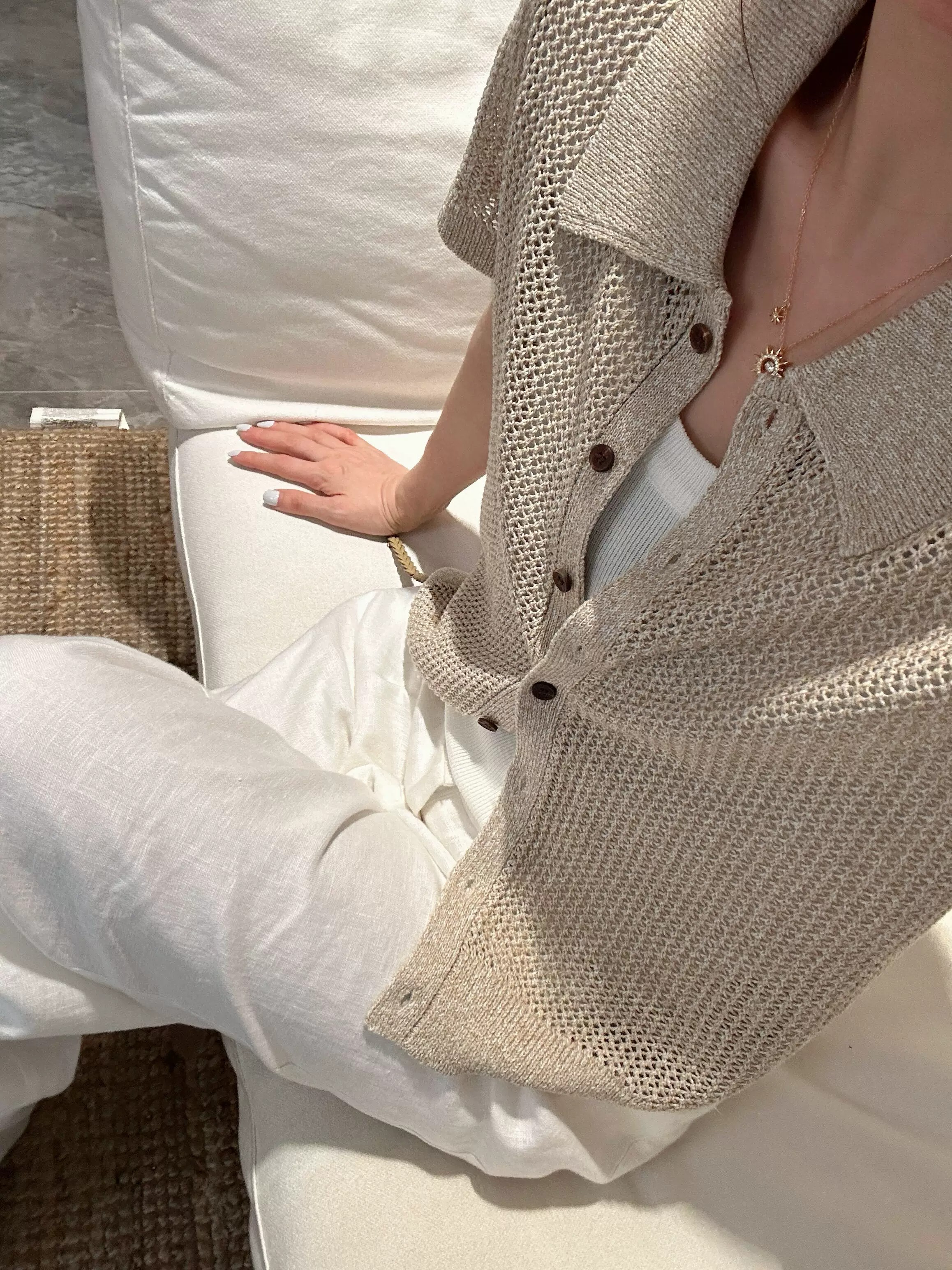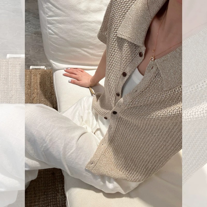 오래된 돈 바람 착용 가져 가라. POLO 칼라 긍정적 인 어깨 반팔 니트 오픈 가디건 여성 여름 외부 가져 가라. 홀로우 아웃 얇은 스타일 아니요 명중 섹션 맨위