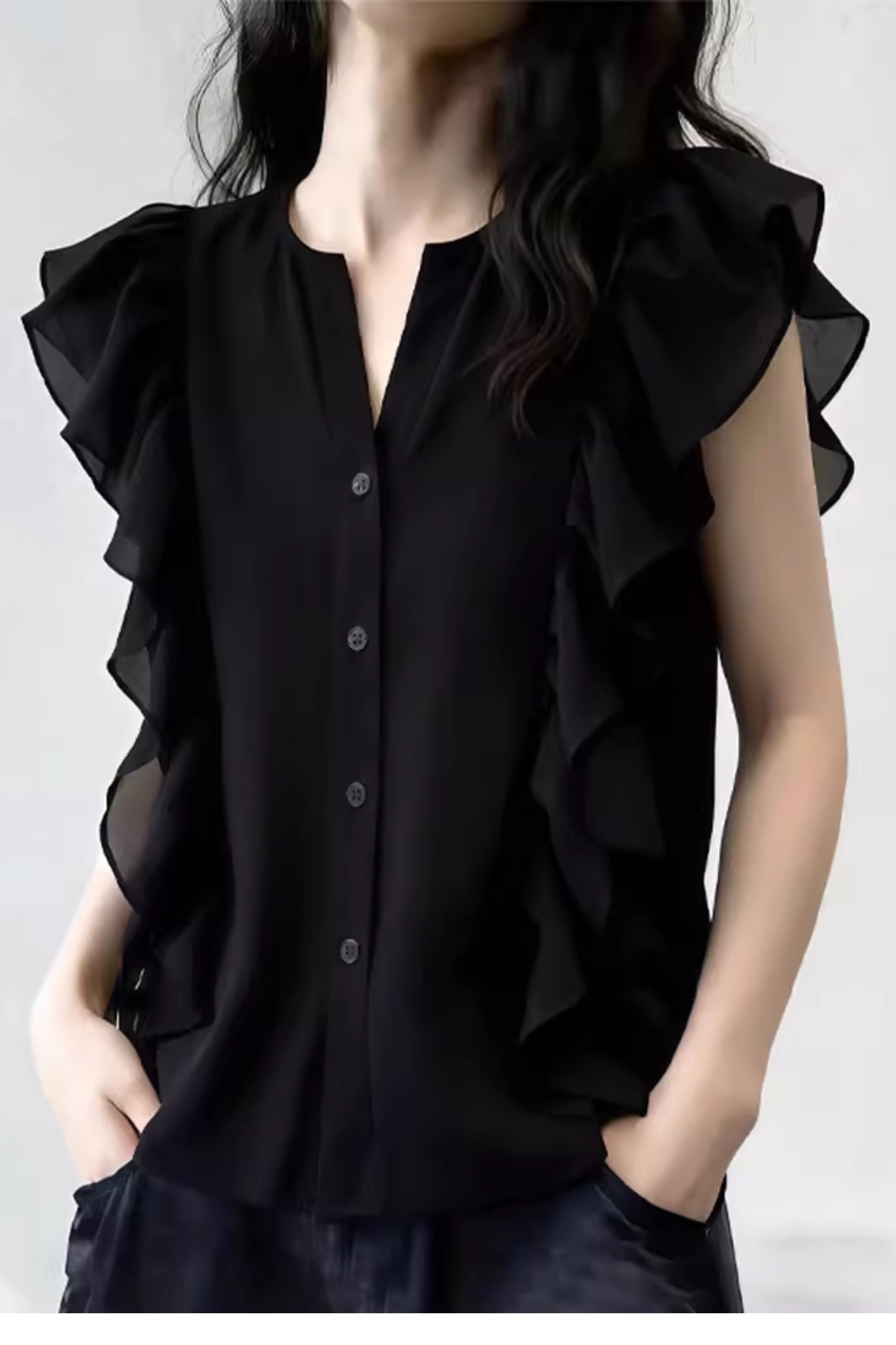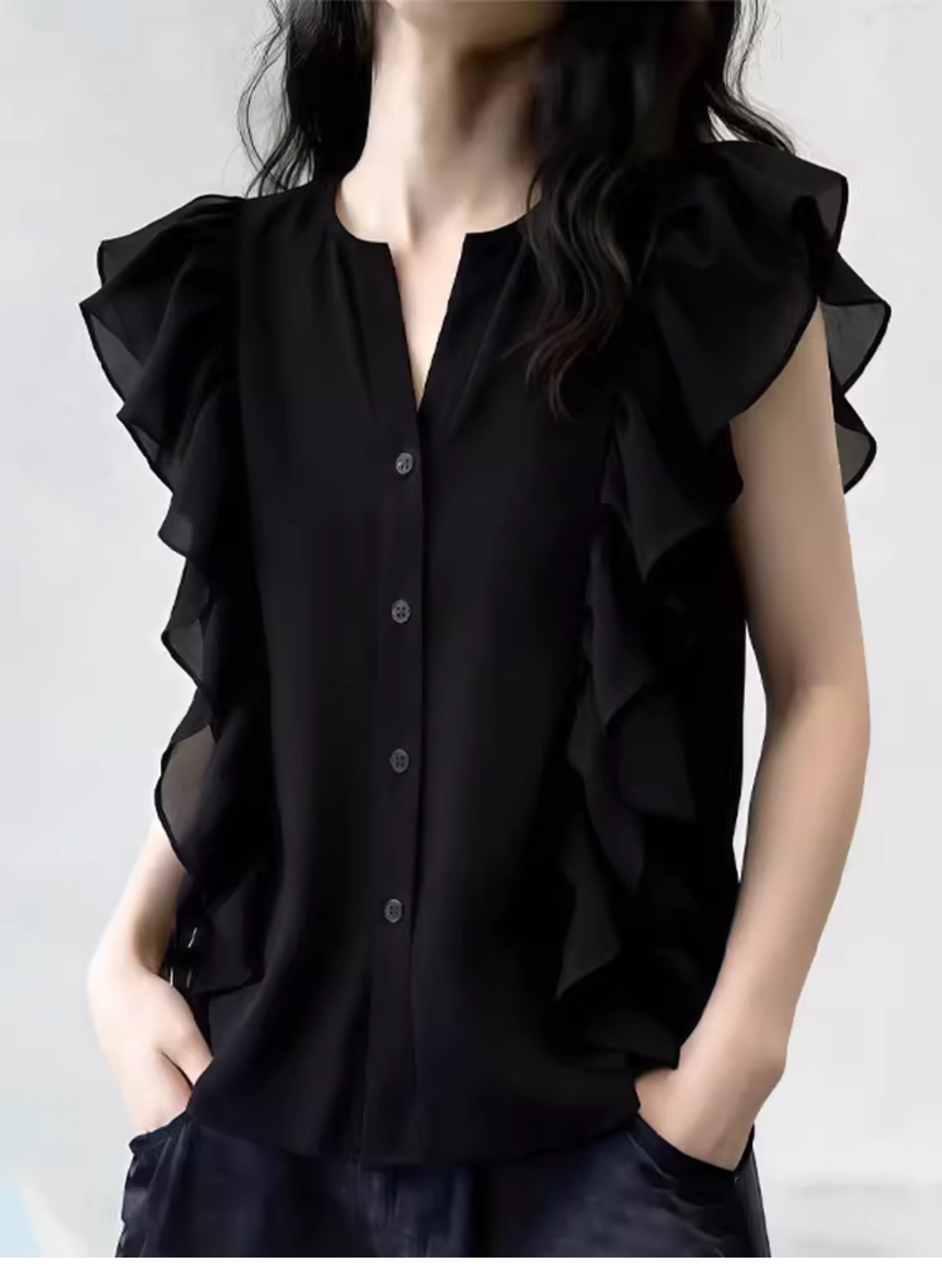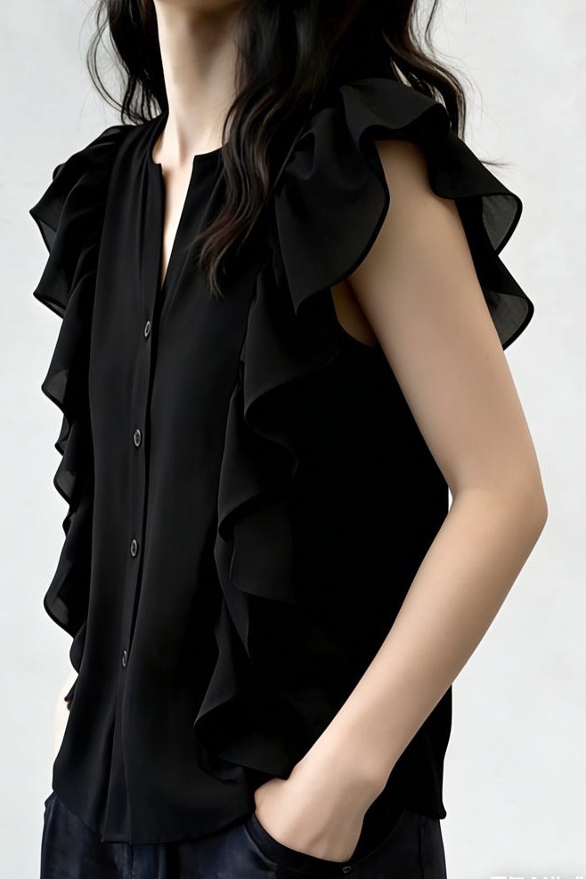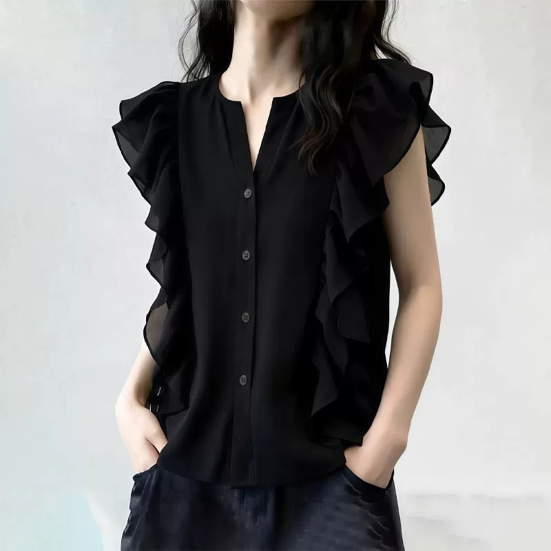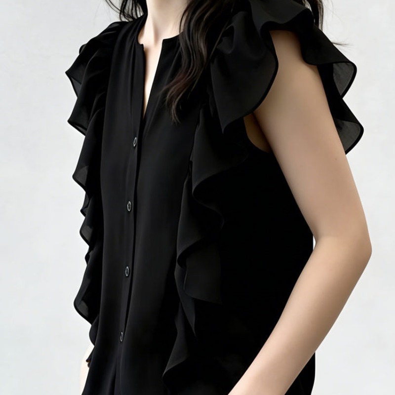 여름 드레스 새로운 디자인 섹션 V넥 플리츠 작은 날다 소매 맨위 여성 고급 센스 어깨 민소매 셔츠