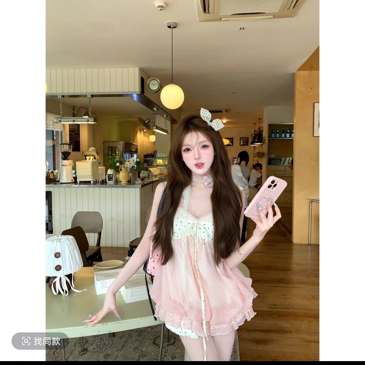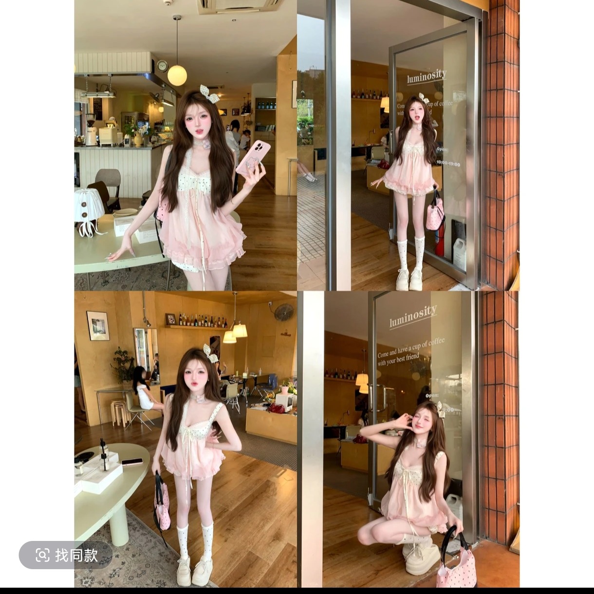 벚꽃 소녀 달콤한 스타일 봄 여름 여성 핑크색 레이스 꽃무늬 허리 수축 슬림해 보이는 점프 슈트 미니 스커트
