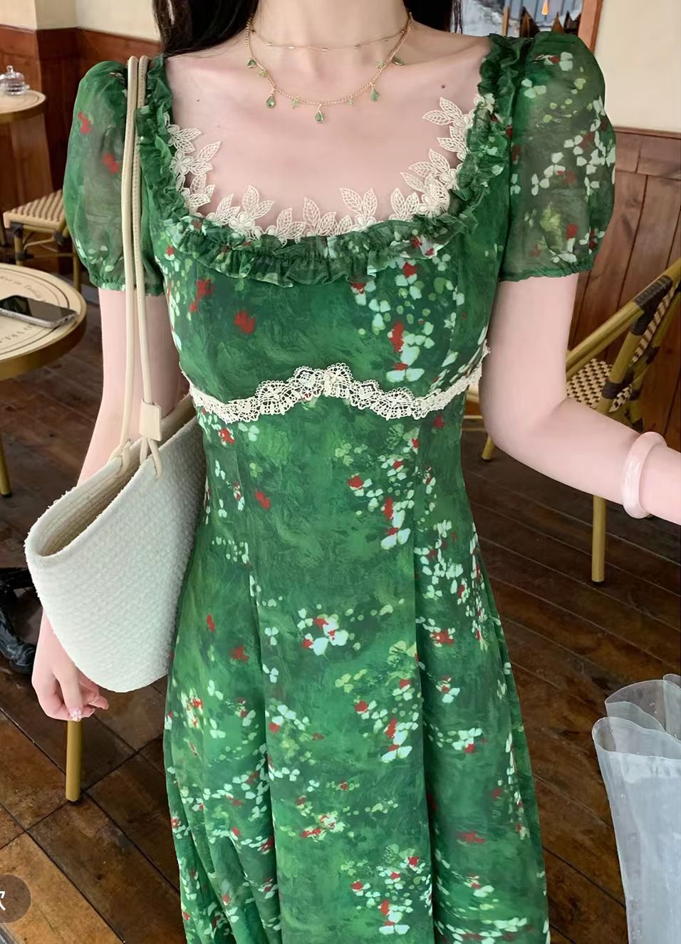 여름 스타일 프랑스식 디자인 센스 연령 감소 프릴 보트넥 니트 꽃무늬 여성 드레스