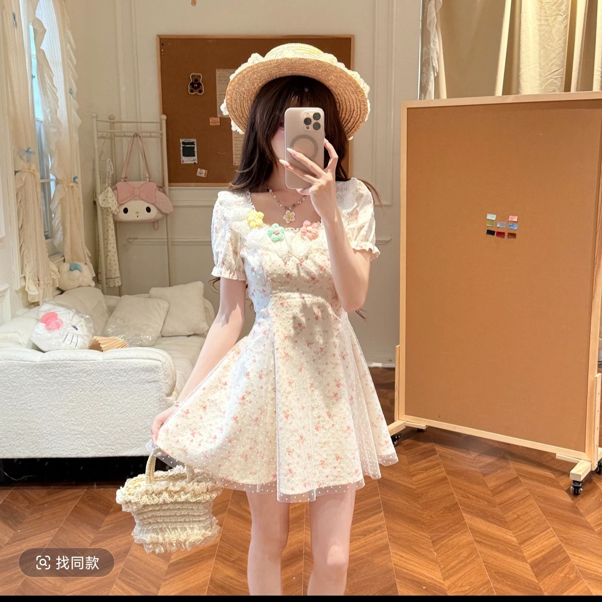 벚꽃 소녀 달콤한 스타일 봄 여름 여성 핑크색 레이스 꽃무늬 허리 수축 슬림해 보이는 점프 슈트 미니 스커트