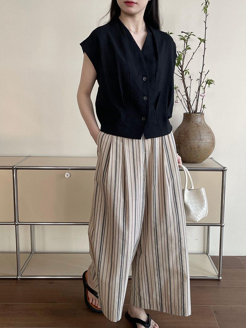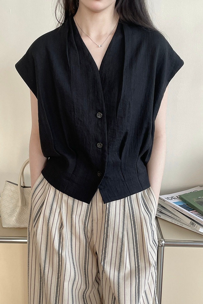 여름 드레스 새로운 디자인 섹션 V넥 플리츠 작은 날다 소매 맨위 여성 고급 센스 어깨 민소매 셔츠
