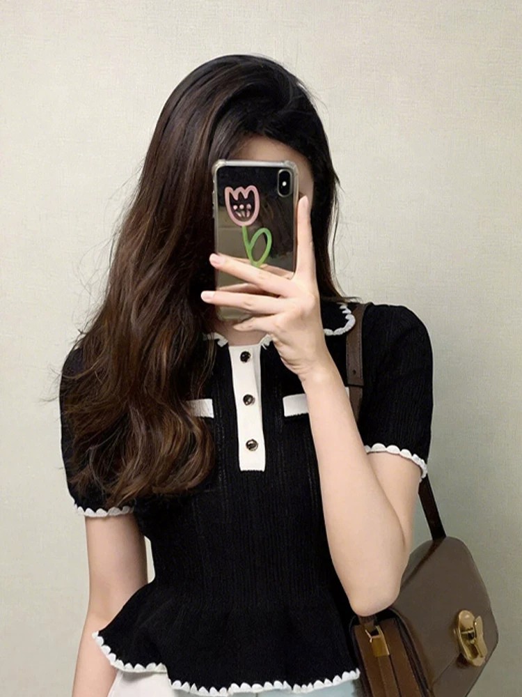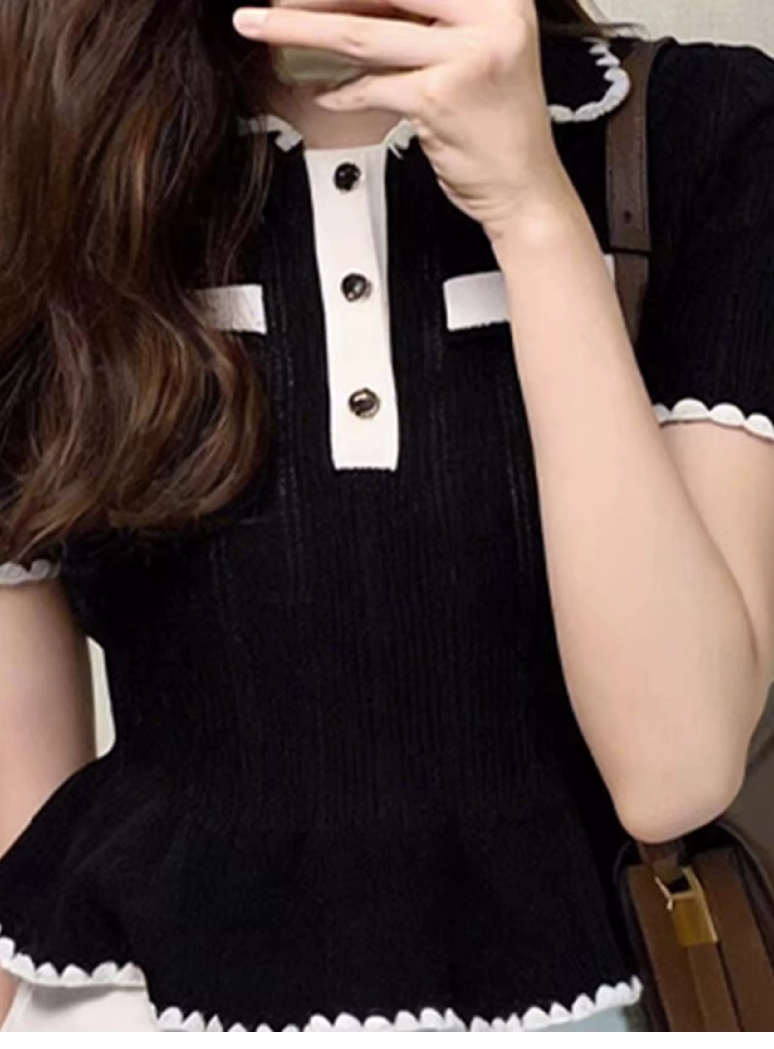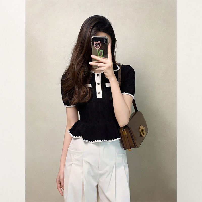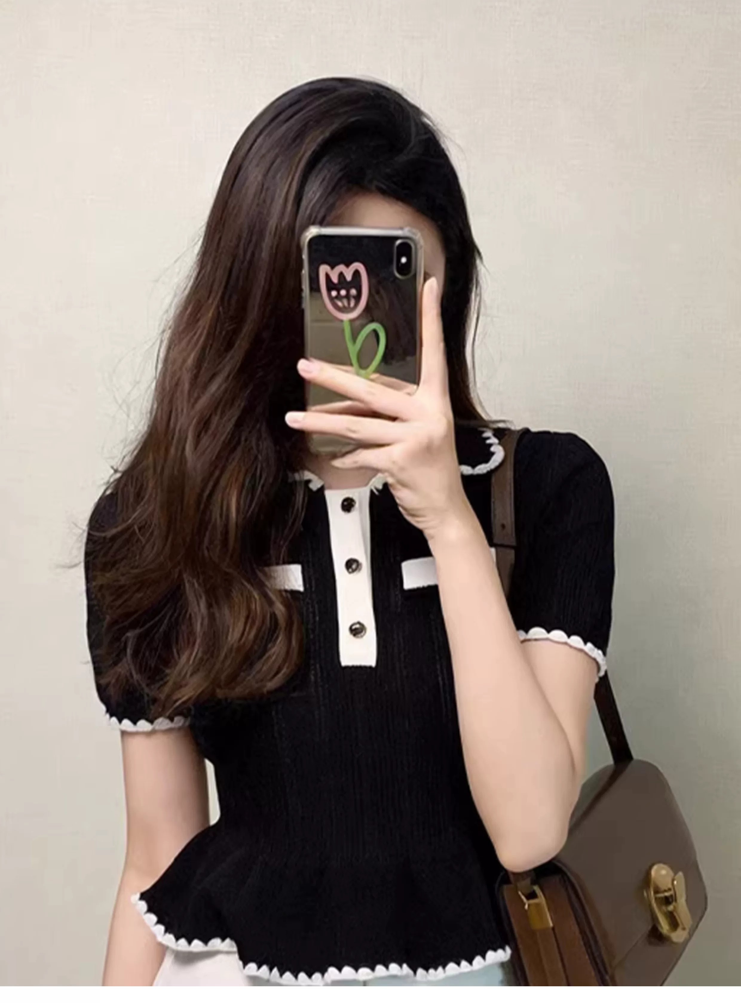 검정색 니트 반팔 티셔츠 여성 여름 드레스 2026 새로운 작은 키 쇼트 스타일 베이비 칼라 허리 수축 거품 소매 맨위