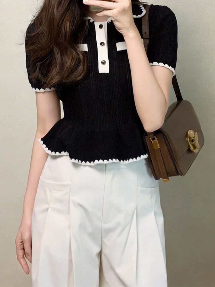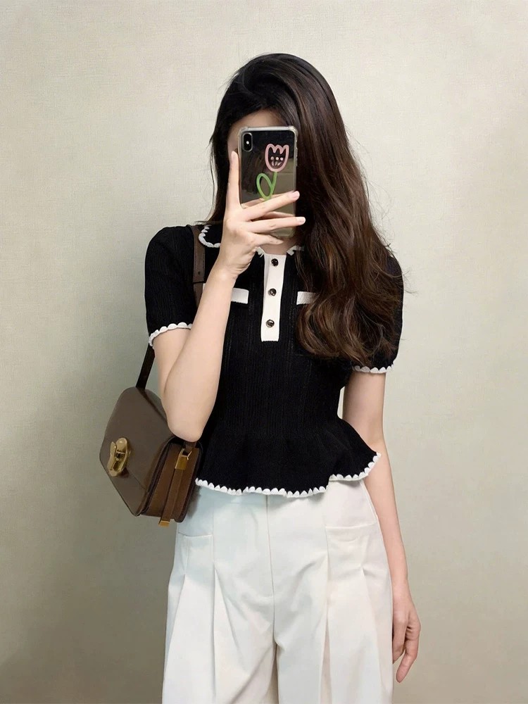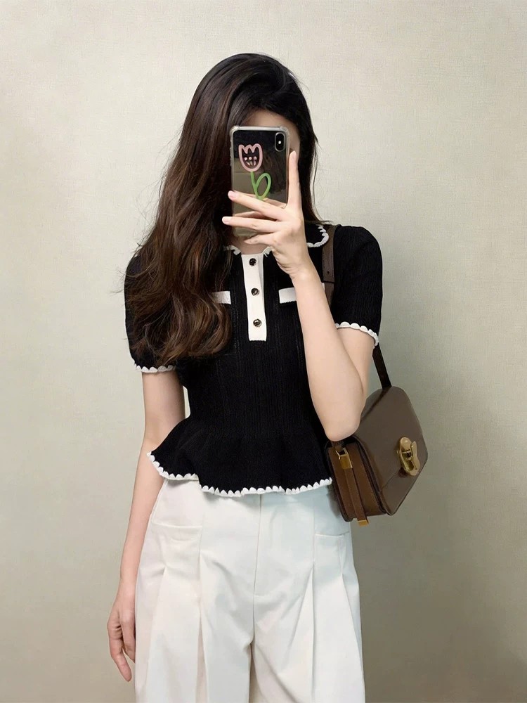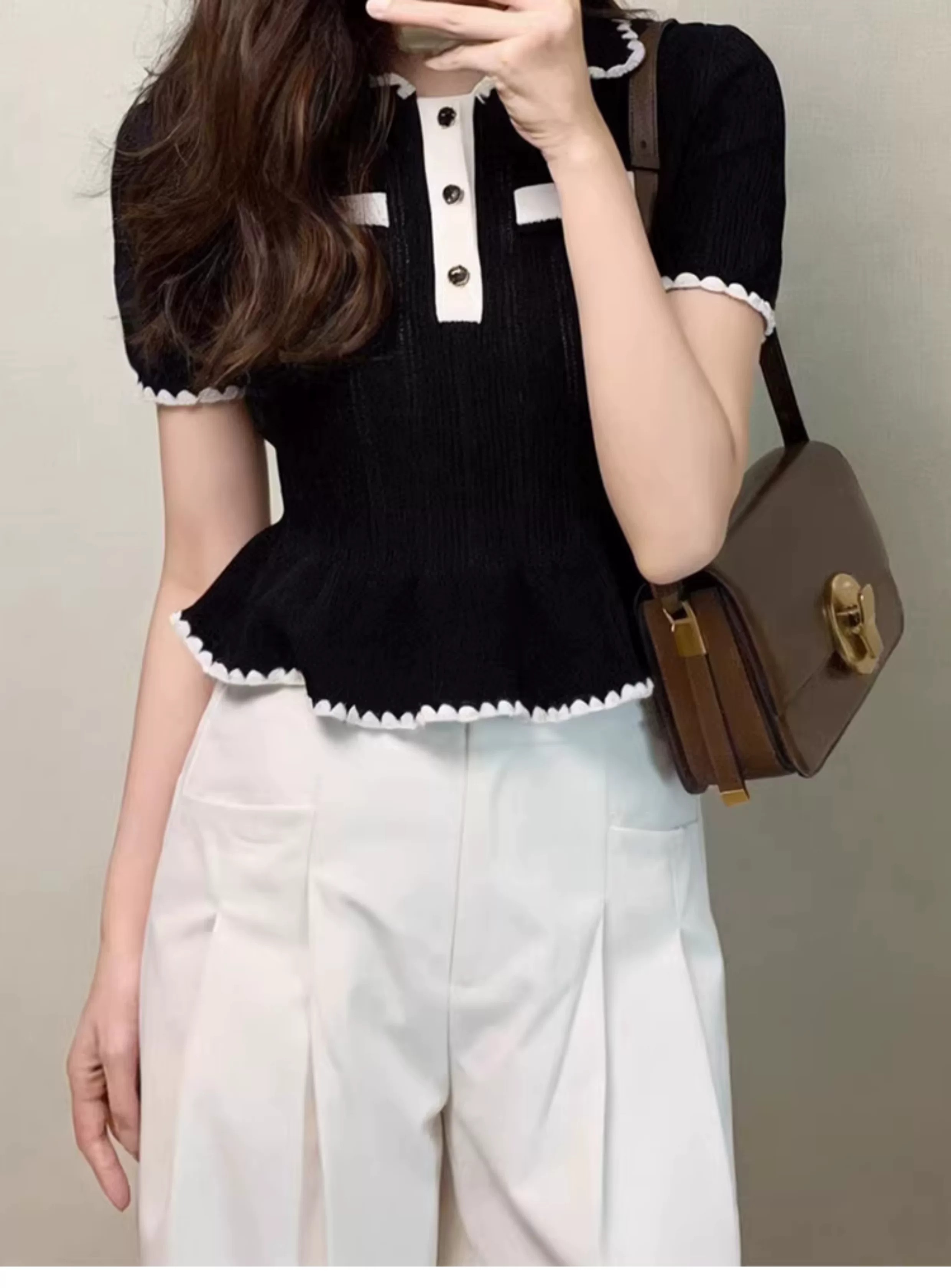 검정색 니트 반팔 티셔츠 여성 여름 드레스 2026 새로운 작은 키 쇼트 스타일 베이비 칼라 허리 수축 거품 소매 맨위
