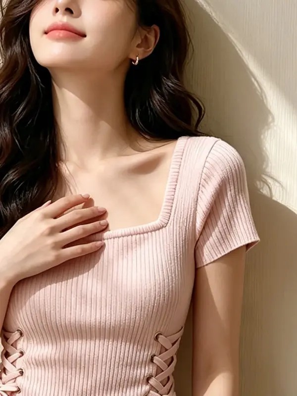 새로운 세련된 디자인 센스 작은 대중 티셔츠 여름 라운드 넥 반팔 다용도 맨위 여성 작은 키 니트 스웨터