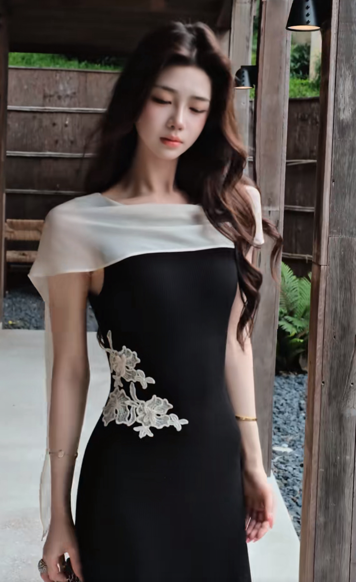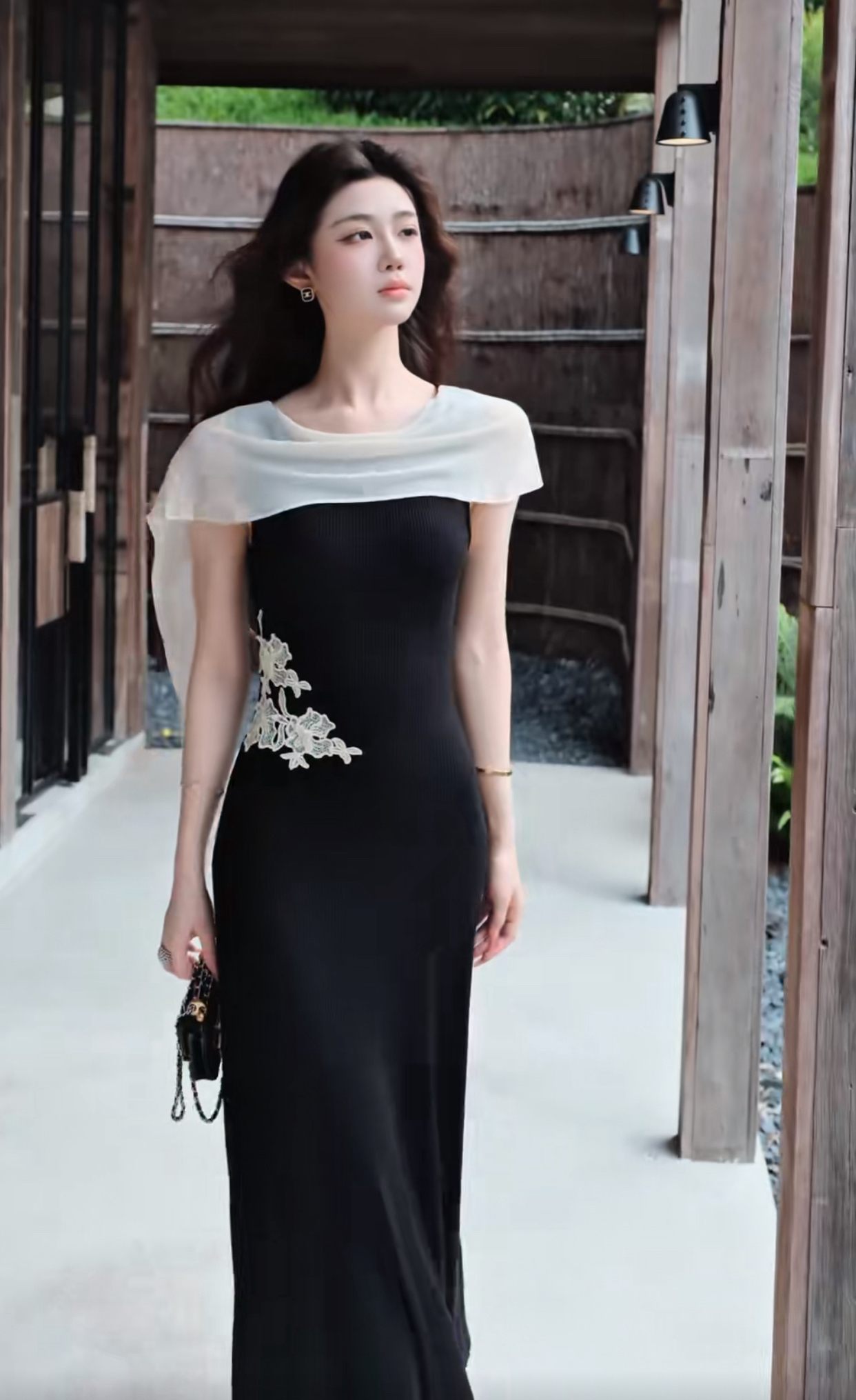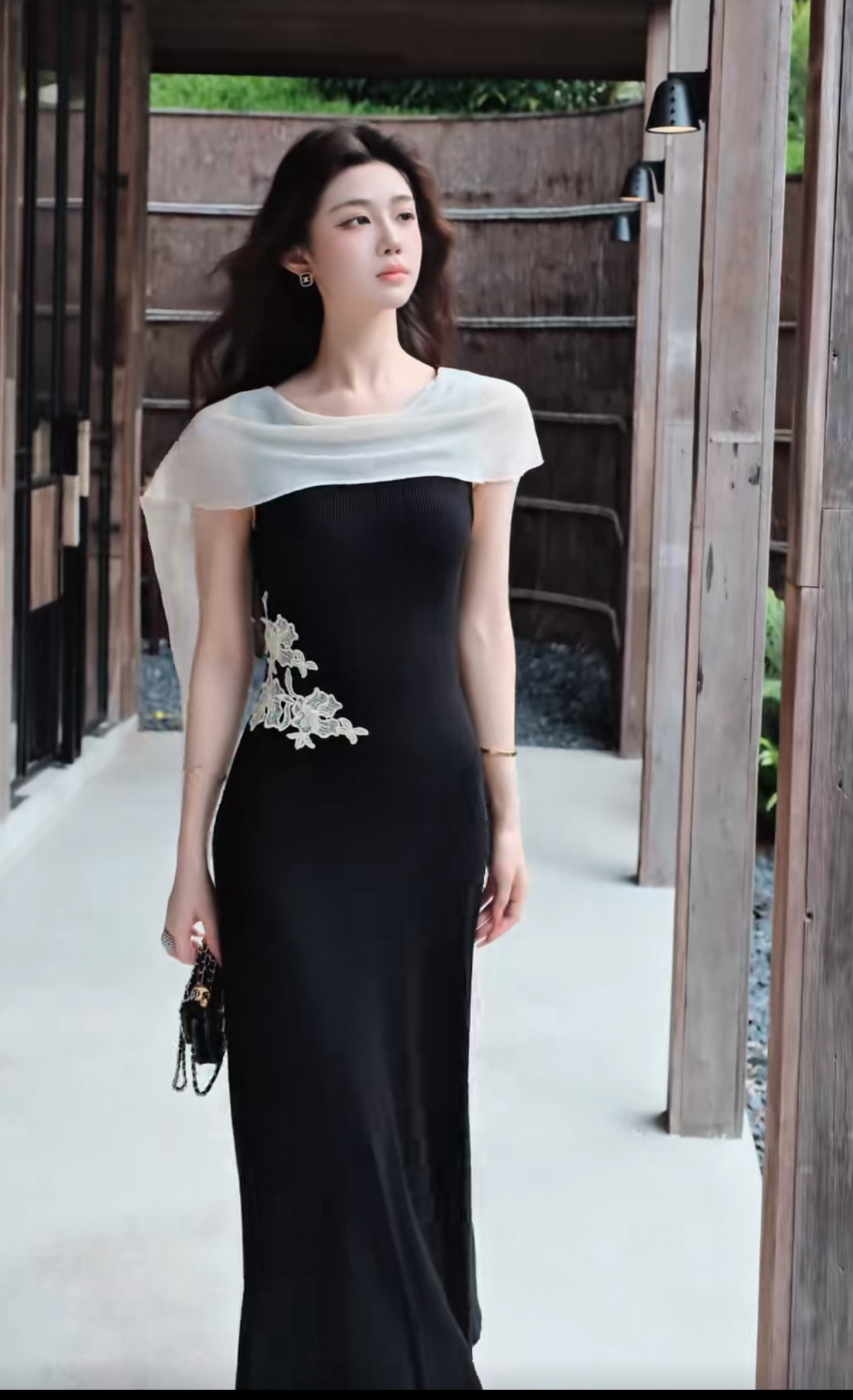무쯔리 목자이 ~ 중 리 잉크 켜기 서리 꽃 품격 분위기 센스 홀로우 아웃 꽃 패치워크 새로운 중식 드레스
