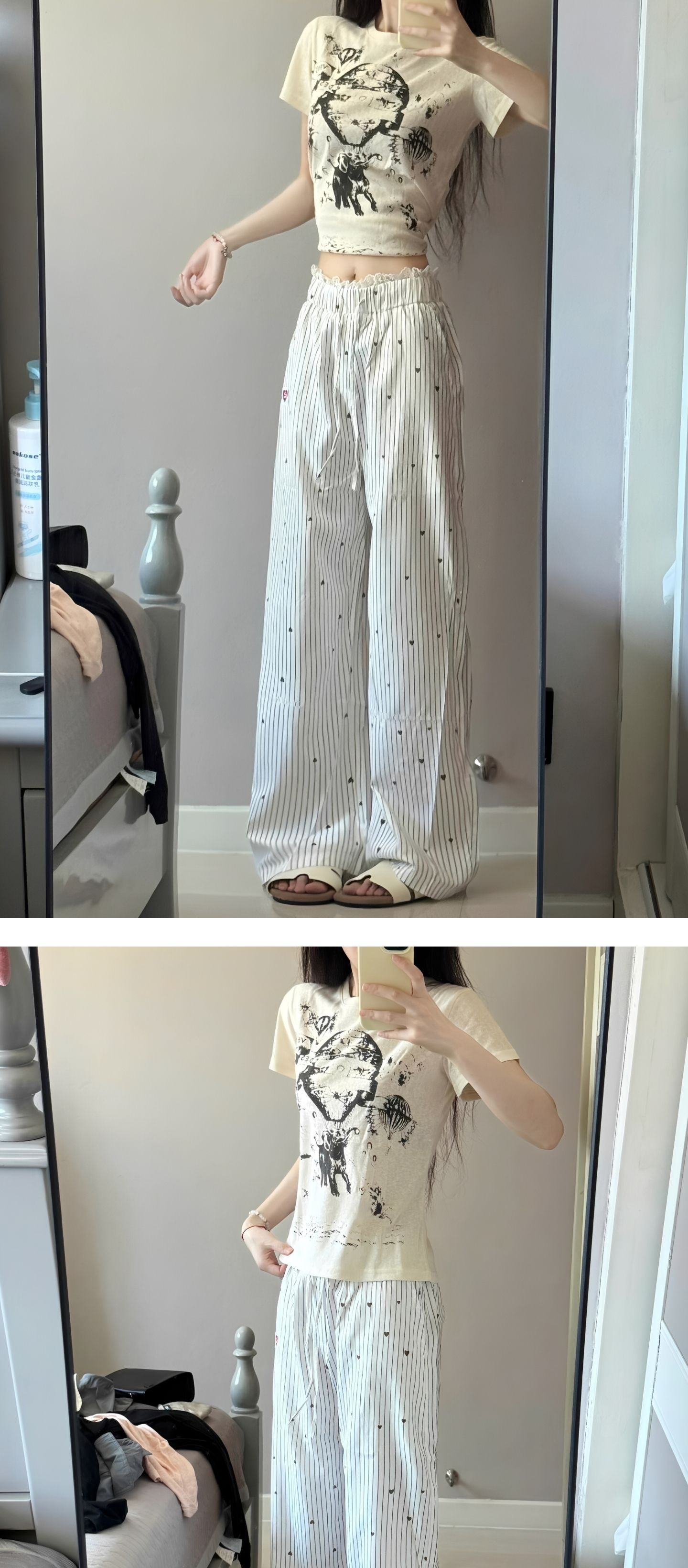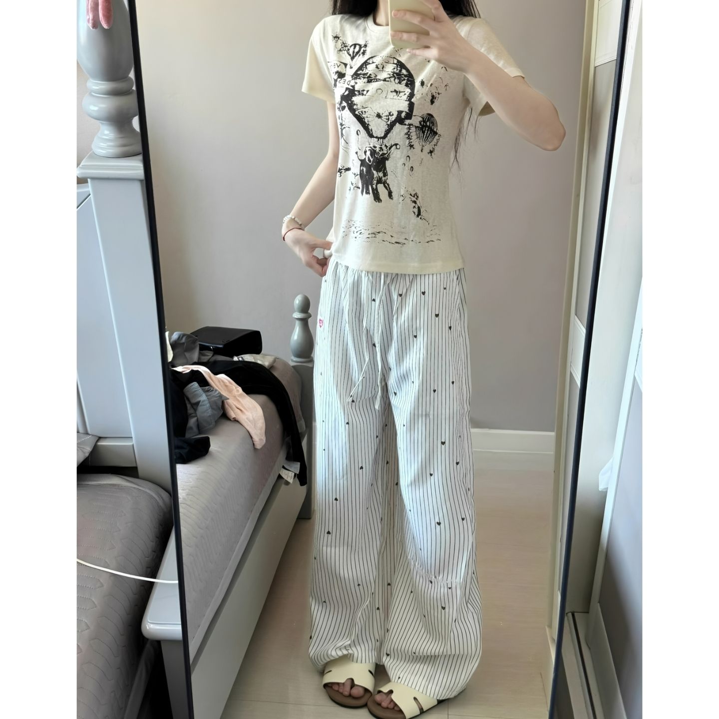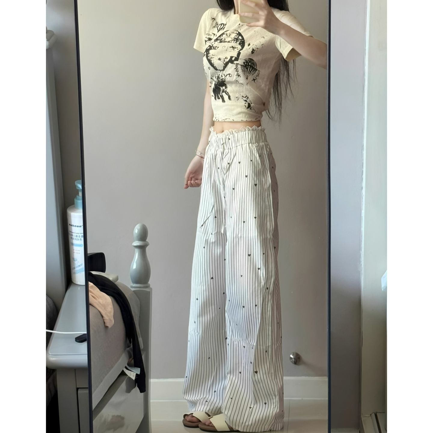 원본 원단 레이스 조각 스트라이프 와이드 레그 팬츠 여름 루즈핏 느긋한 바람 롱 바지 트렌디 ins