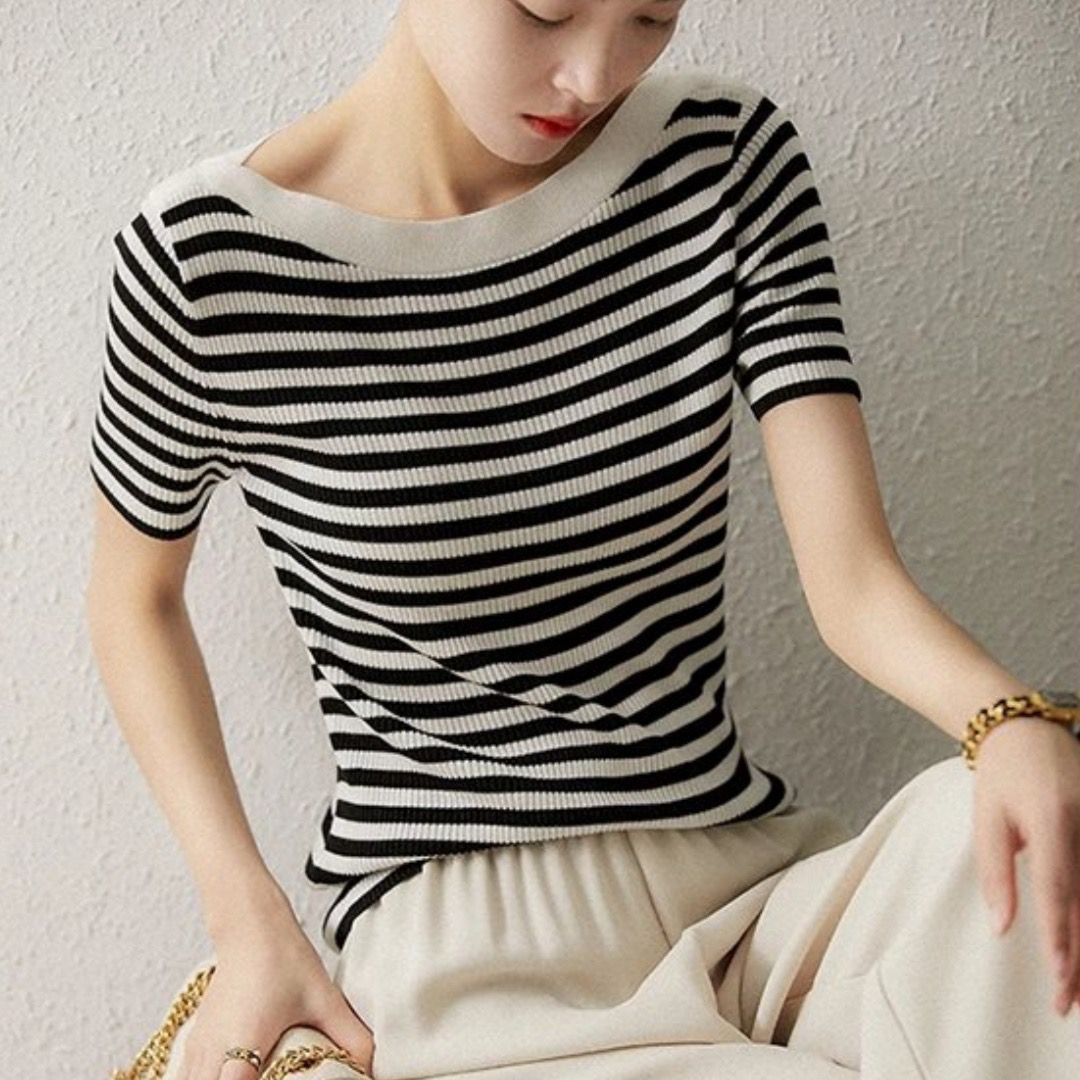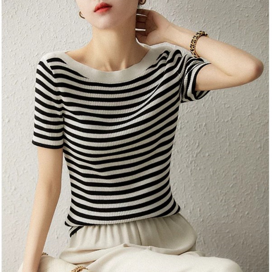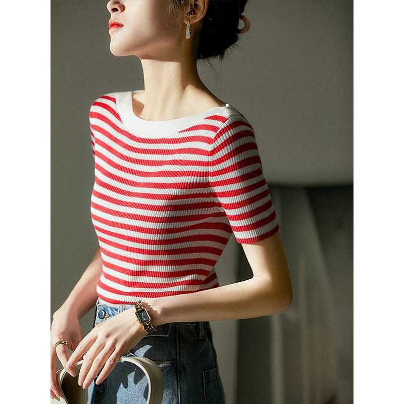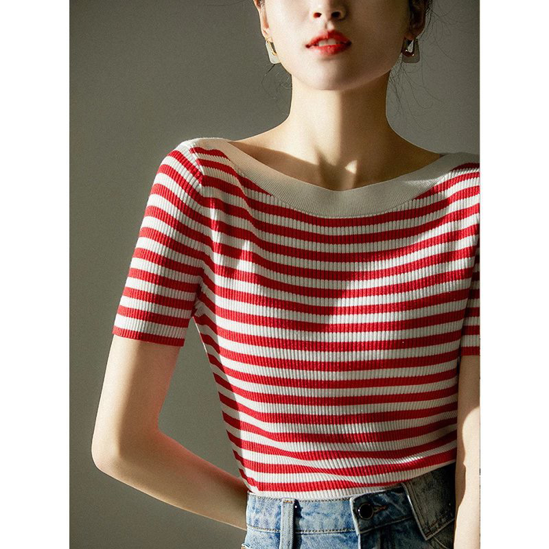 봄 여름 새로운 레트로 스타일 얼음 실크 니트 스웨터 프랑스식 디자인 센스 보트넥 스트라이프 반팔 여성 티셔츠