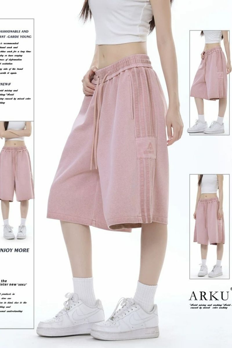 280g 남자 바 면 원본 것 측면 스트라이프 운동 반바지 여성 여름 루즈핏 넓은 다리 스트레이트 5 점 바지