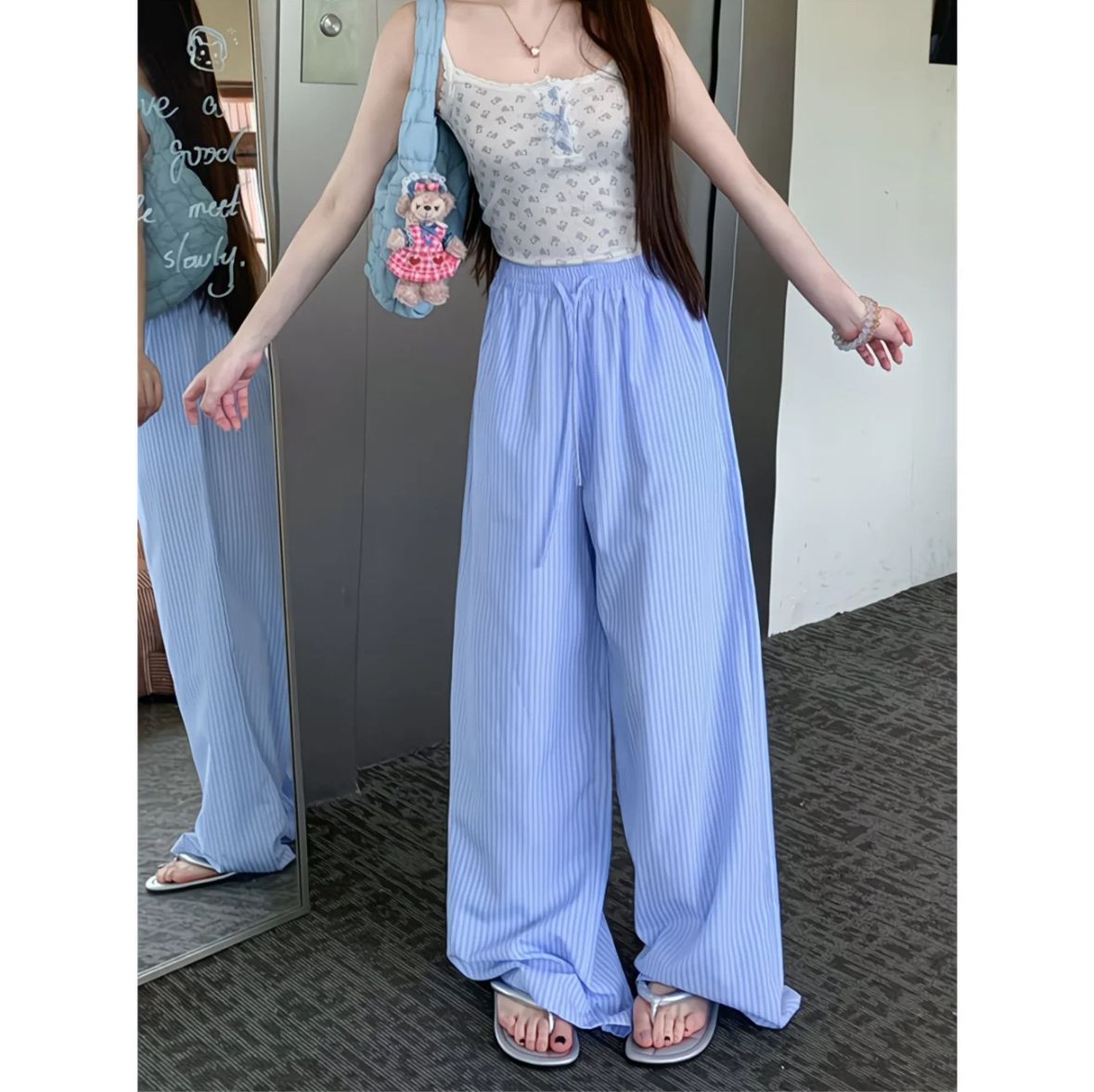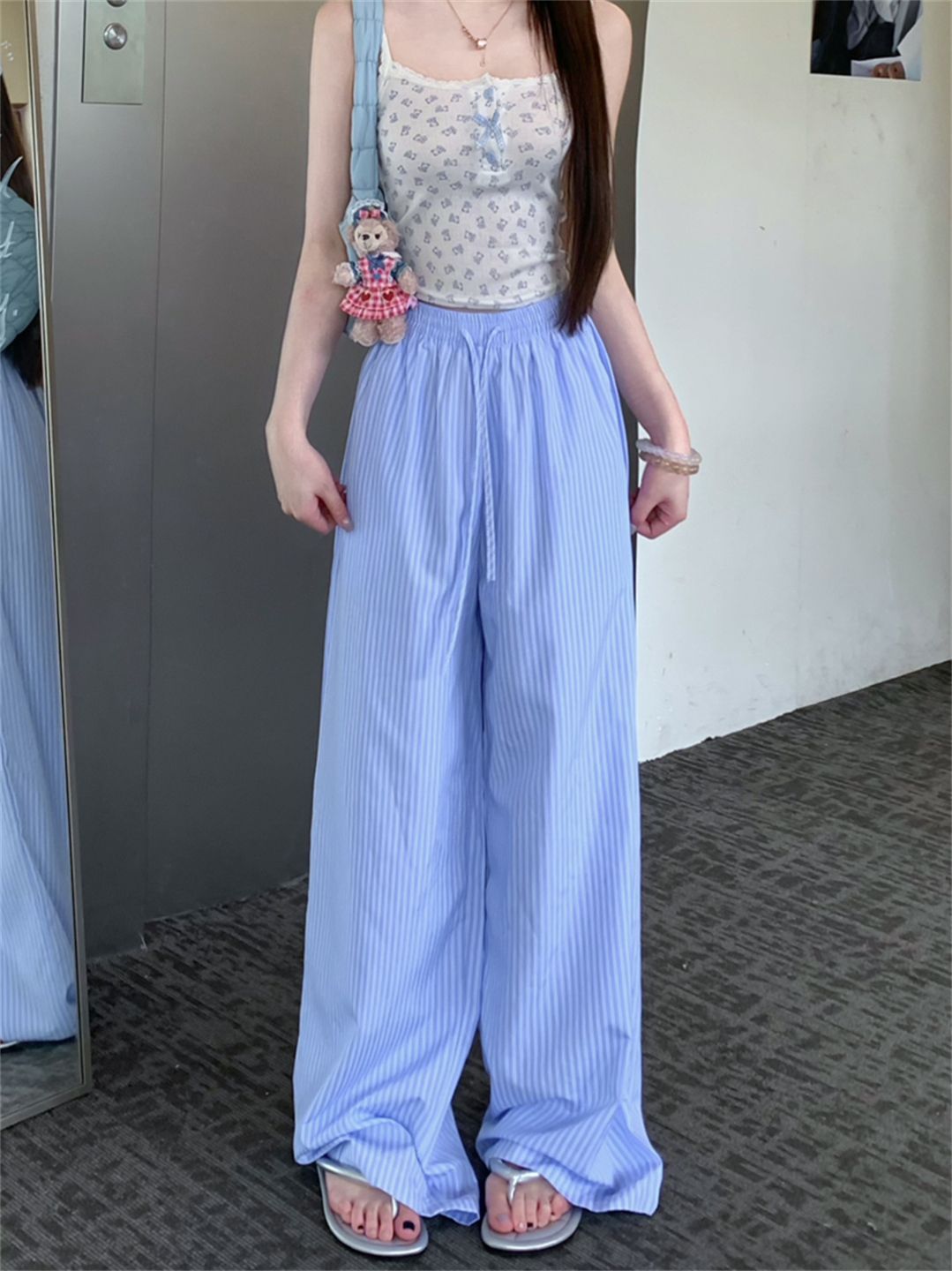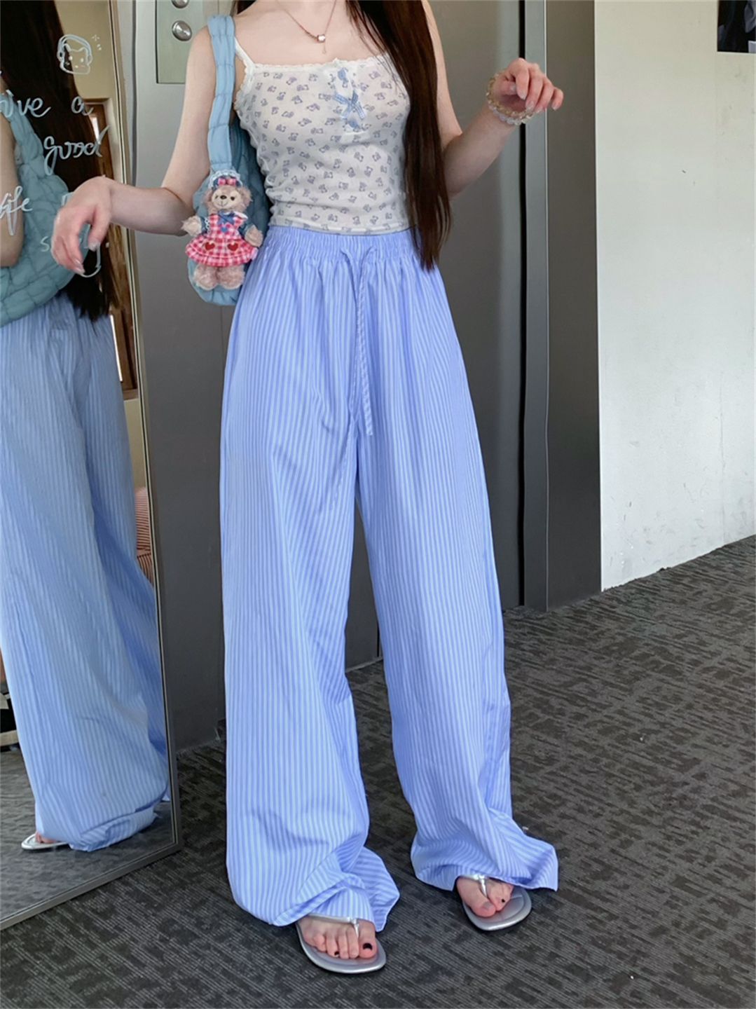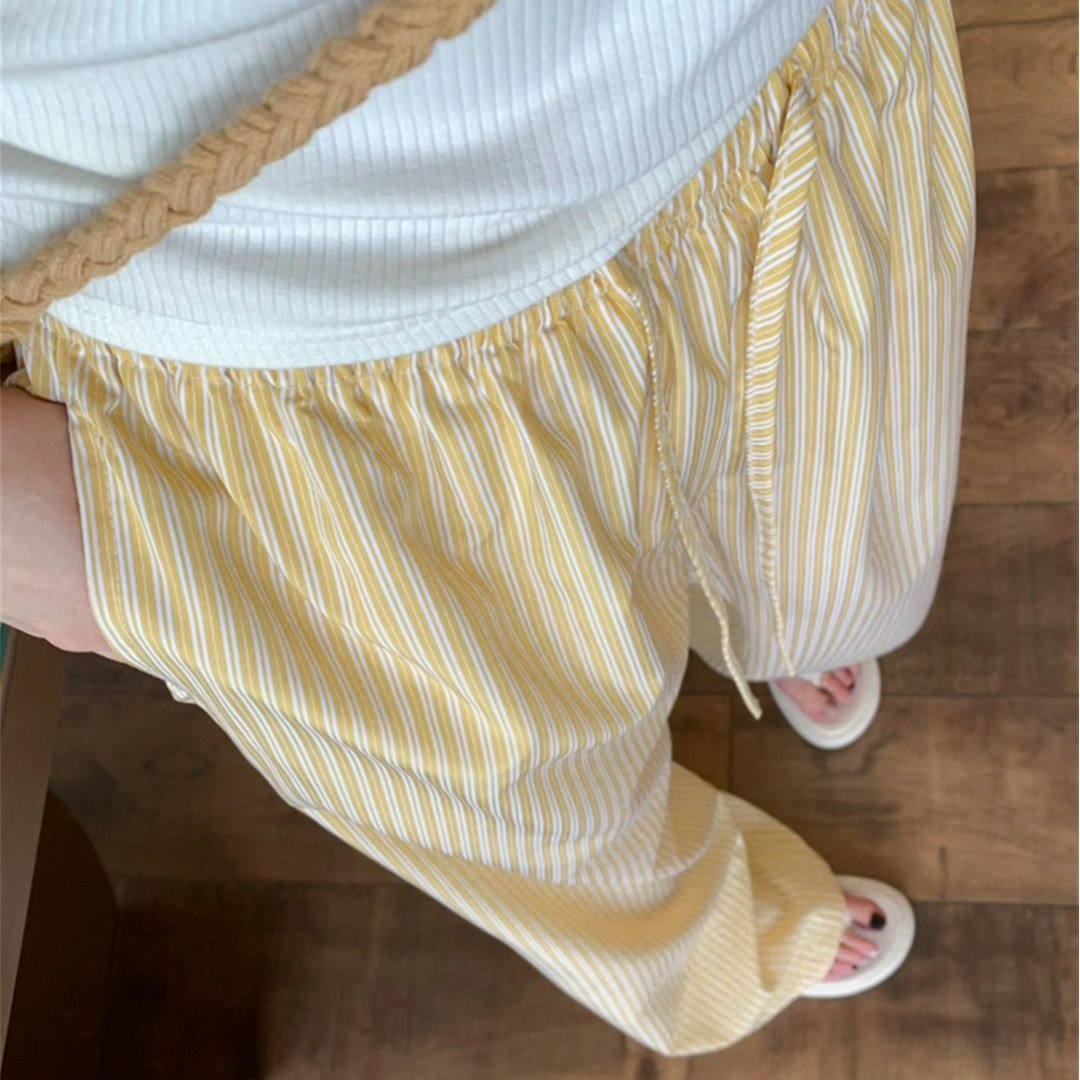 높은 품질 원본 원본 천 파란색과 흰색 스트라이프 여름 얇은 스타일 루즈핏 느긋한 센스 펌프 로프 캐주얼 바지