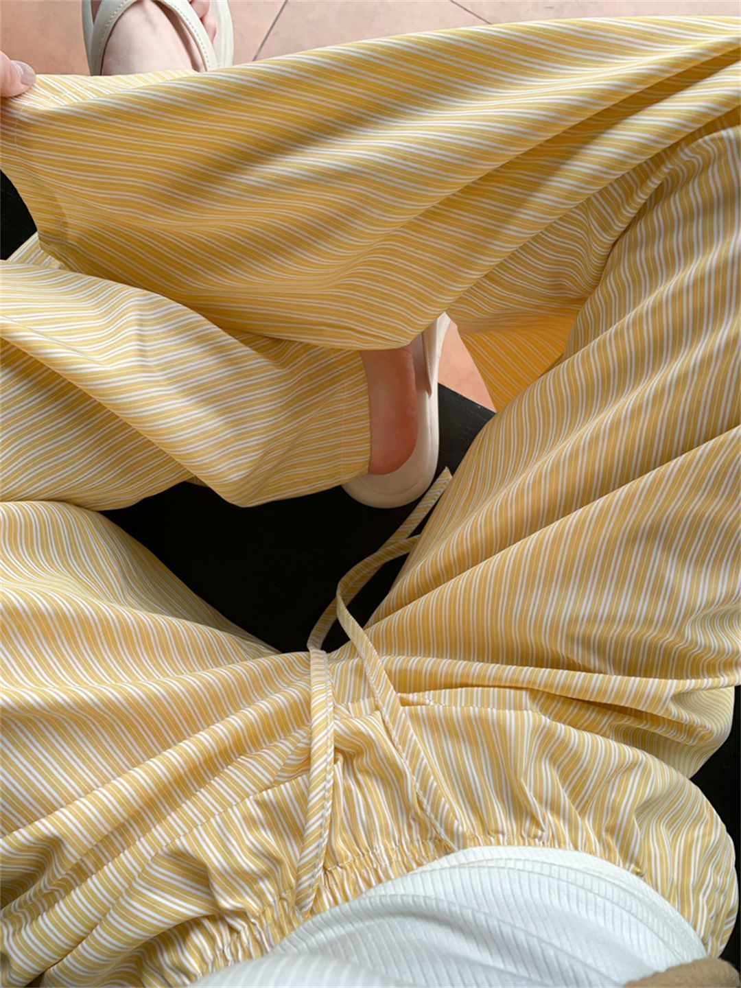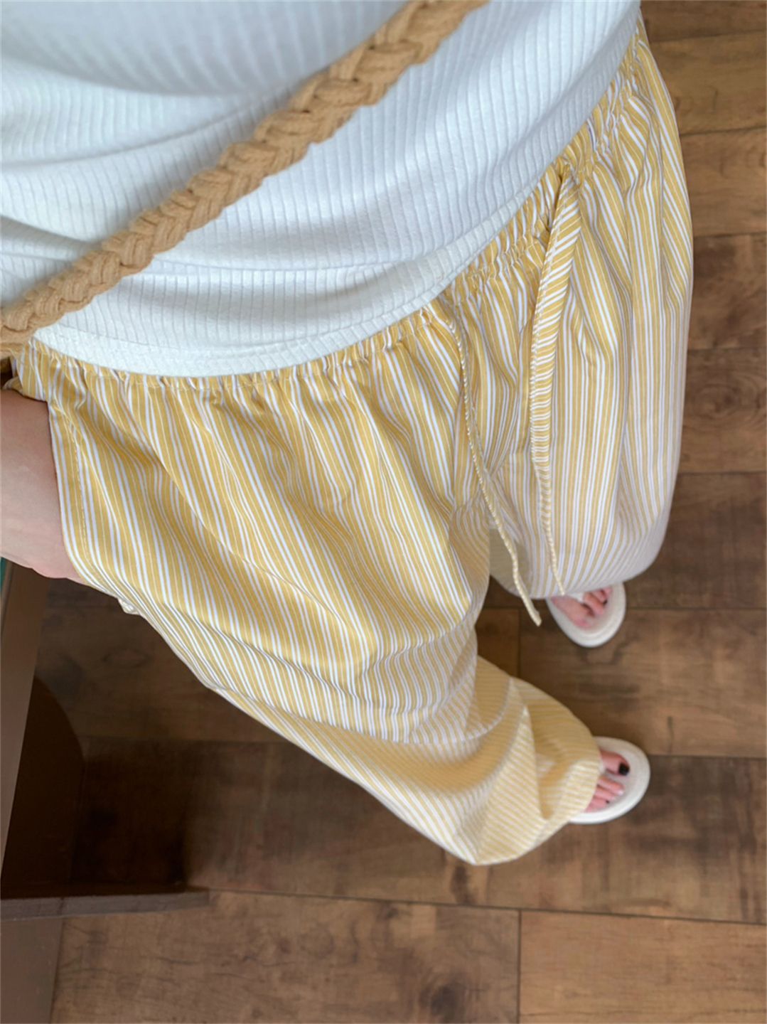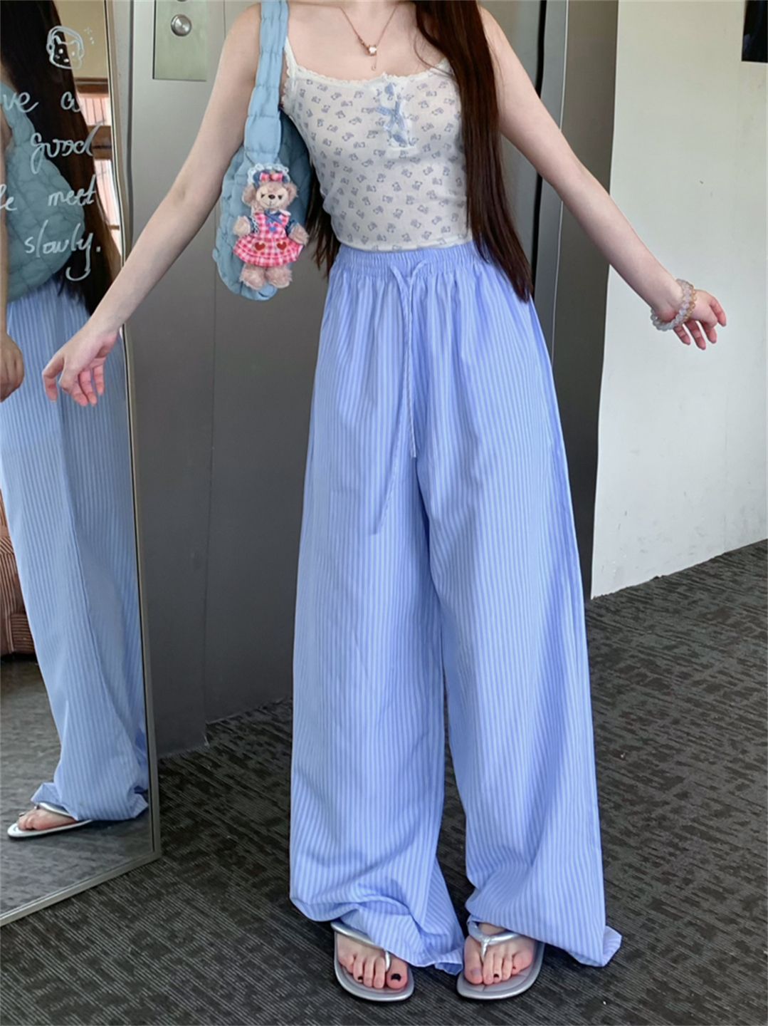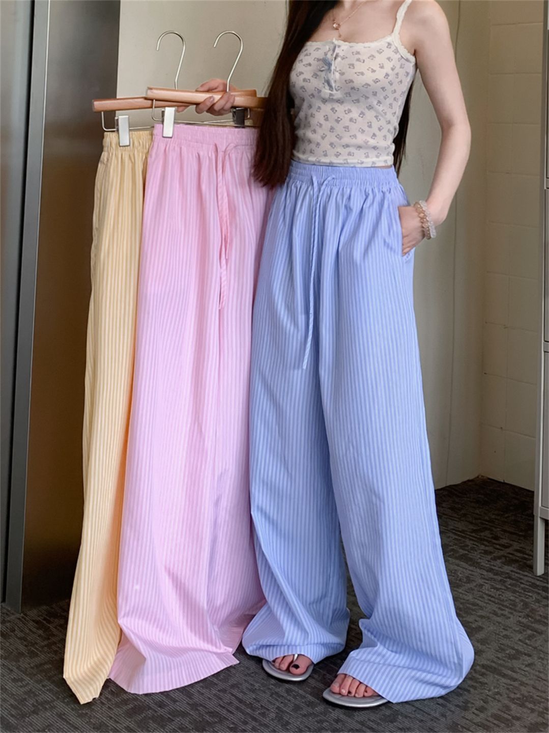 높은 품질 원본 원본 천 파란색과 흰색 스트라이프 여름 얇은 스타일 루즈핏 느긋한 센스 펌프 로프 캐주얼 바지