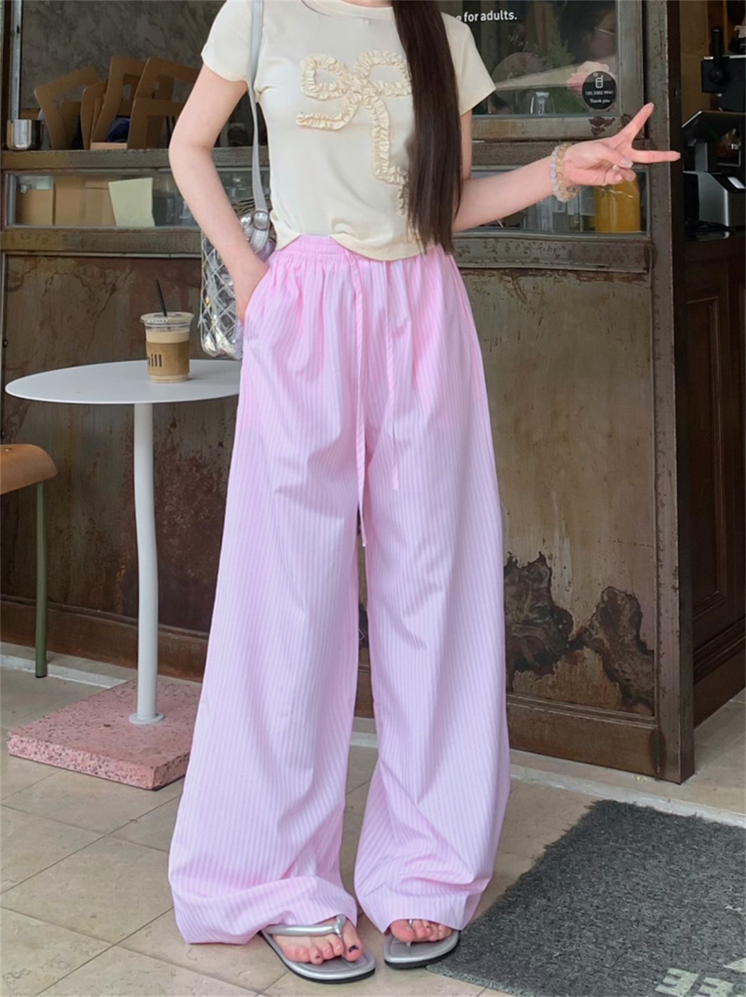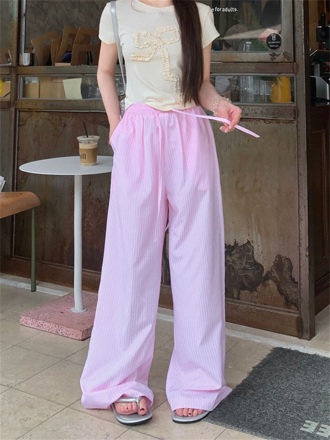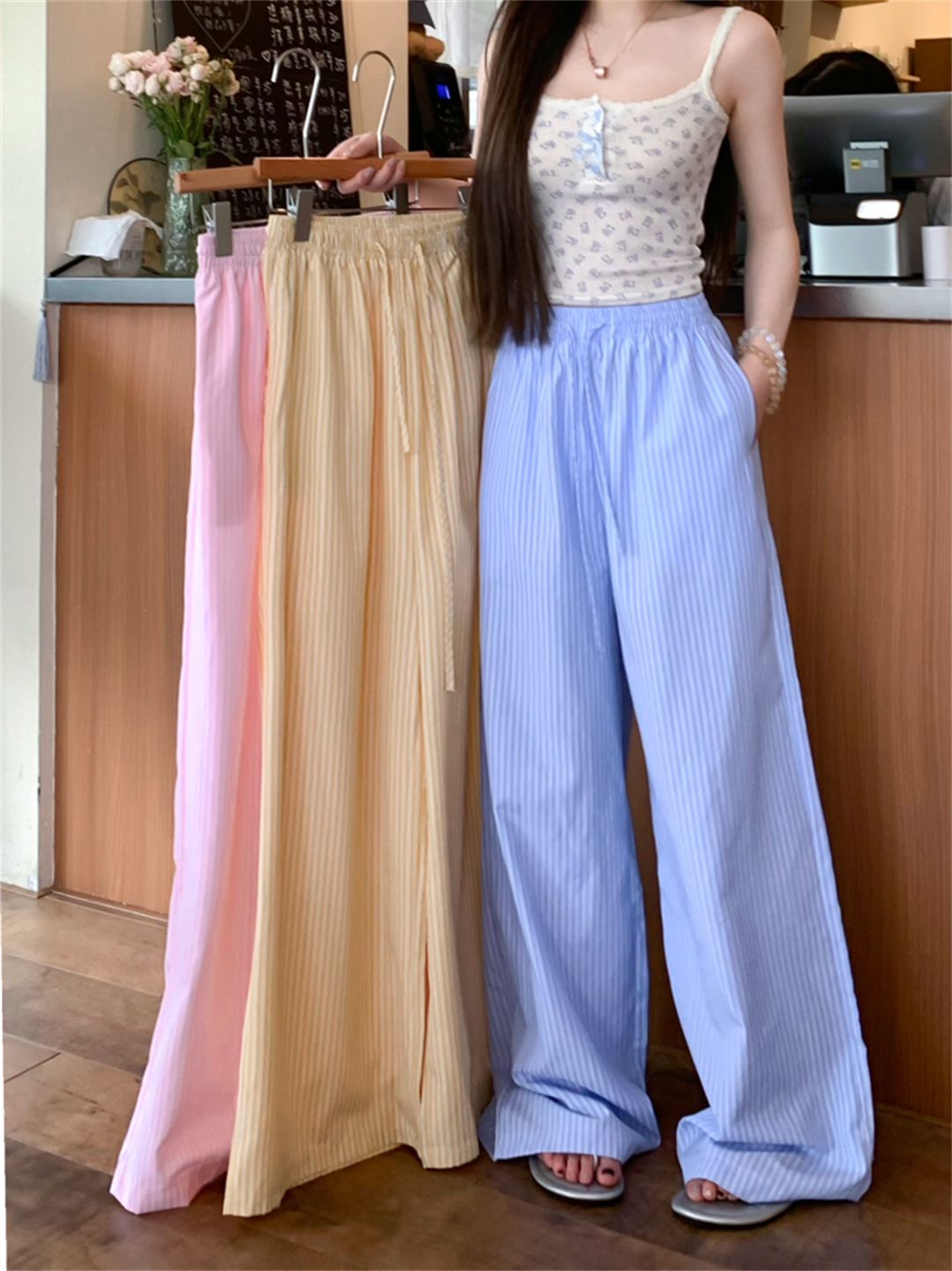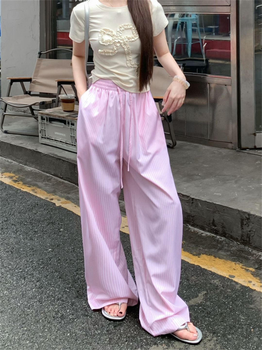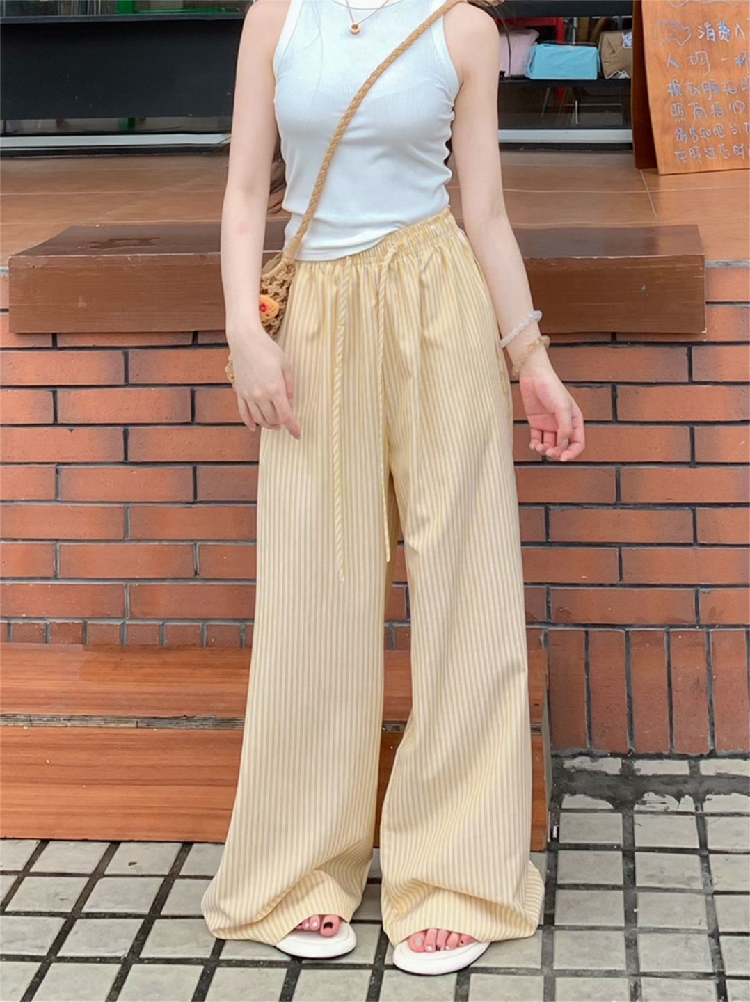 원본 원단 레이스 조각 스트라이프 와이드 레그 팬츠 여름 루즈핏 느긋한 바람 롱 바지 트렌디 ins