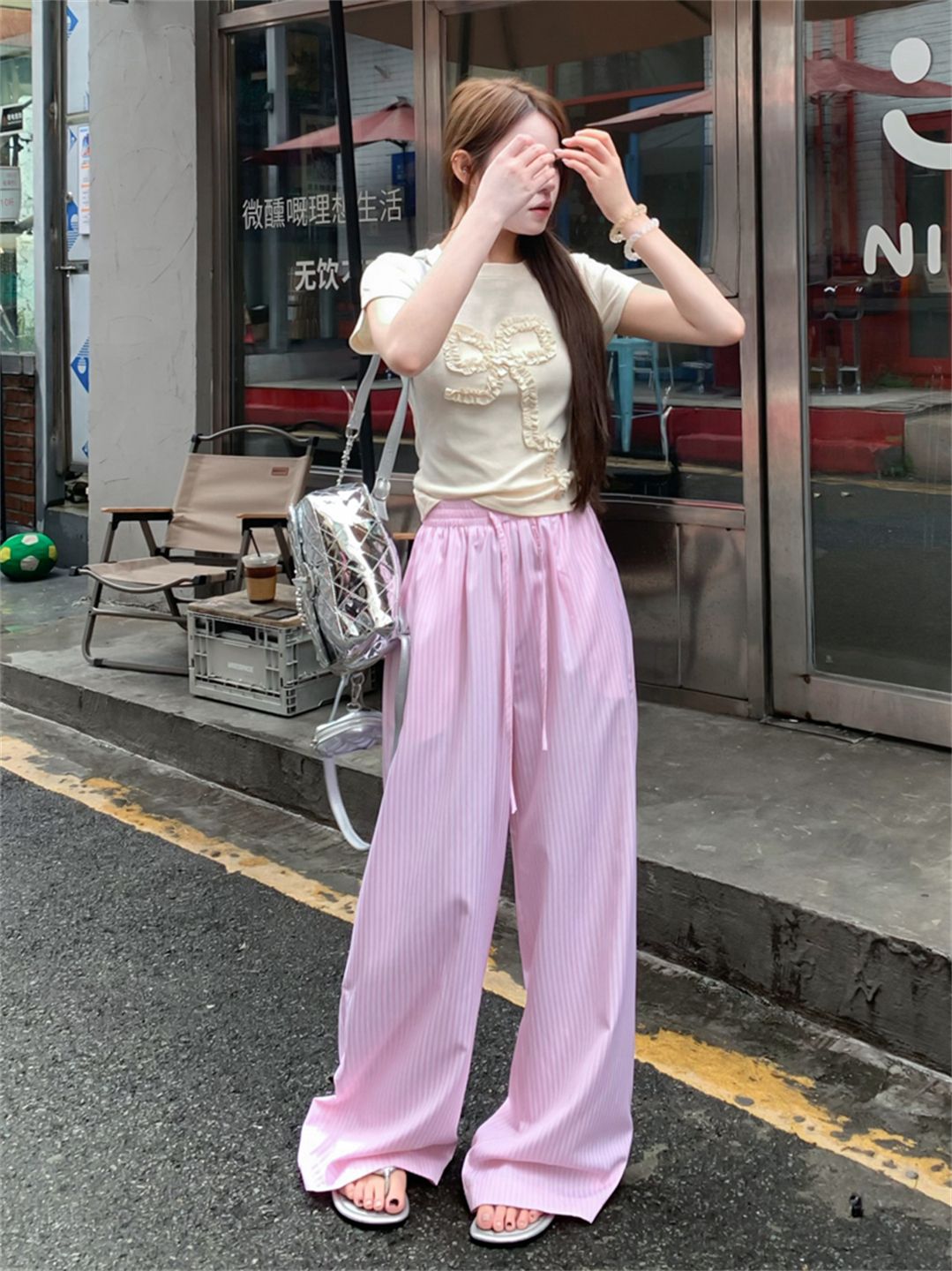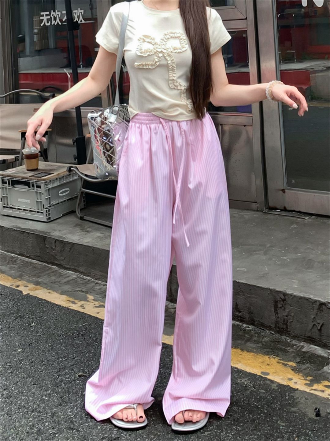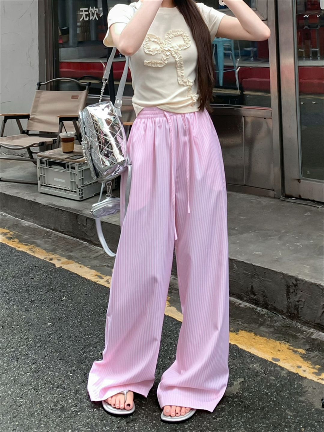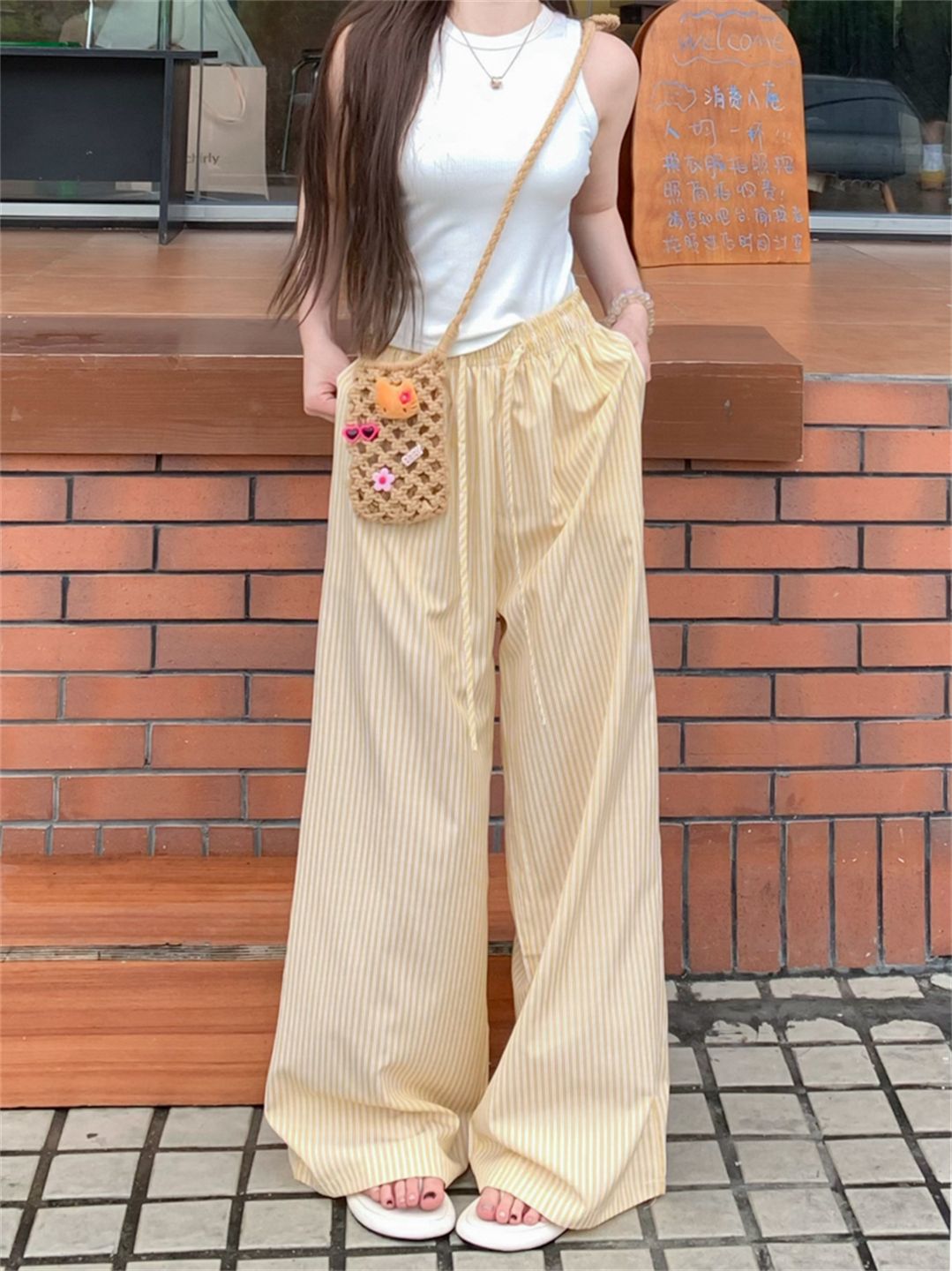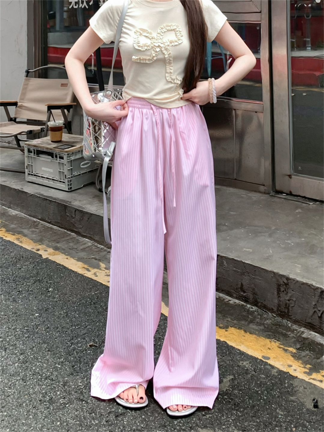 원본 원단 레이스 조각 스트라이프 와이드 레그 팬츠 여름 루즈핏 느긋한 바람 롱 바지 트렌디 ins