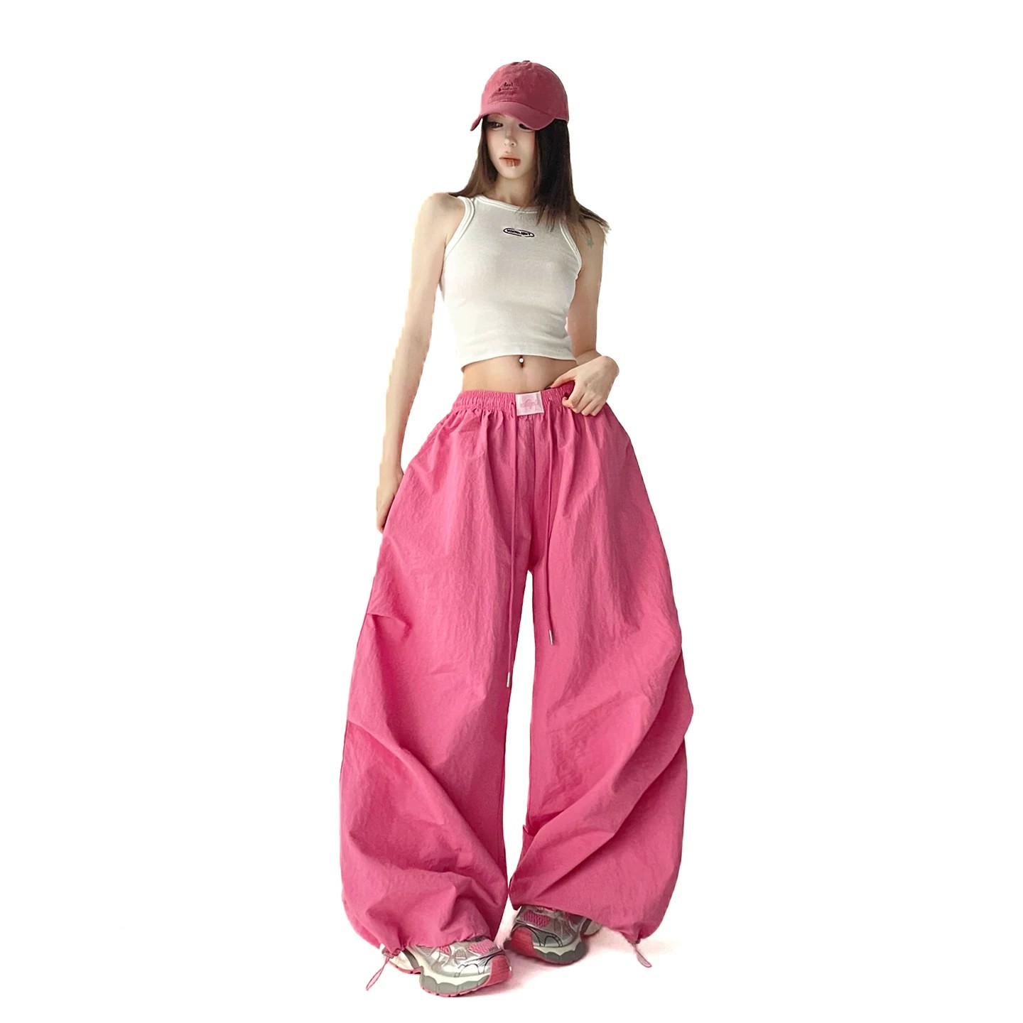 핑크색 춤추기 다용도 와이드 레깅스 바지 2026 봄 드레스 새로운 재즈 슬림해 보이는 주름 넓은 다리 캐주얼 낙하산 병 바지