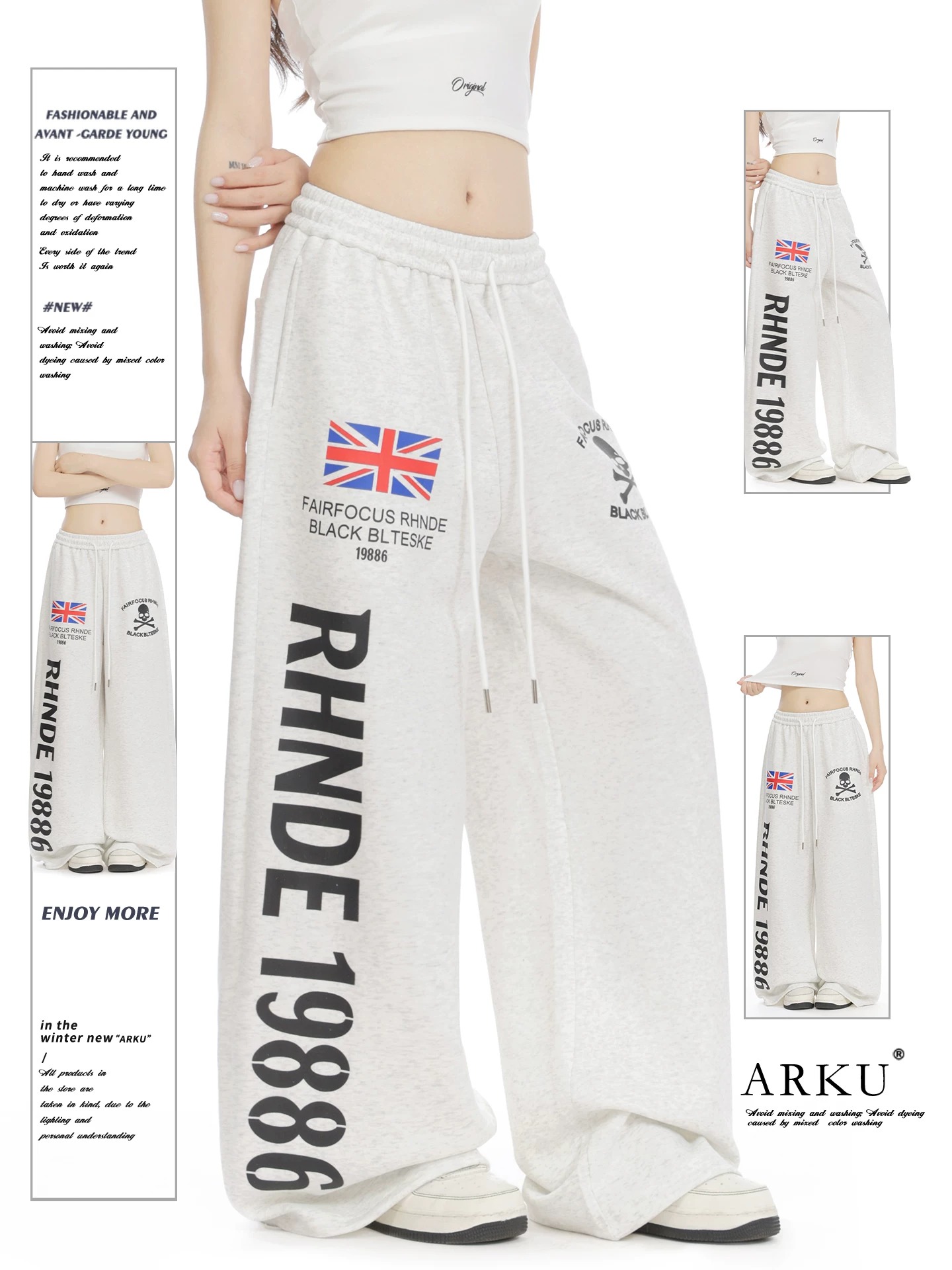 아메리칸 알파벳 배너 프린트 운동 웨이 바지 여성 루즈핏 느긋한 도루 센스 다용도 넓은 다리 스트레이트 캐주얼 바지
