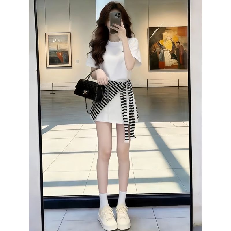 여름 운동 패션 세트 여성 느긋한 바람 스트라이프 숄 루즈핏 반팔 티셔츠 하이웨이스트 짧은 치마바지 3종 세트