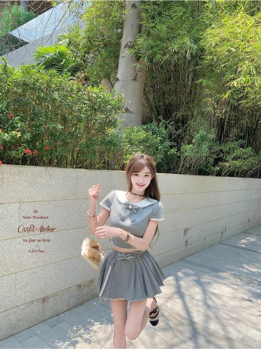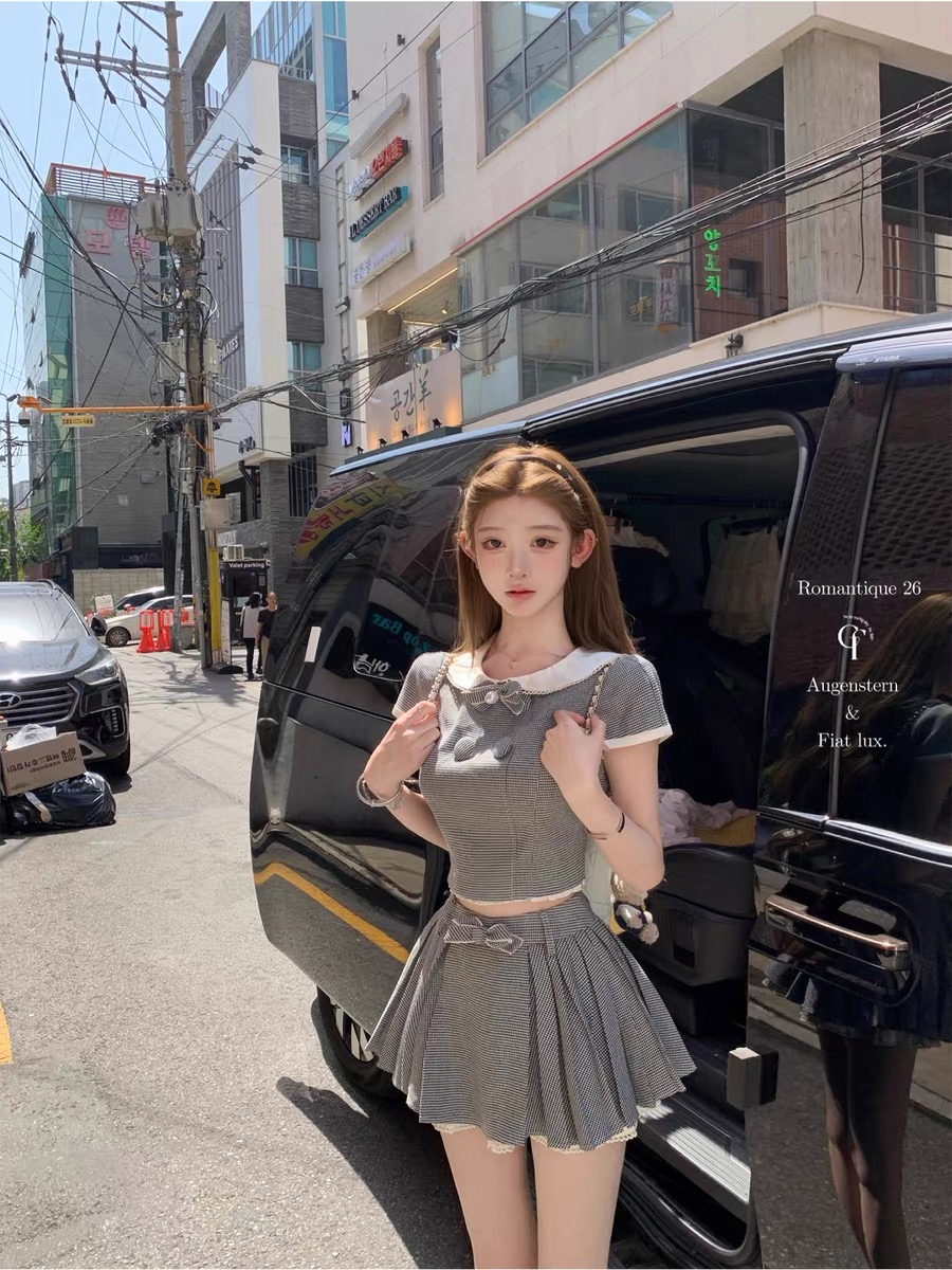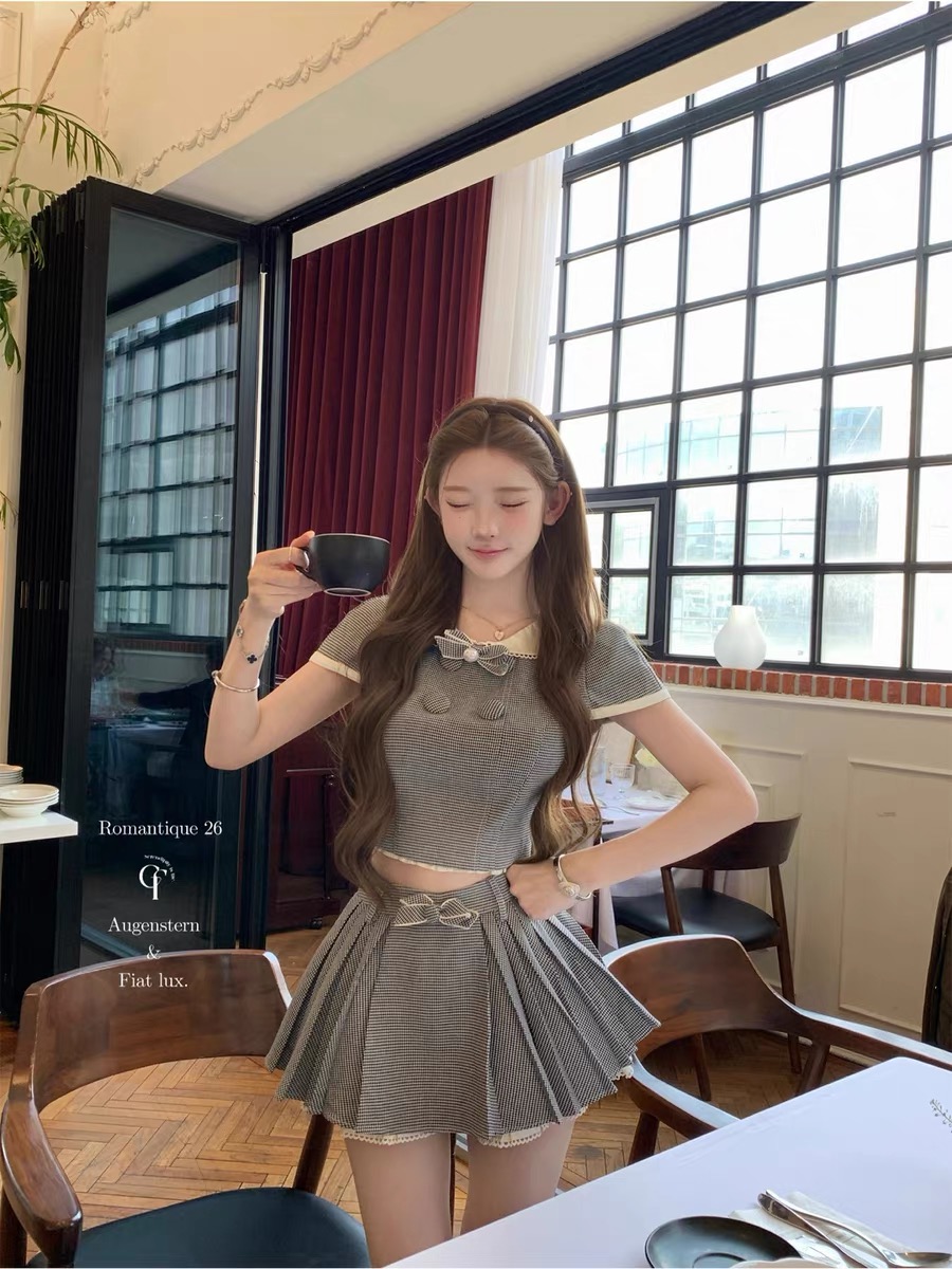 늦게 우산 우산 26 ss 오동 꽃 오래된 언어 배색 피터 팬 칼라 하운드투스 체크 이중 버튼 맨위 반 스커트 세트 그룹