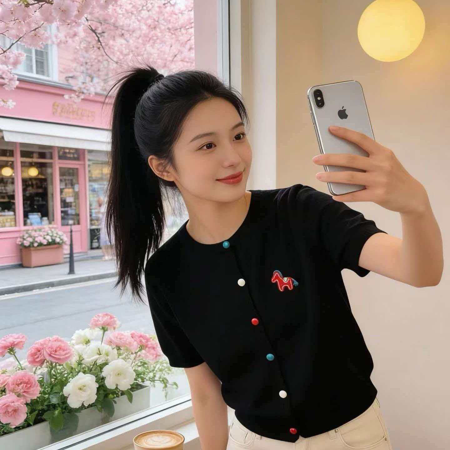 디자인 센스 단색 반팔 니트 스웨터 여성 2026 년 여름 새로운 한국 스타일 싱글 줄 버튼 슬림해 보이는 패션 맨위