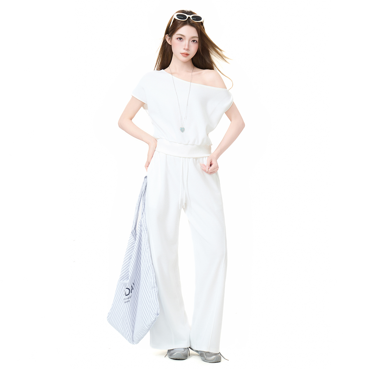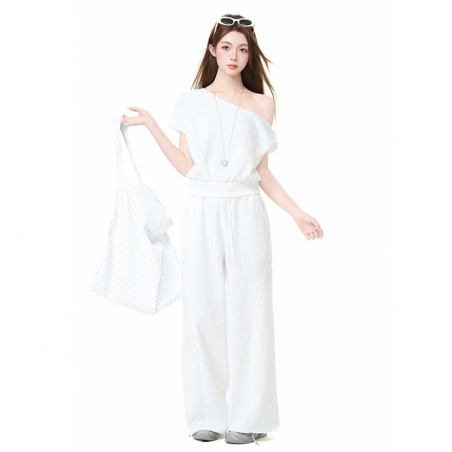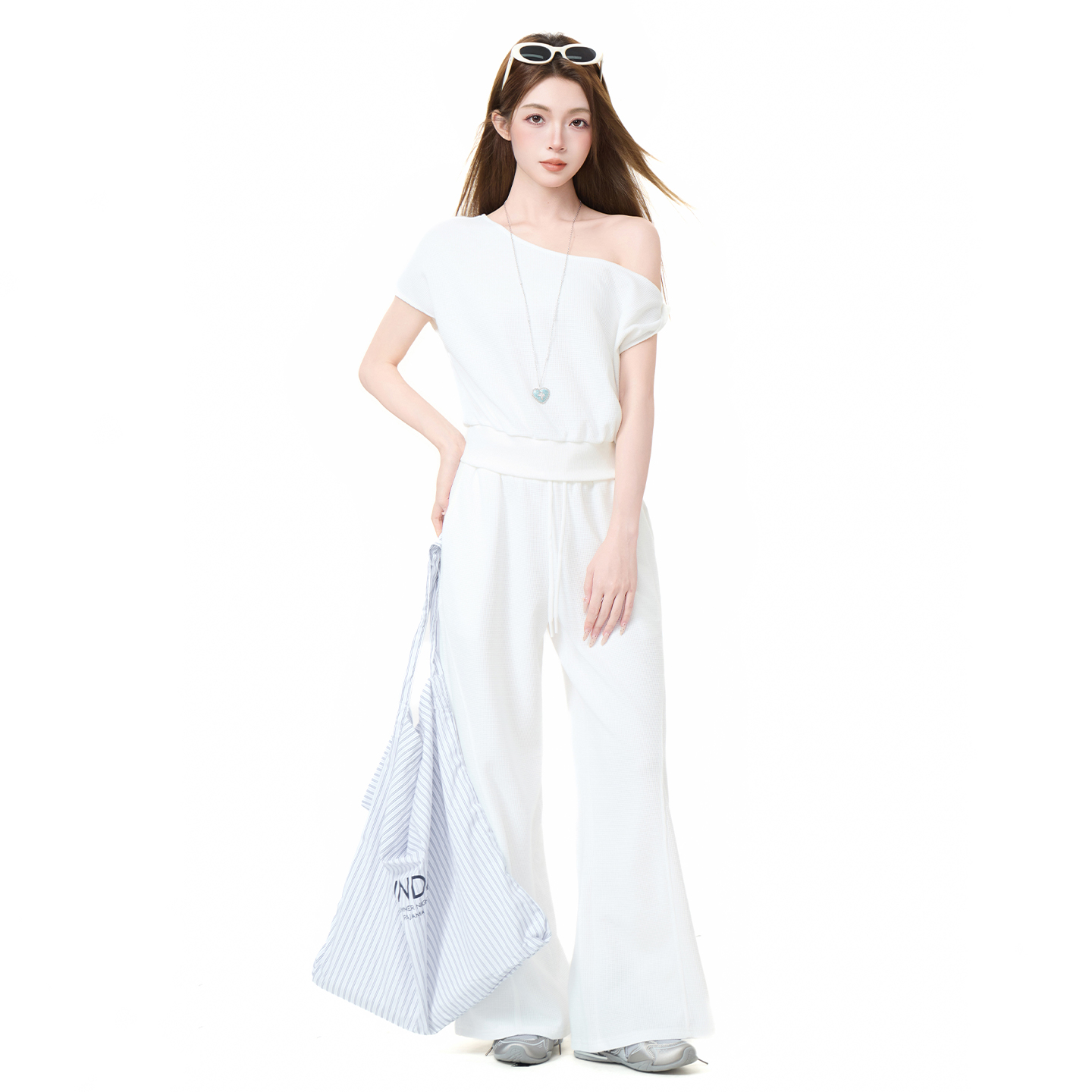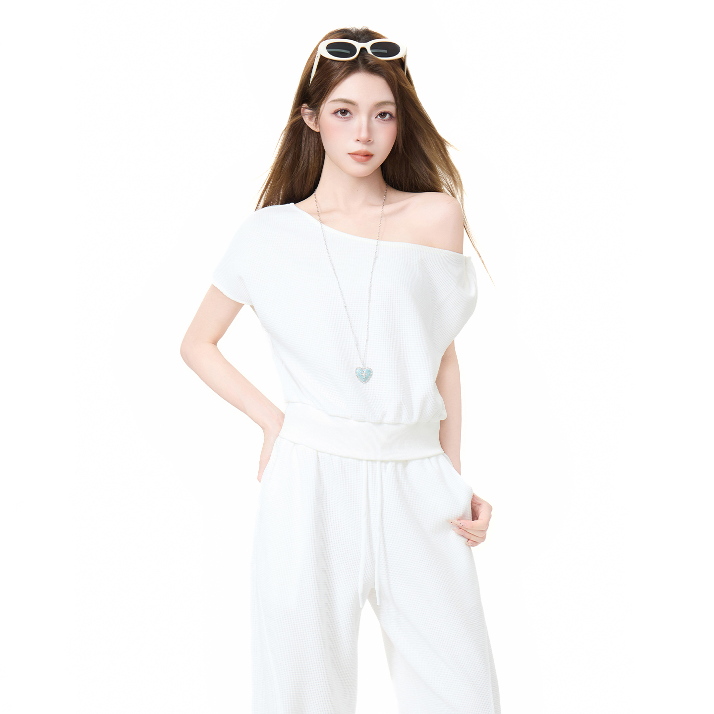 실사 정가 비스듬한 칼라 오프숄더 핫걸 반팔 티셔츠 스트레이트 캐주얼 와이드 레깅스 바지 여름 새로운 패션 세트