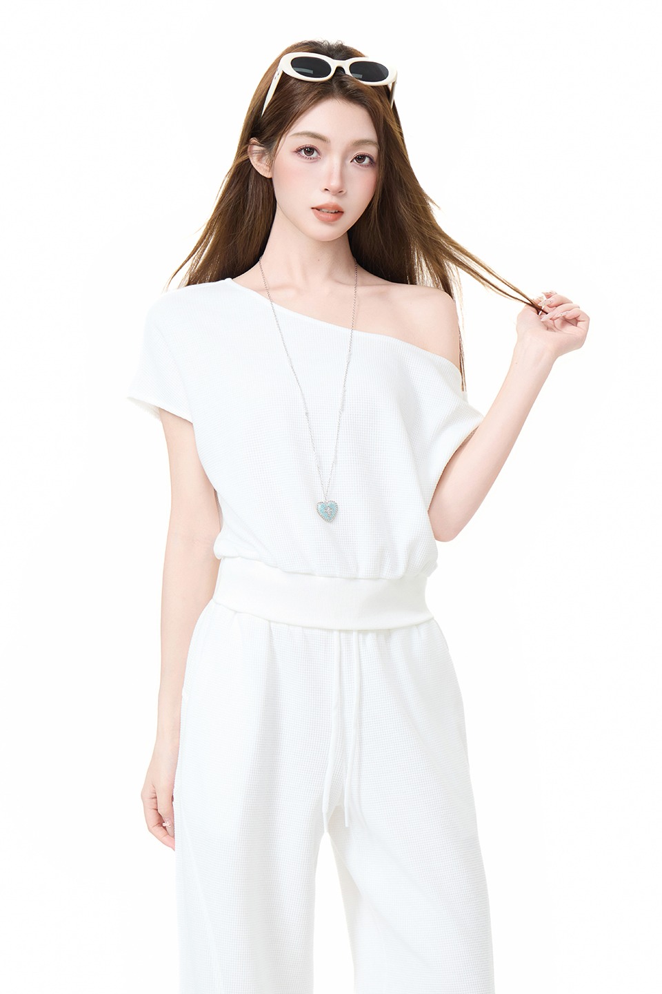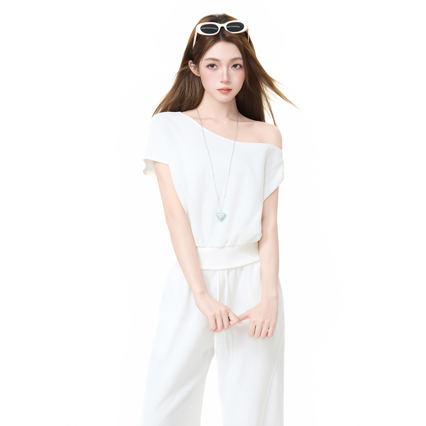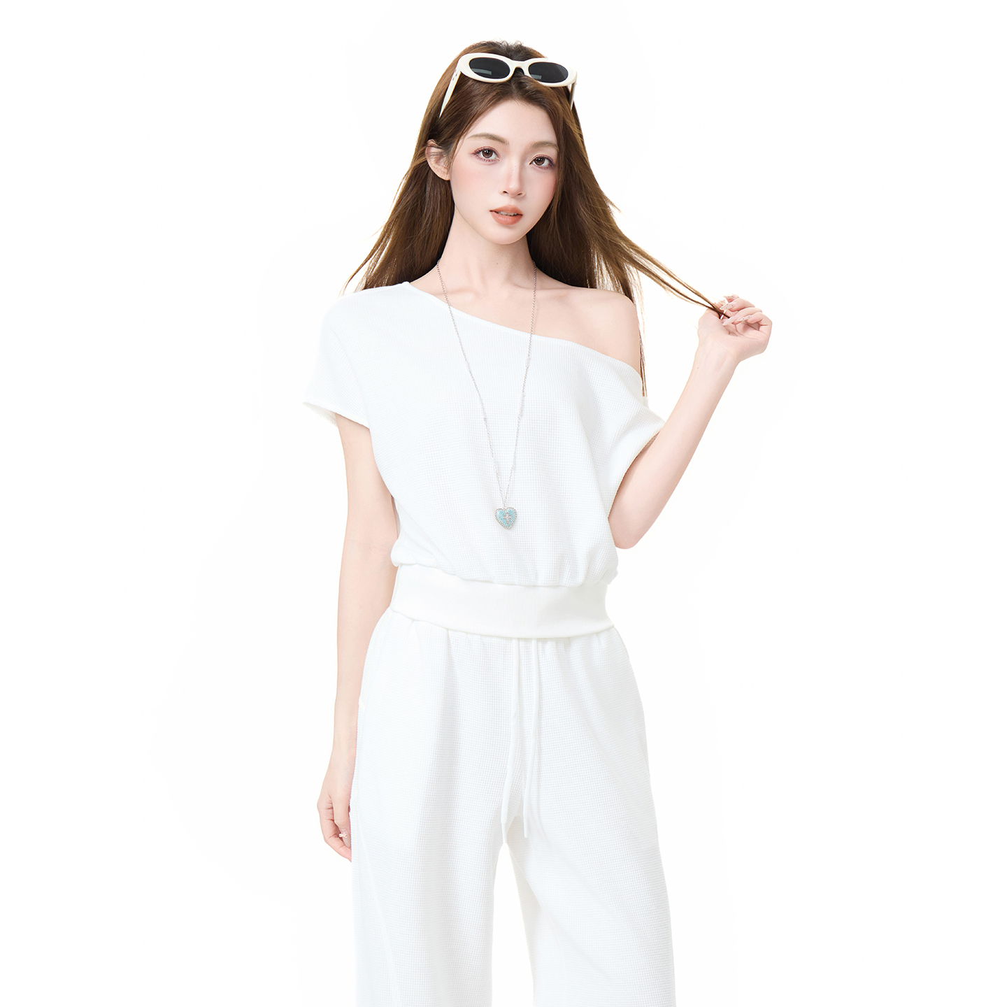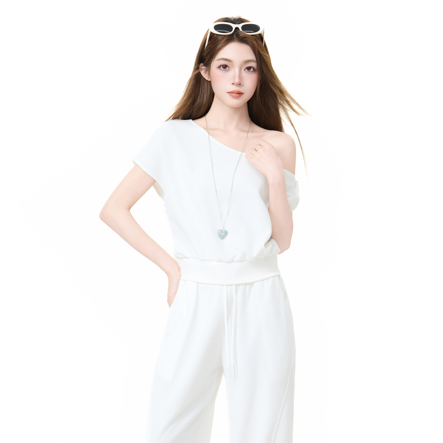 실사 정가 비스듬한 칼라 오프숄더 핫걸 반팔 티셔츠 스트레이트 캐주얼 와이드 레깅스 바지 여름 새로운 패션 세트