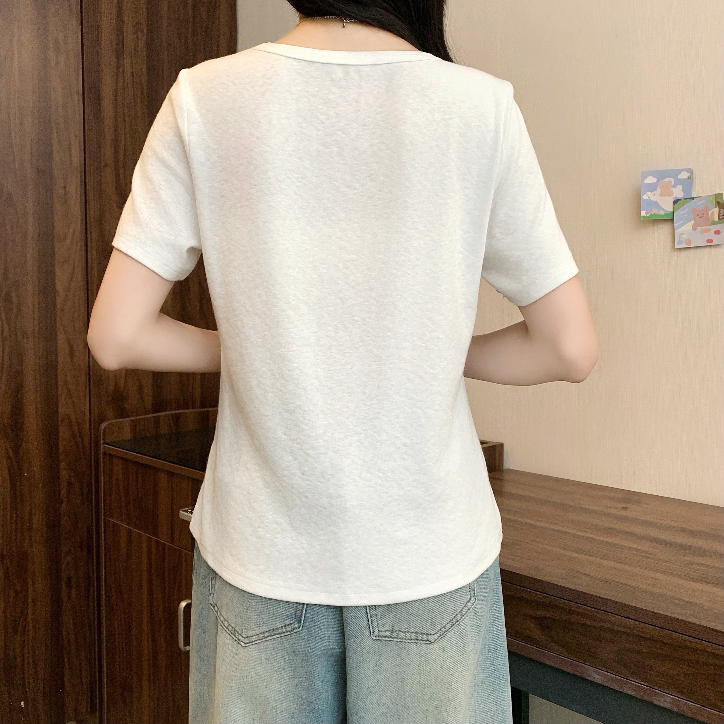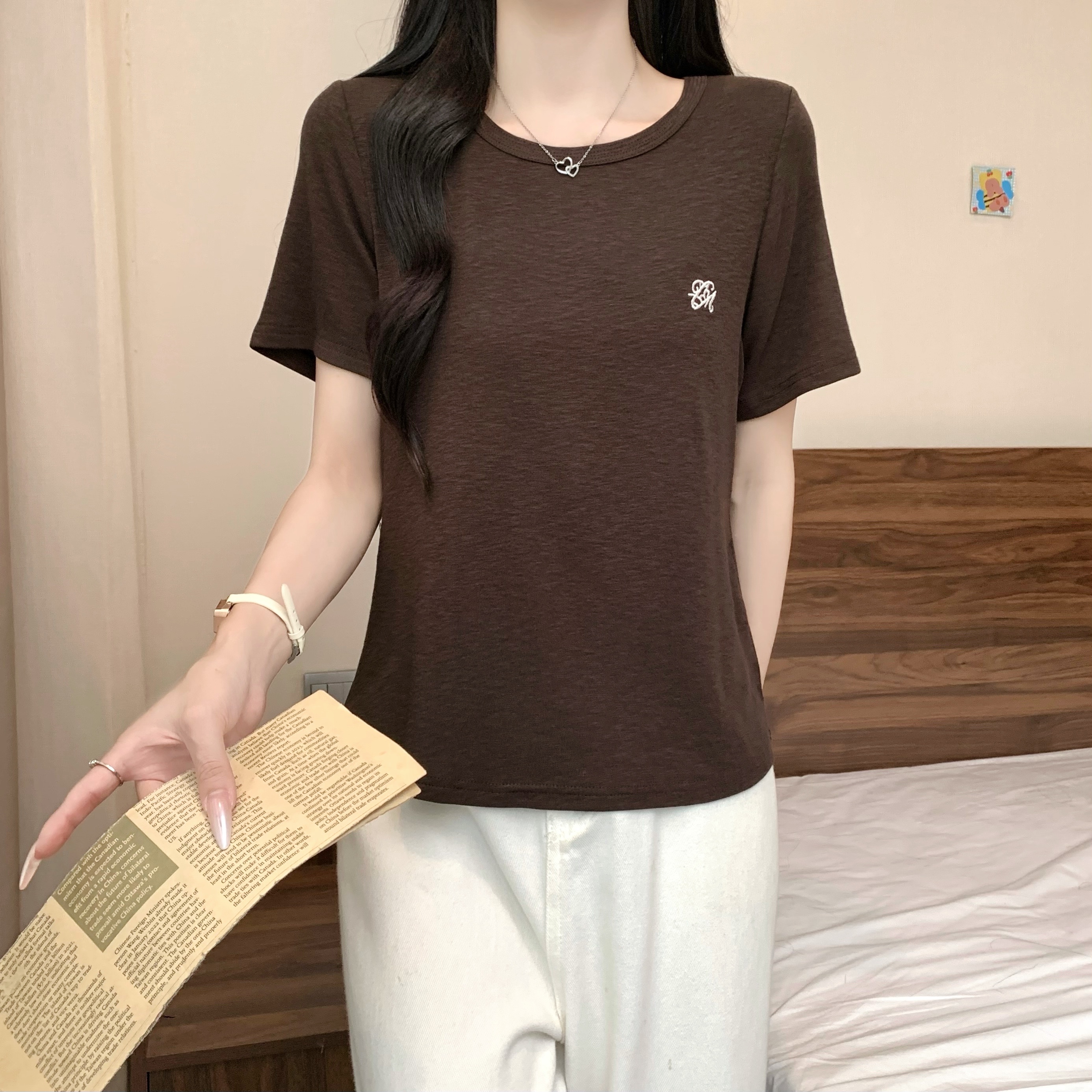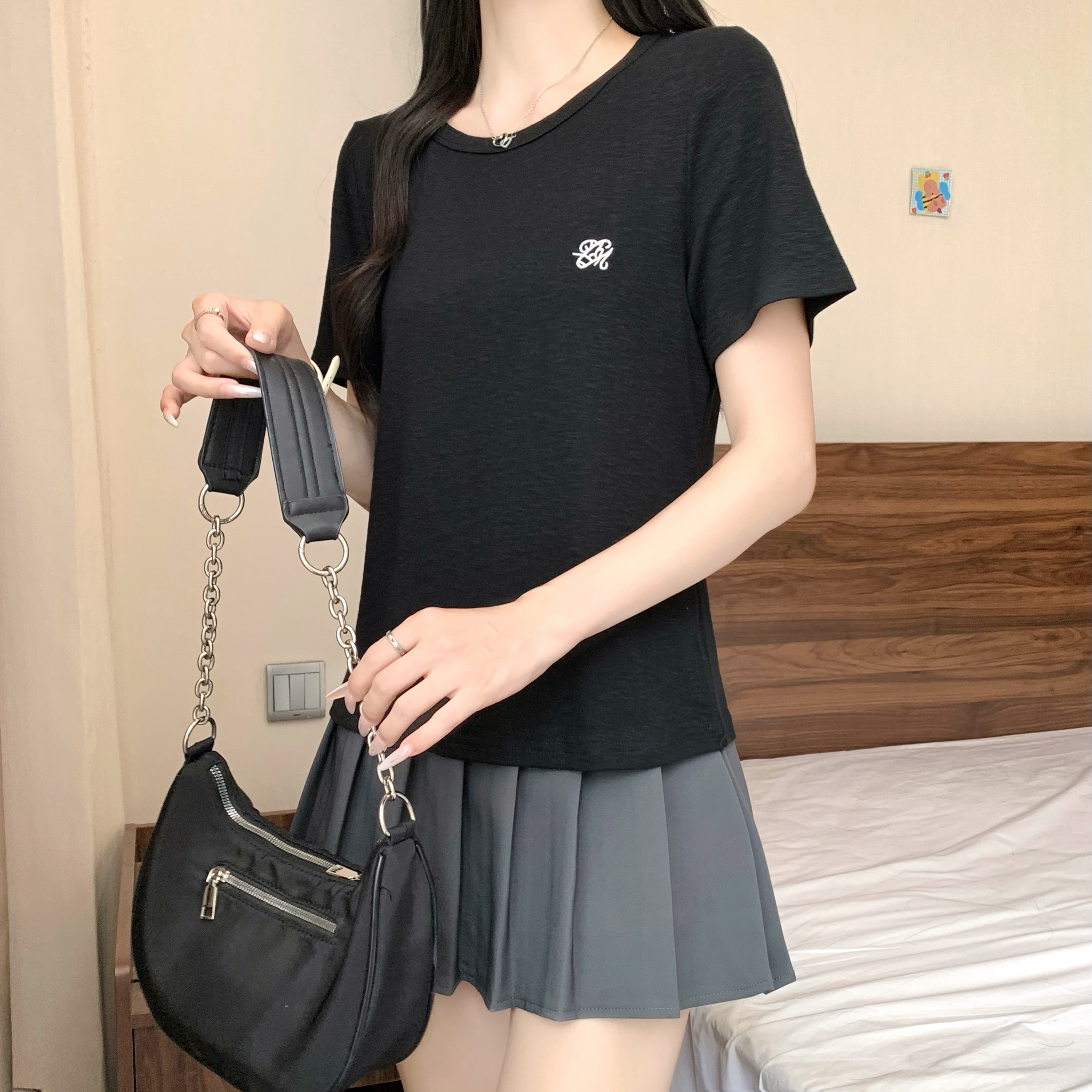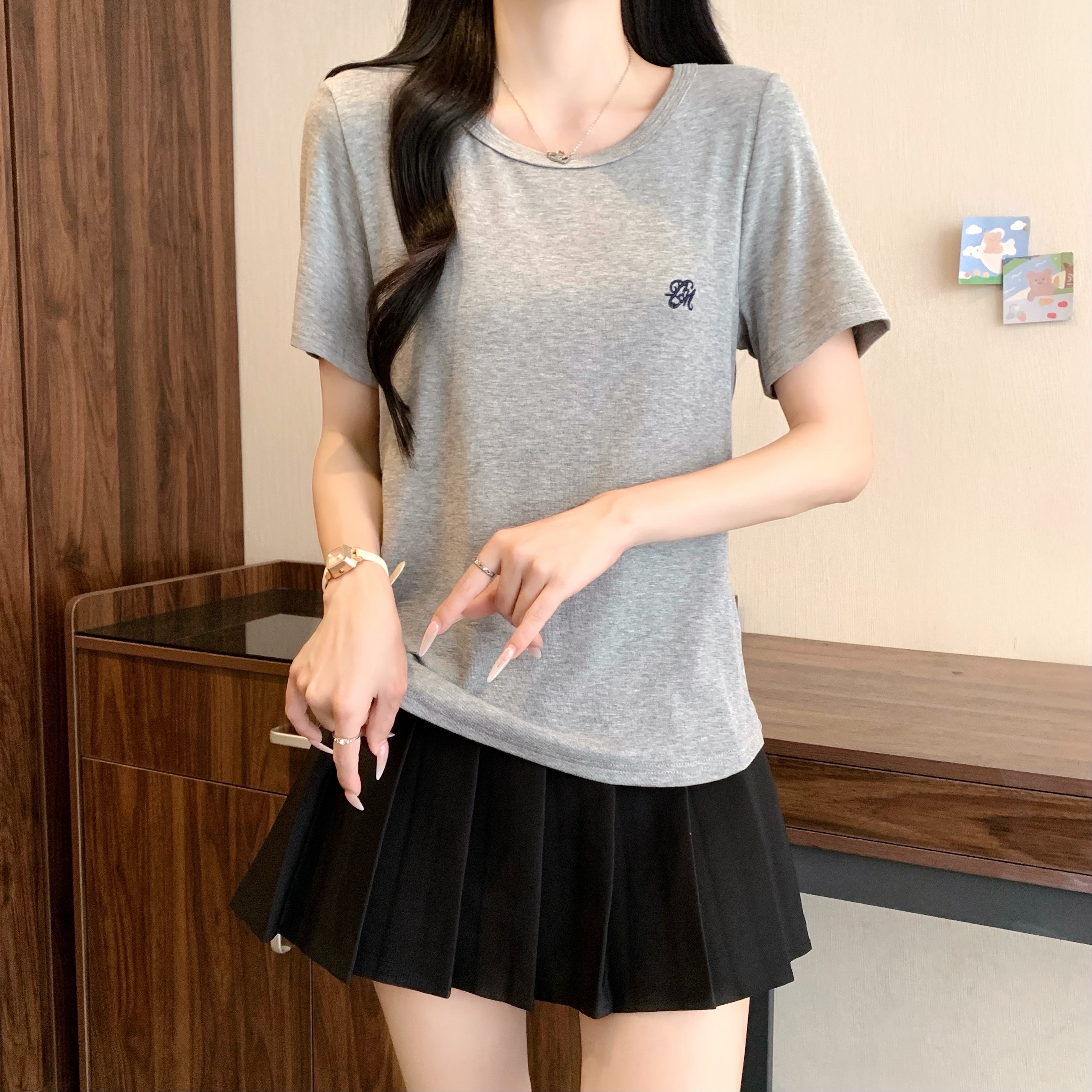 실사 정가 2026 년 여름 새로운 디자인 센스 인어 꼬리 밑단 라운드 넥 디스플레이 긍정적 인 어깨 반팔 티셔츠