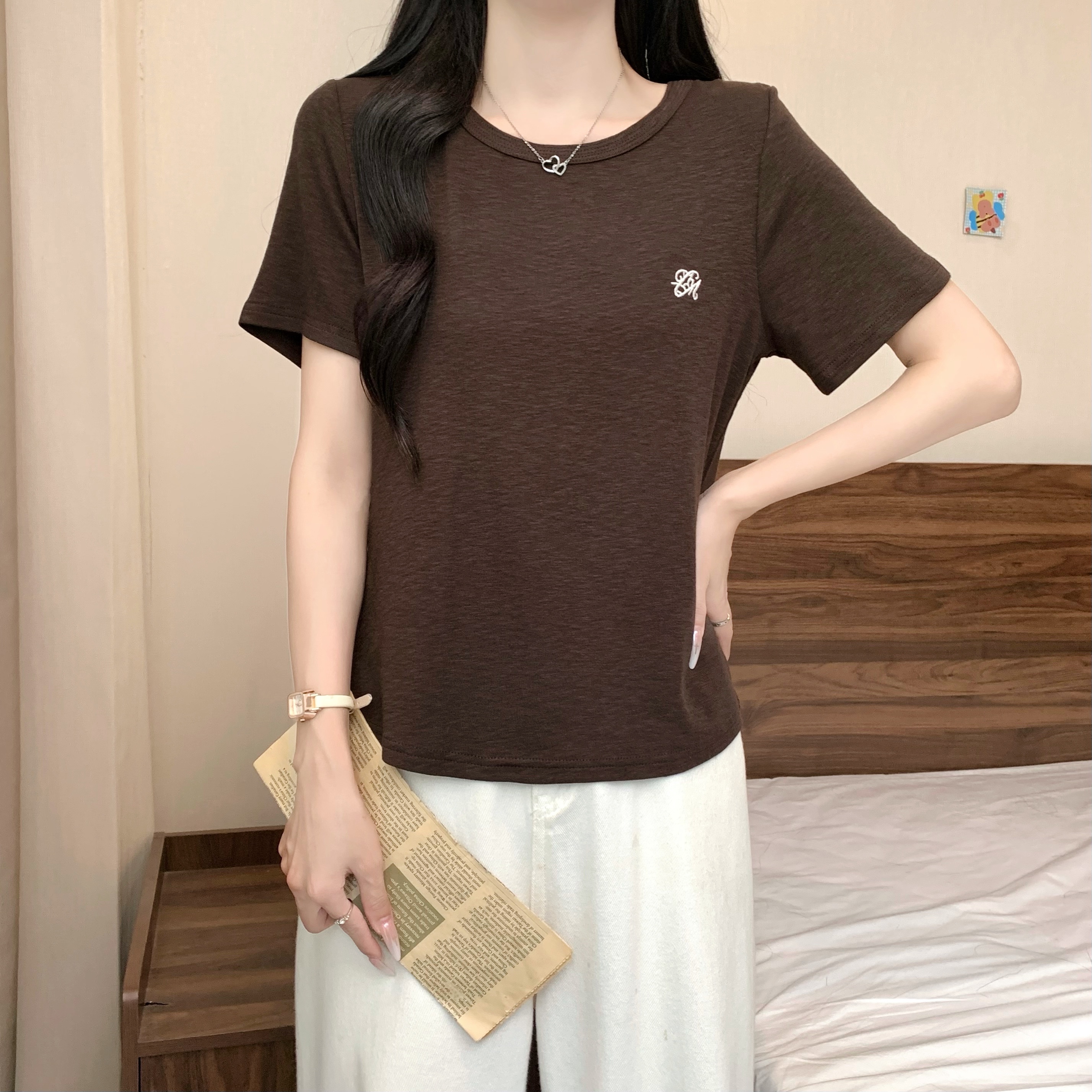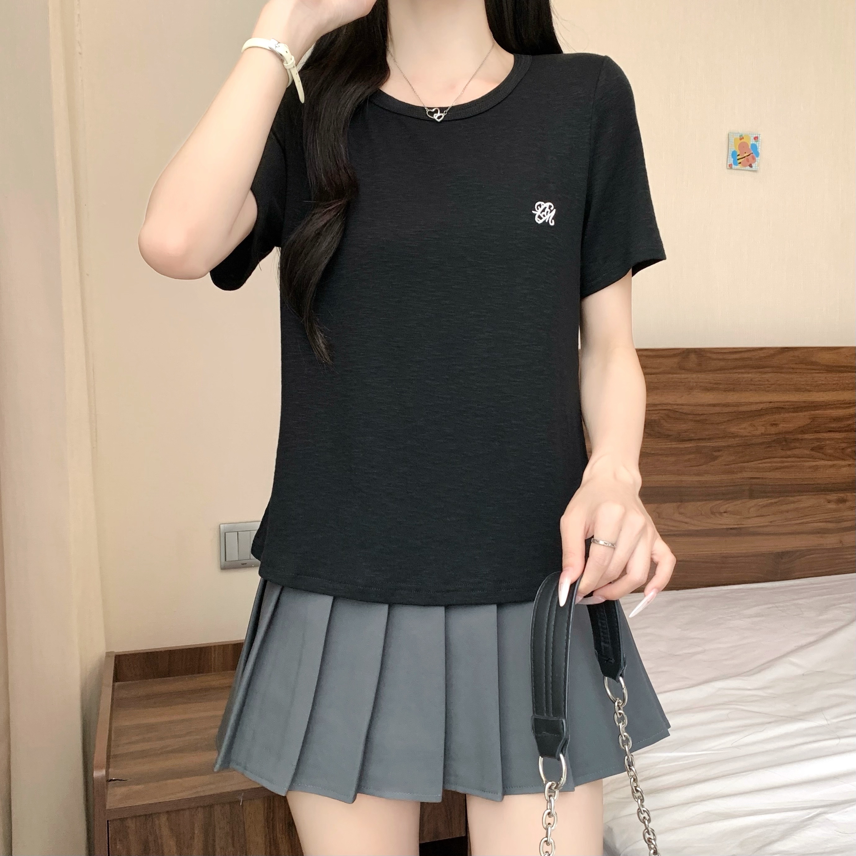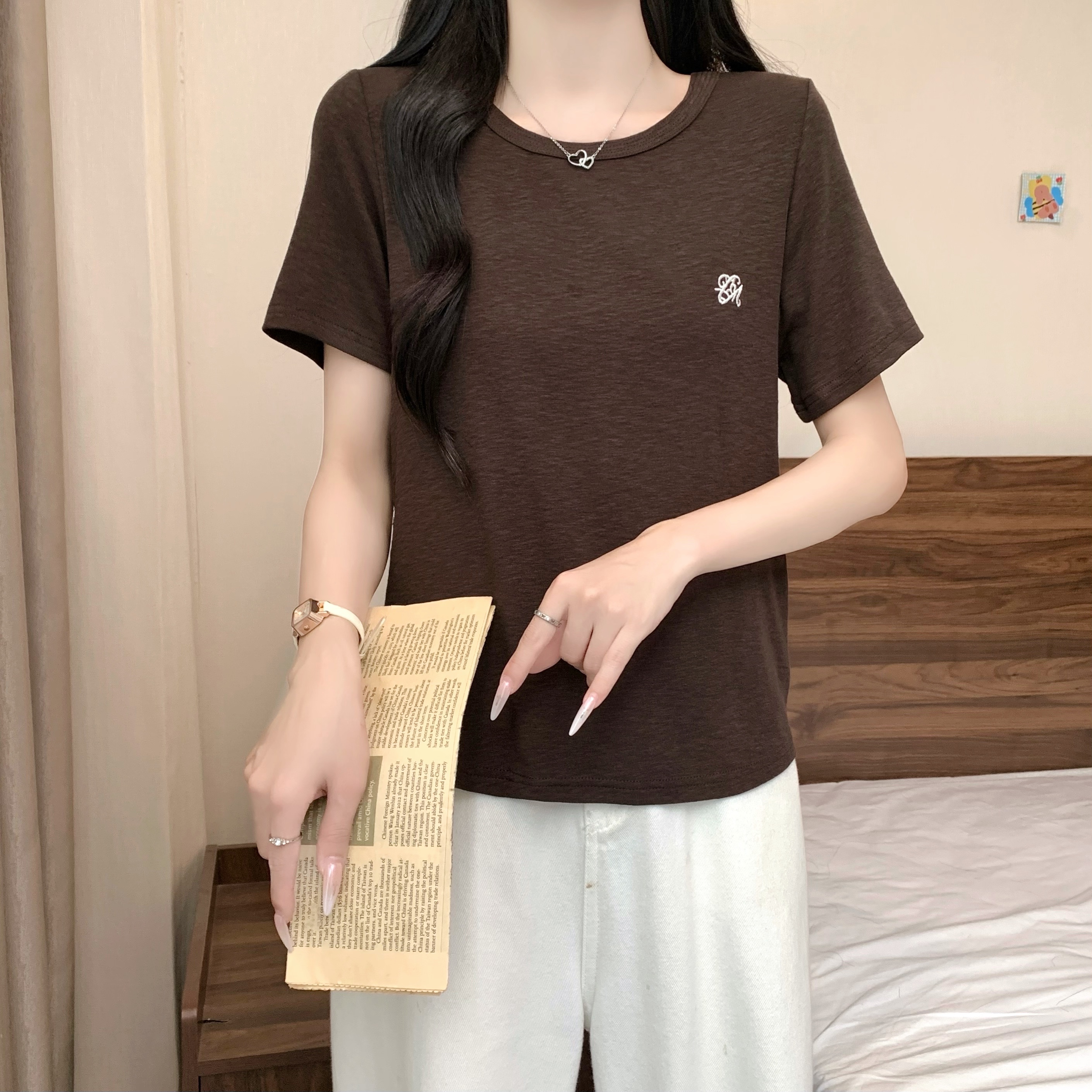 실사 정가 2026 년 여름 새로운 디자인 센스 인어 꼬리 밑단 라운드 넥 디스플레이 긍정적 인 어깨 반팔 티셔츠