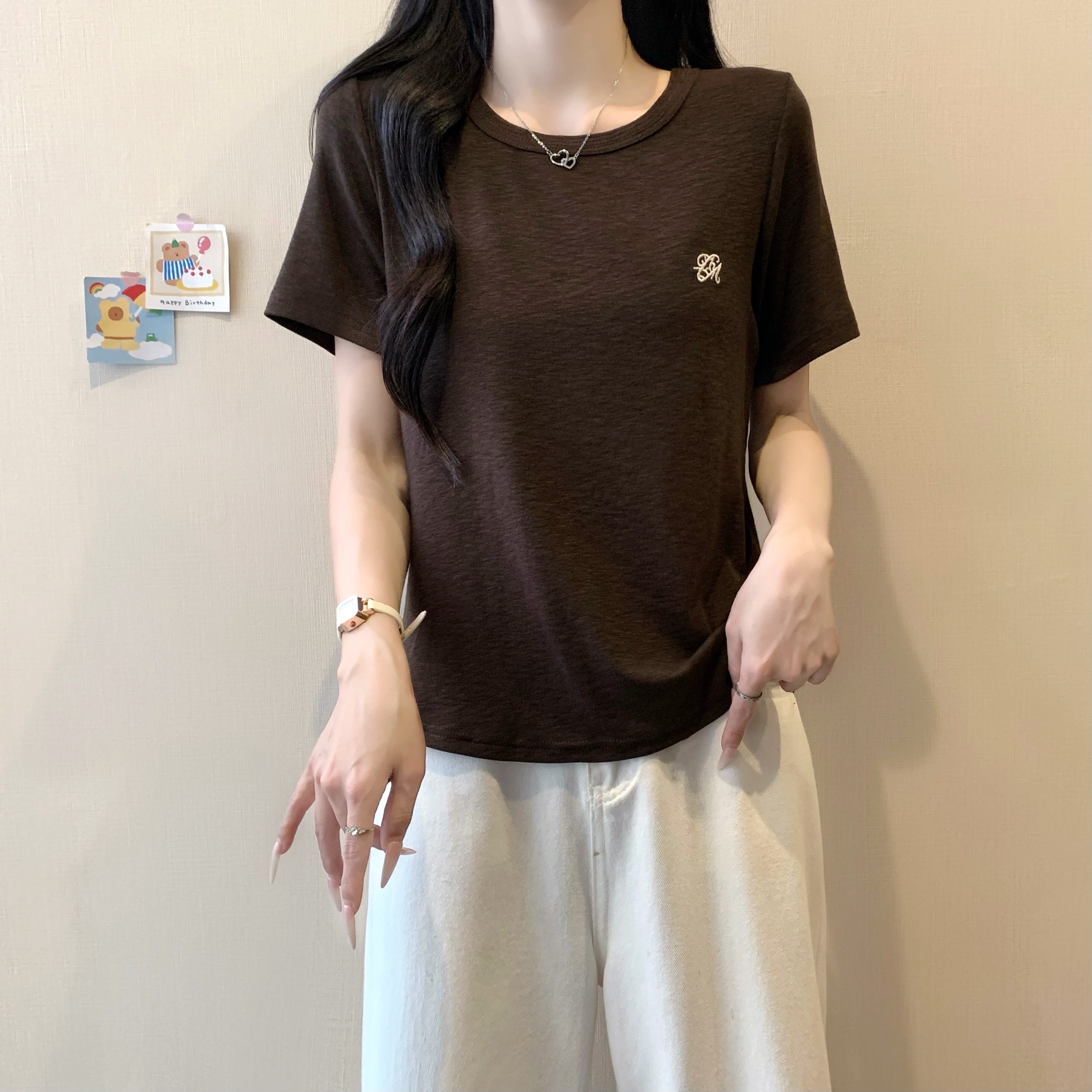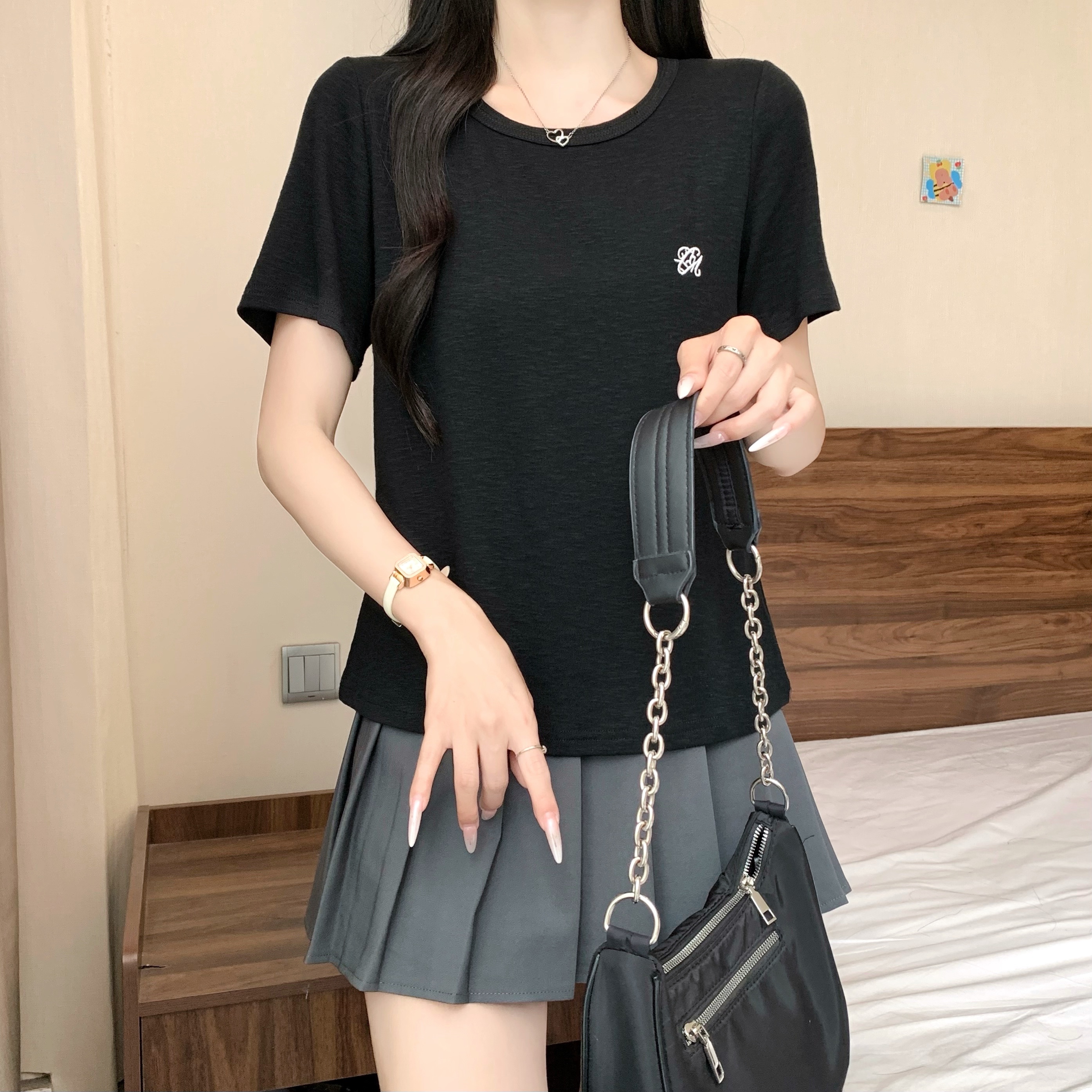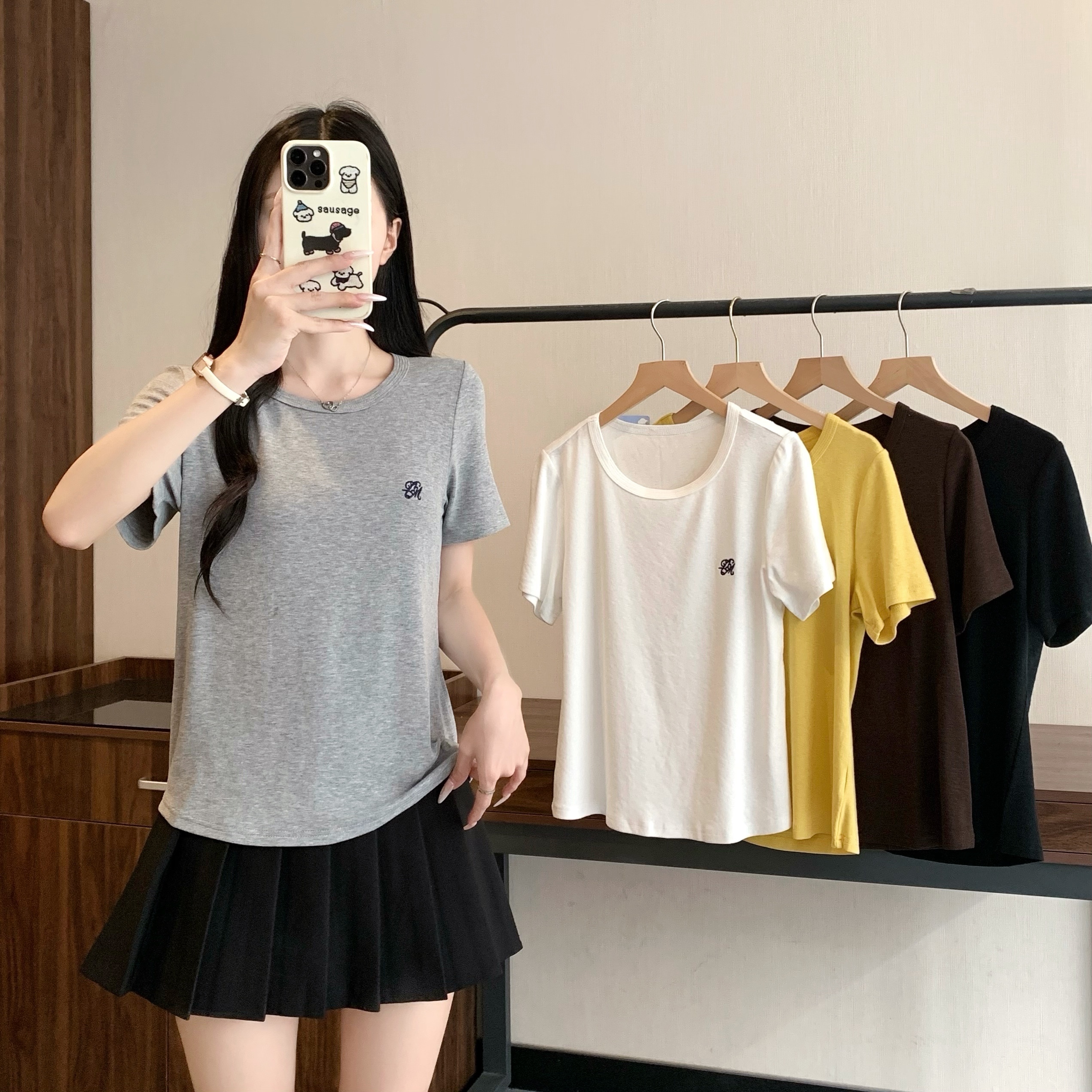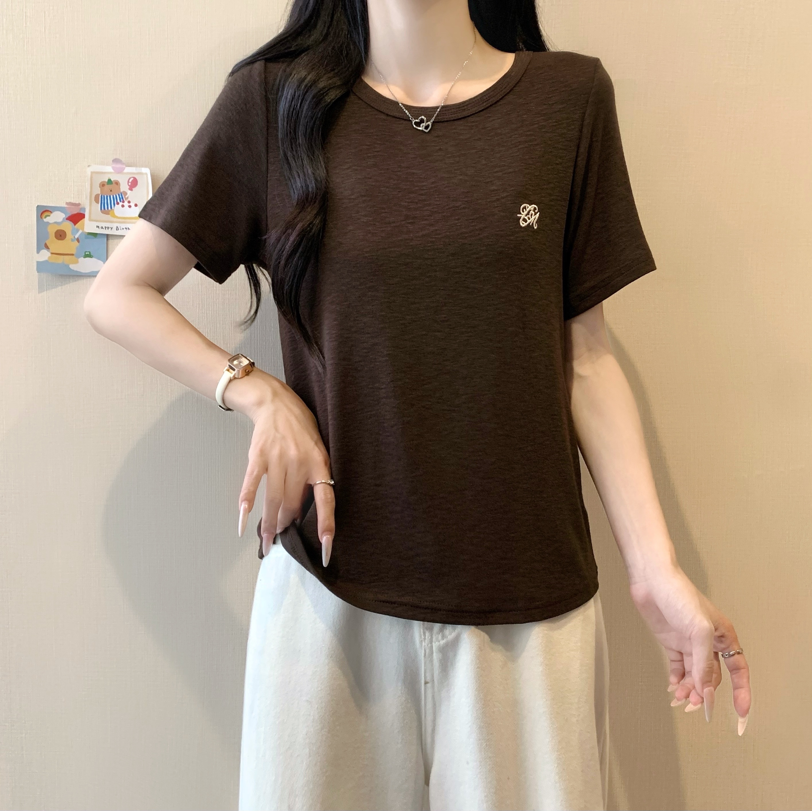 실사 정가 2026 년 여름 새로운 디자인 센스 인어 꼬리 밑단 라운드 넥 디스플레이 긍정적 인 어깨 반팔 티셔츠