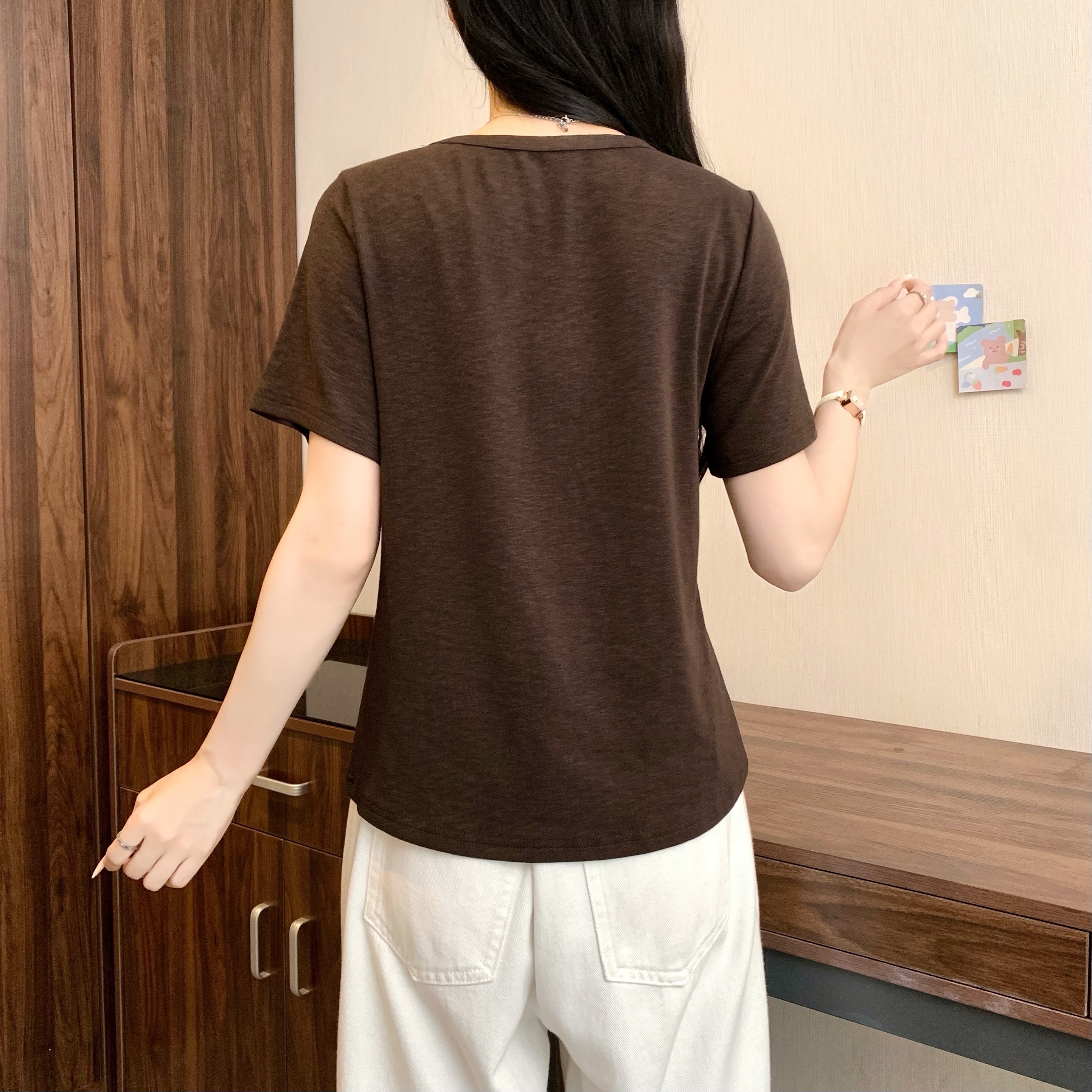 40 230 크 빗질하다 92 면 8 암모니아 Lun 이후 패키지 칼라 높음 폭탄 몸매 가꾸기 슬림해 보이는 긍정적 인 어깨 반팔 티셔츠 여성