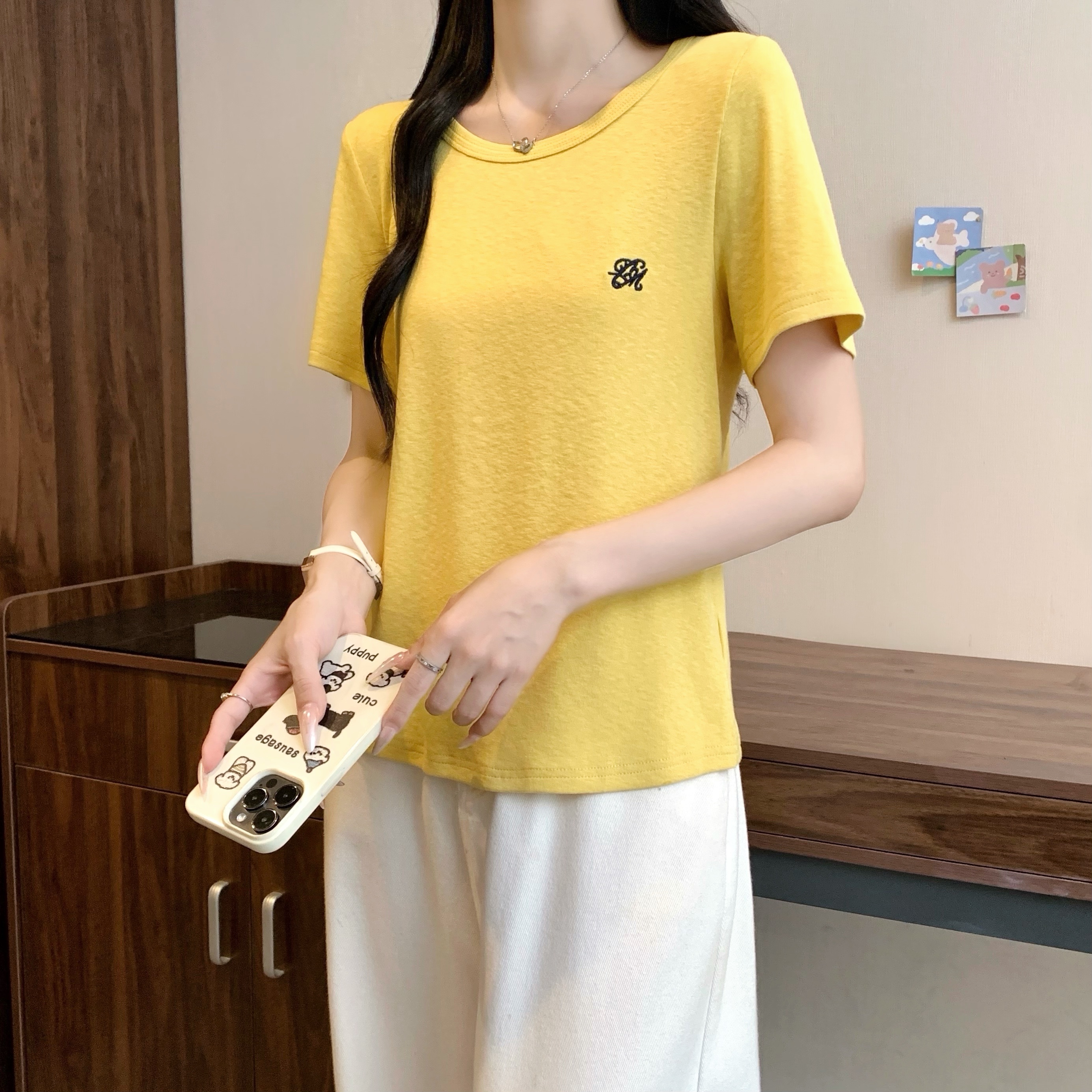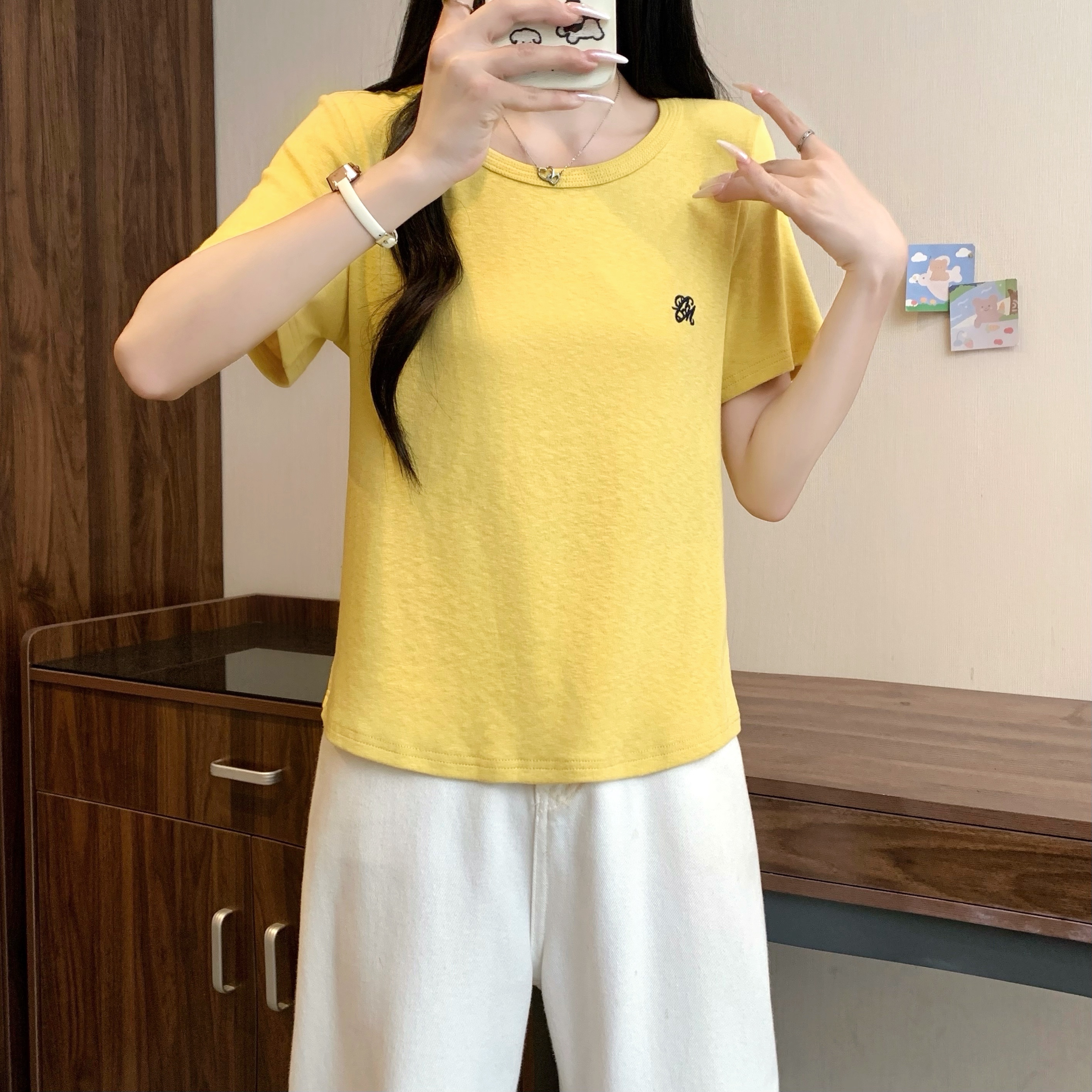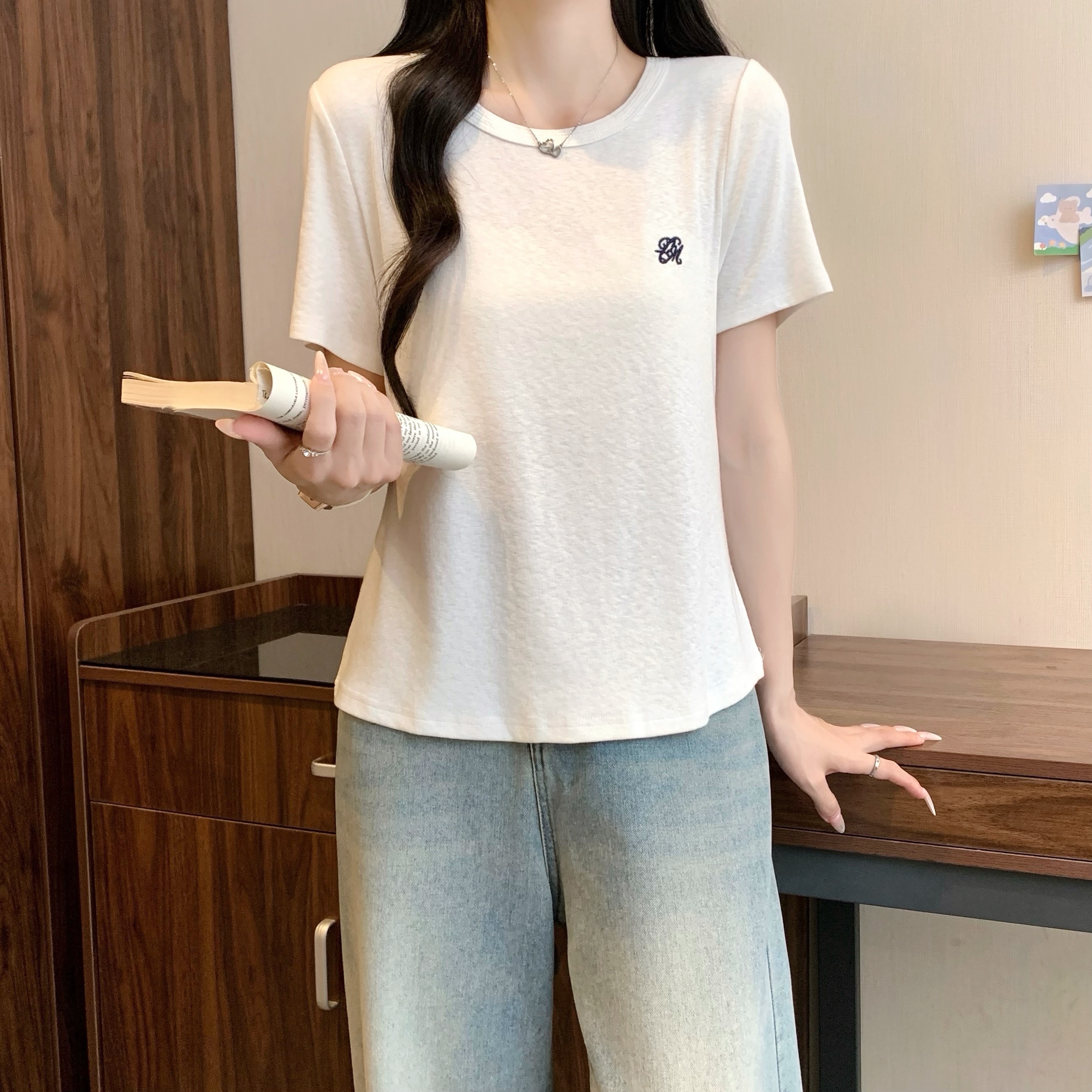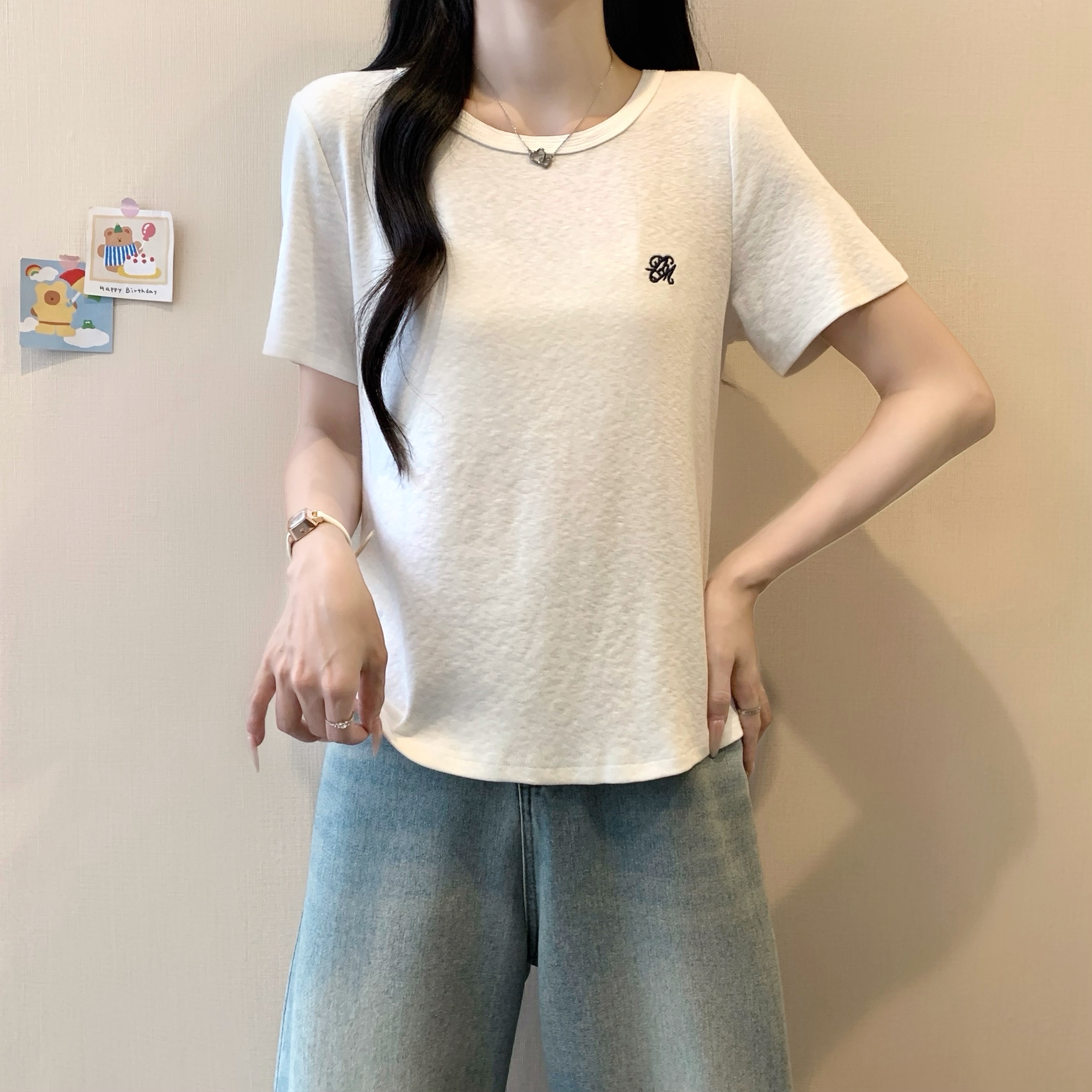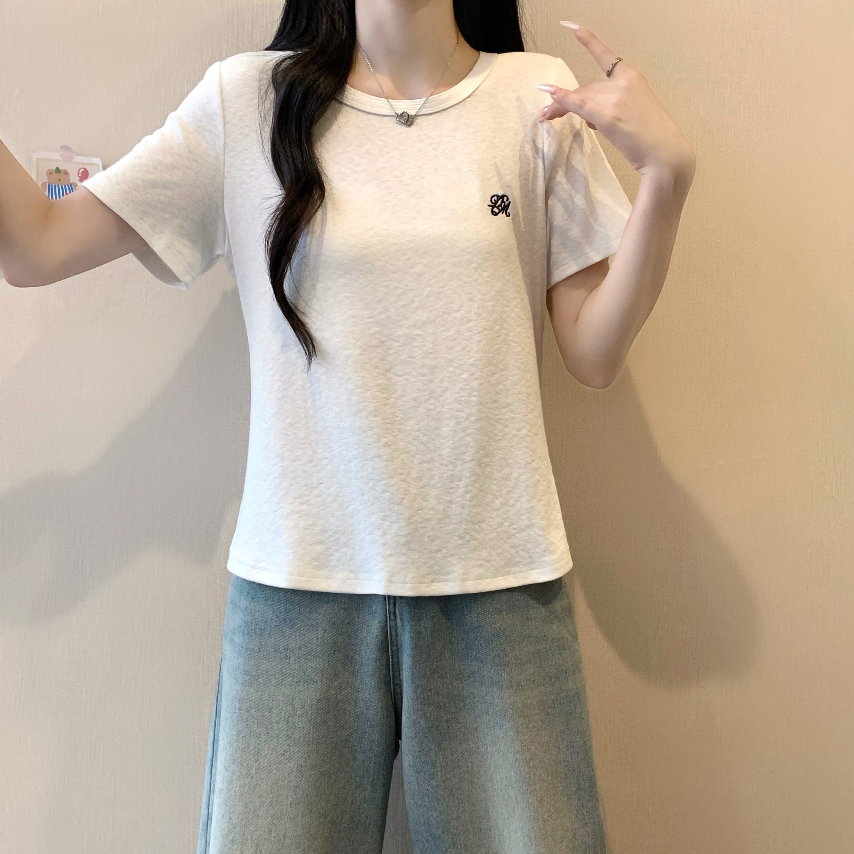 실사 정가 2026 빅 사이즈 여성 의류 여름 새로운 라운드 넥 자수 슬림해 보이는 반팔 티셔츠 맨위