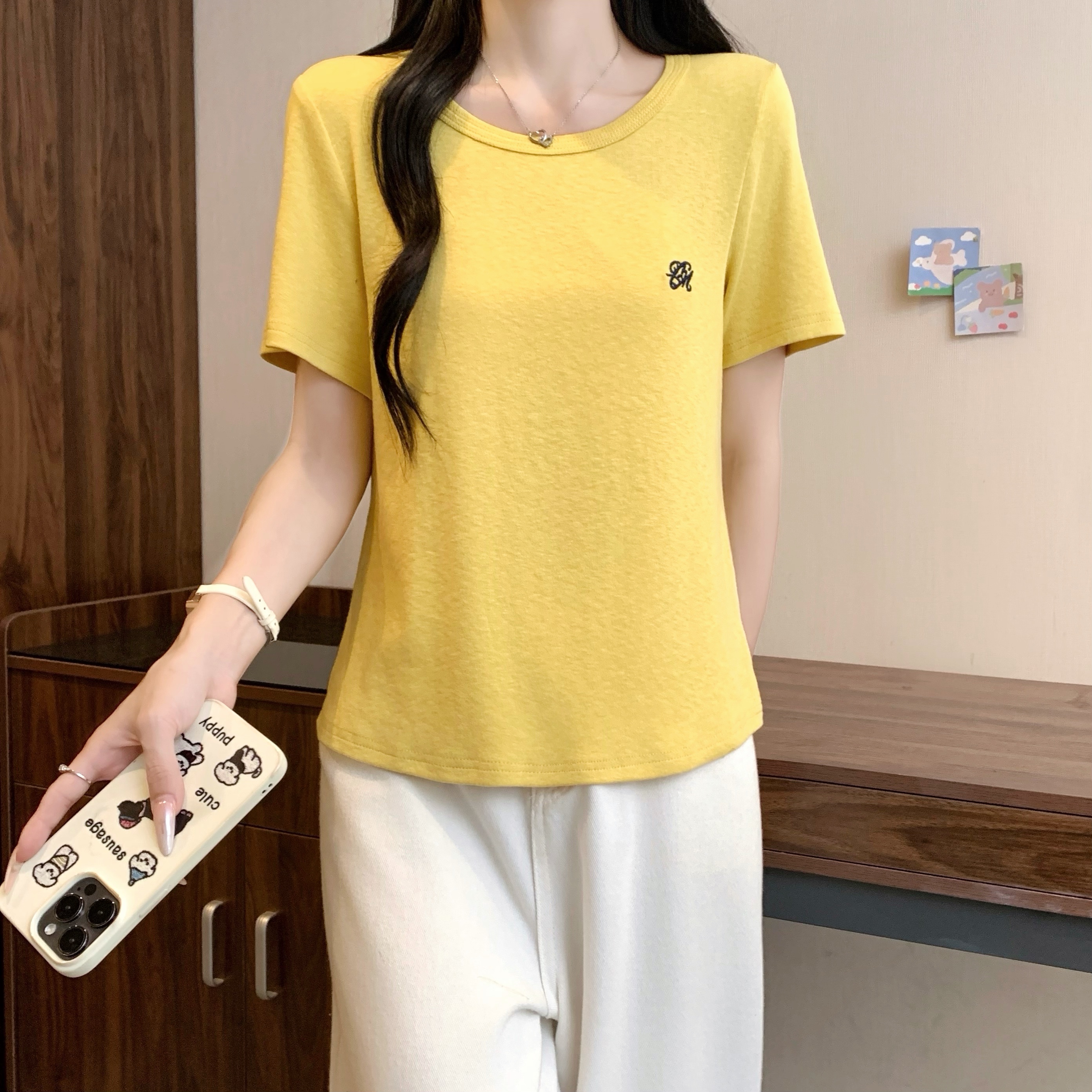 40 220 그램 빗질하다 92 면 8 암모니아 Lun 이후 패키지 칼라 몸매 가꾸기 슬림해 보이는 긍정적 인 어깨 반팔 티셔츠 여성