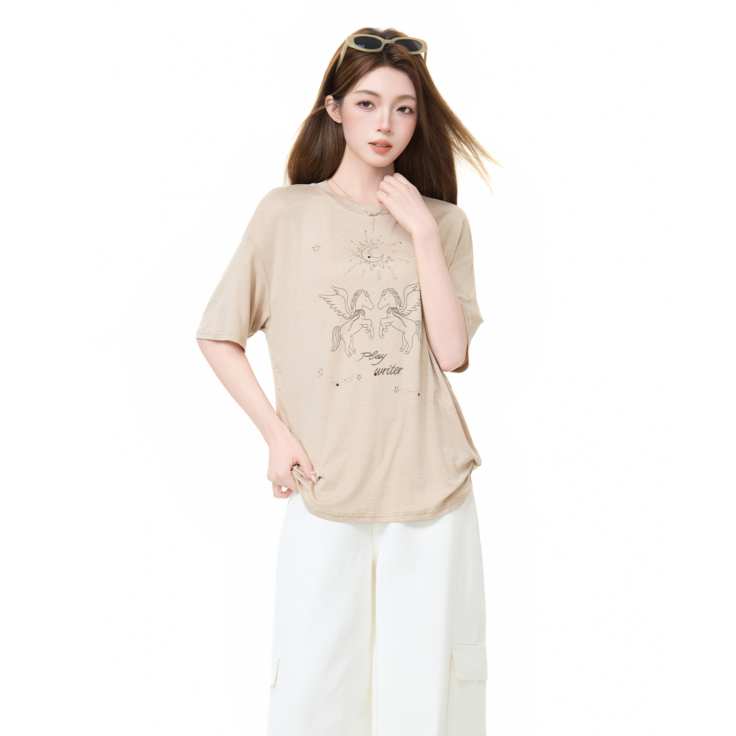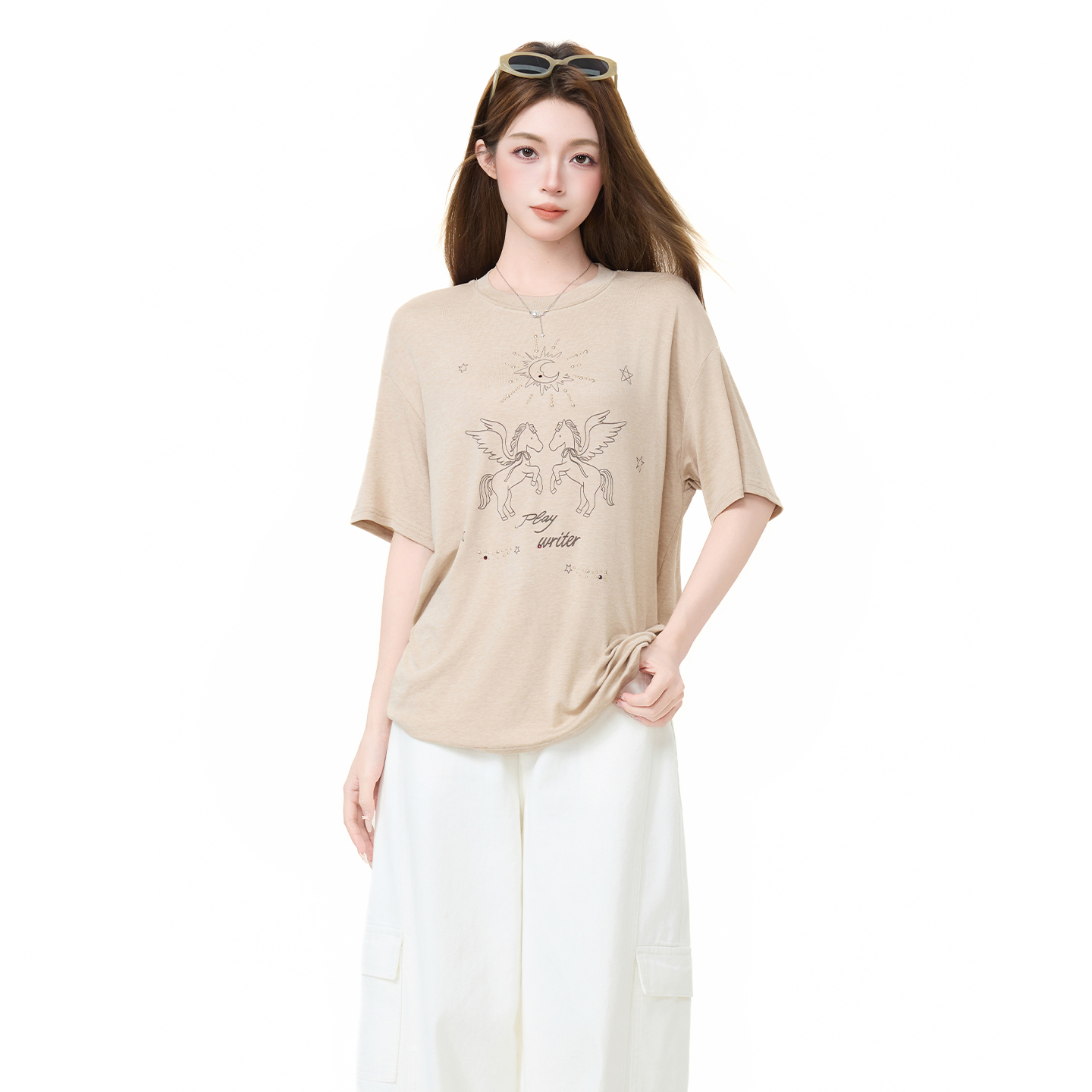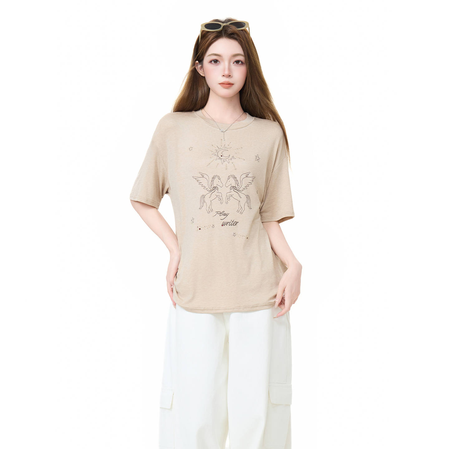 실사 정가 한 부서 오트밀 색상 라운드 넥 레트로 프린트 반팔 티셔츠 여성 여름 루즈핏 슬림해 보이는 긍정적 인 어깨 의류