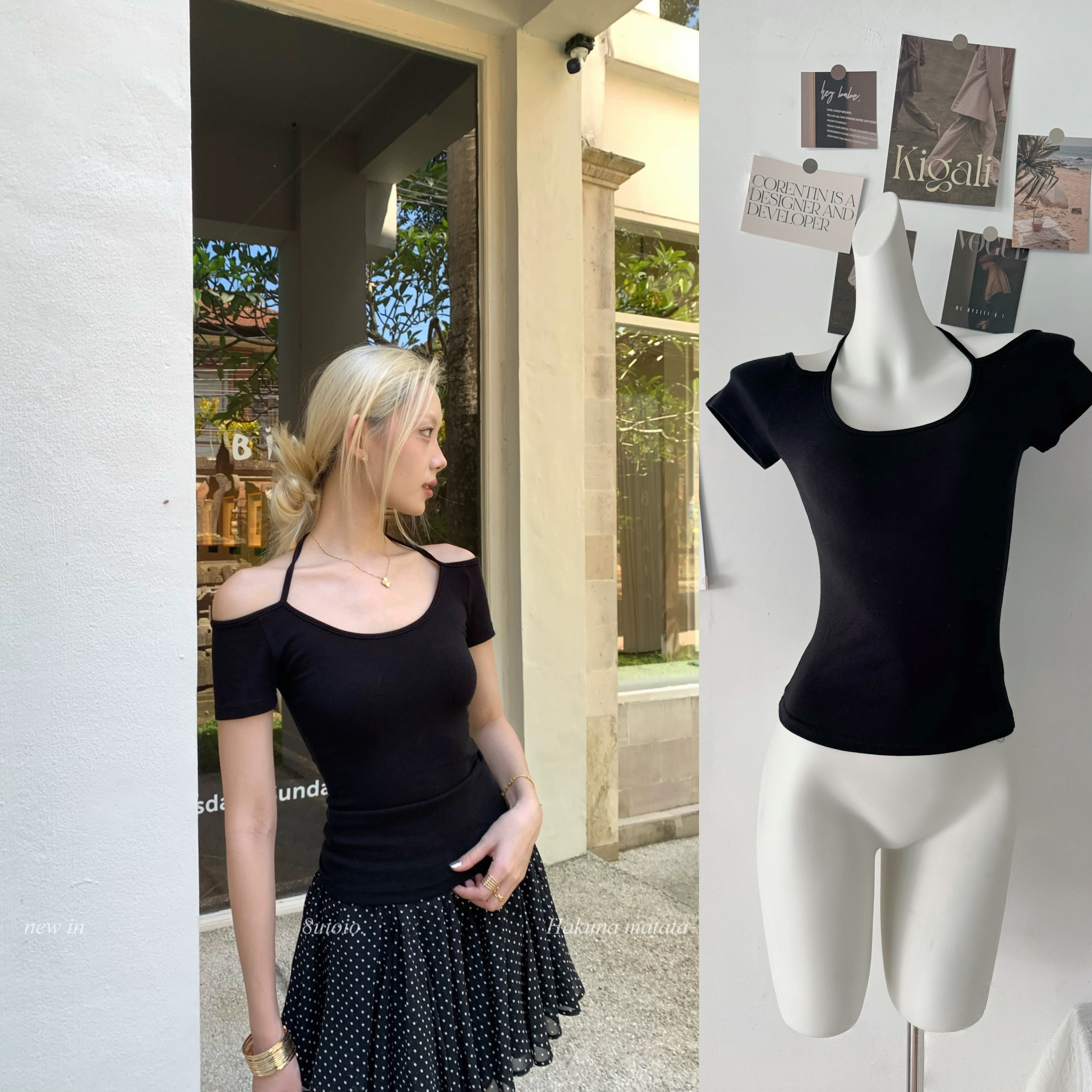 8uioio 하트 비트 표시 검정색 u 칼라 행침 목 티셔츠 여성 여름 새로운 오프숄더 디자인 센스 슬림해 보이는 짧은 맨위