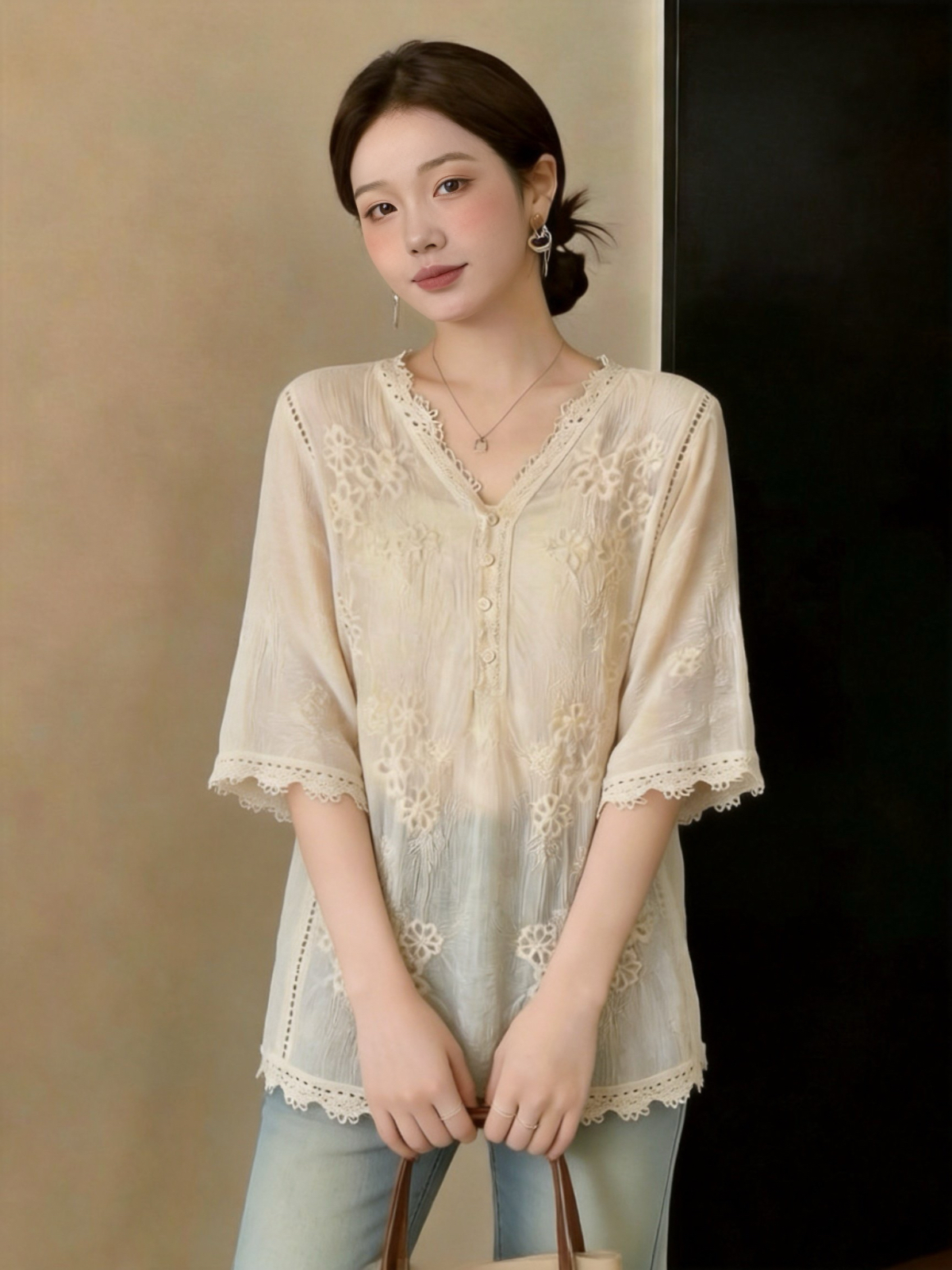 실사 빅 사이즈 프랑스식 홀로우 아웃 자수 V 넥 셔츠 레이스 자외선 차단 블라우스 여름 루즈핏 얇은 스타일 중간 소매 맨위