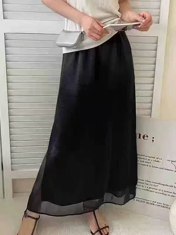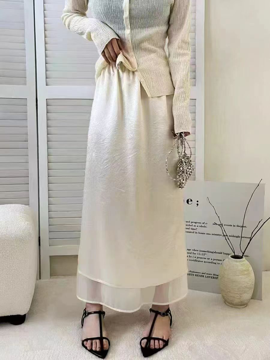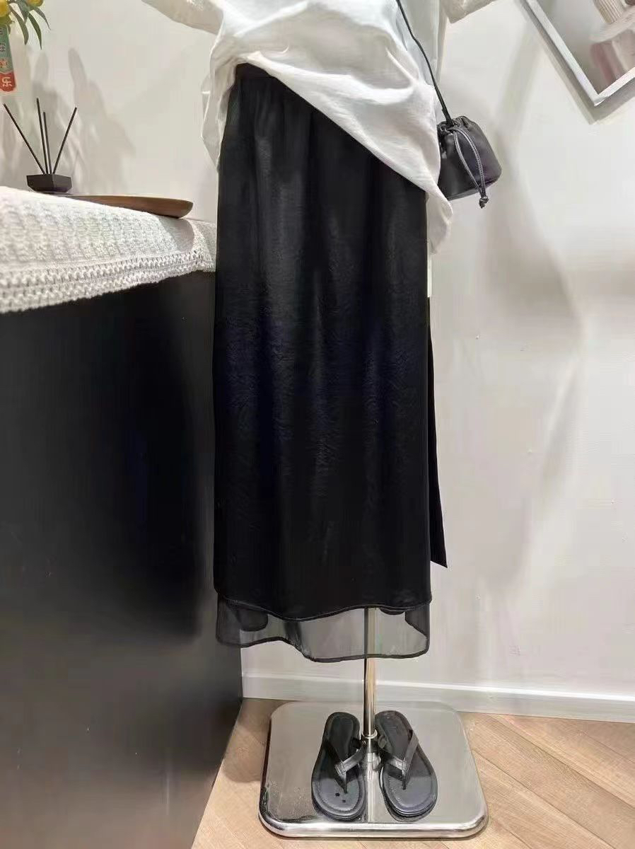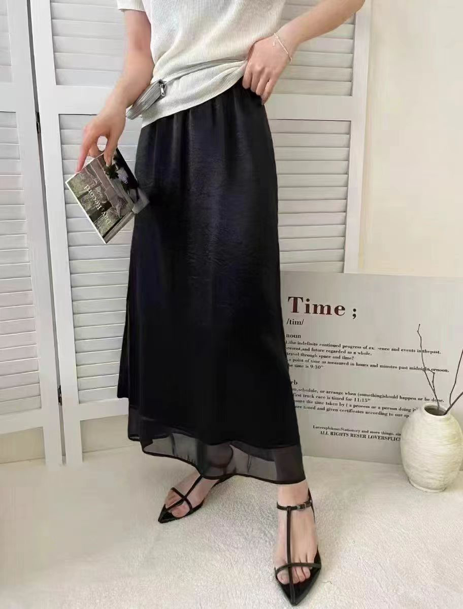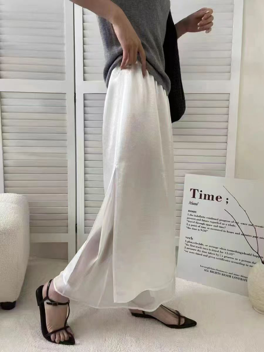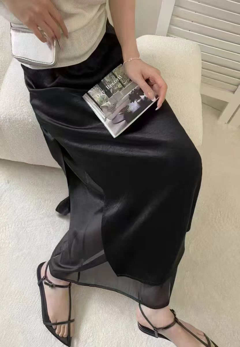 프랑스식 새틴 아세트산 반신 스커트 여성 여름 중간 길이 허리밴드 슬림해 보이는 타이트 스커트 트임 A라인 스커트 여성