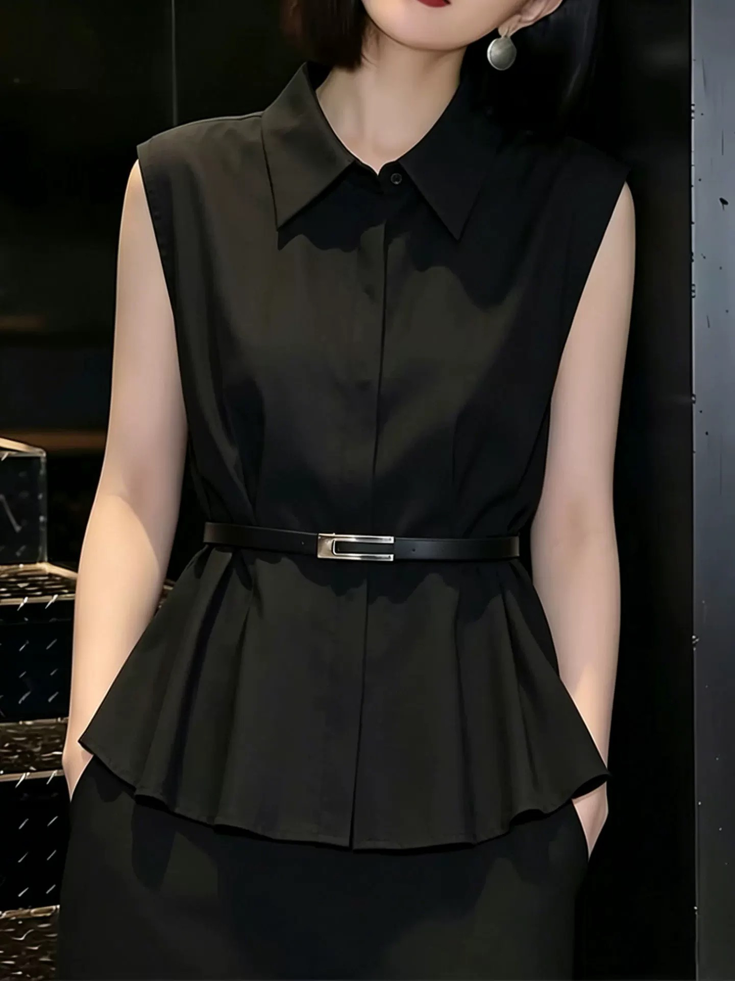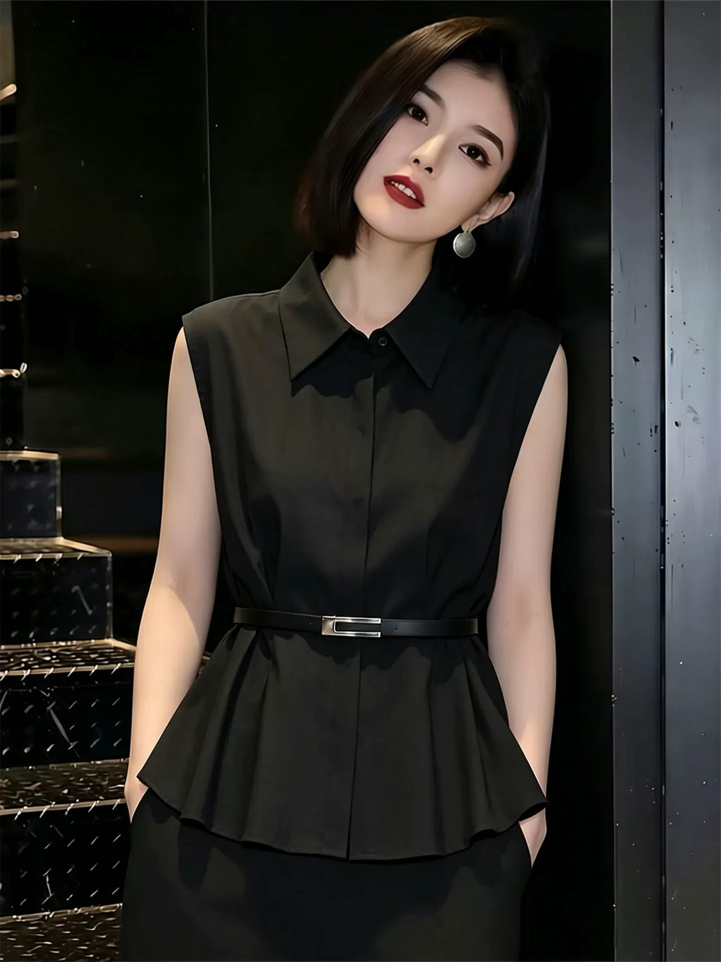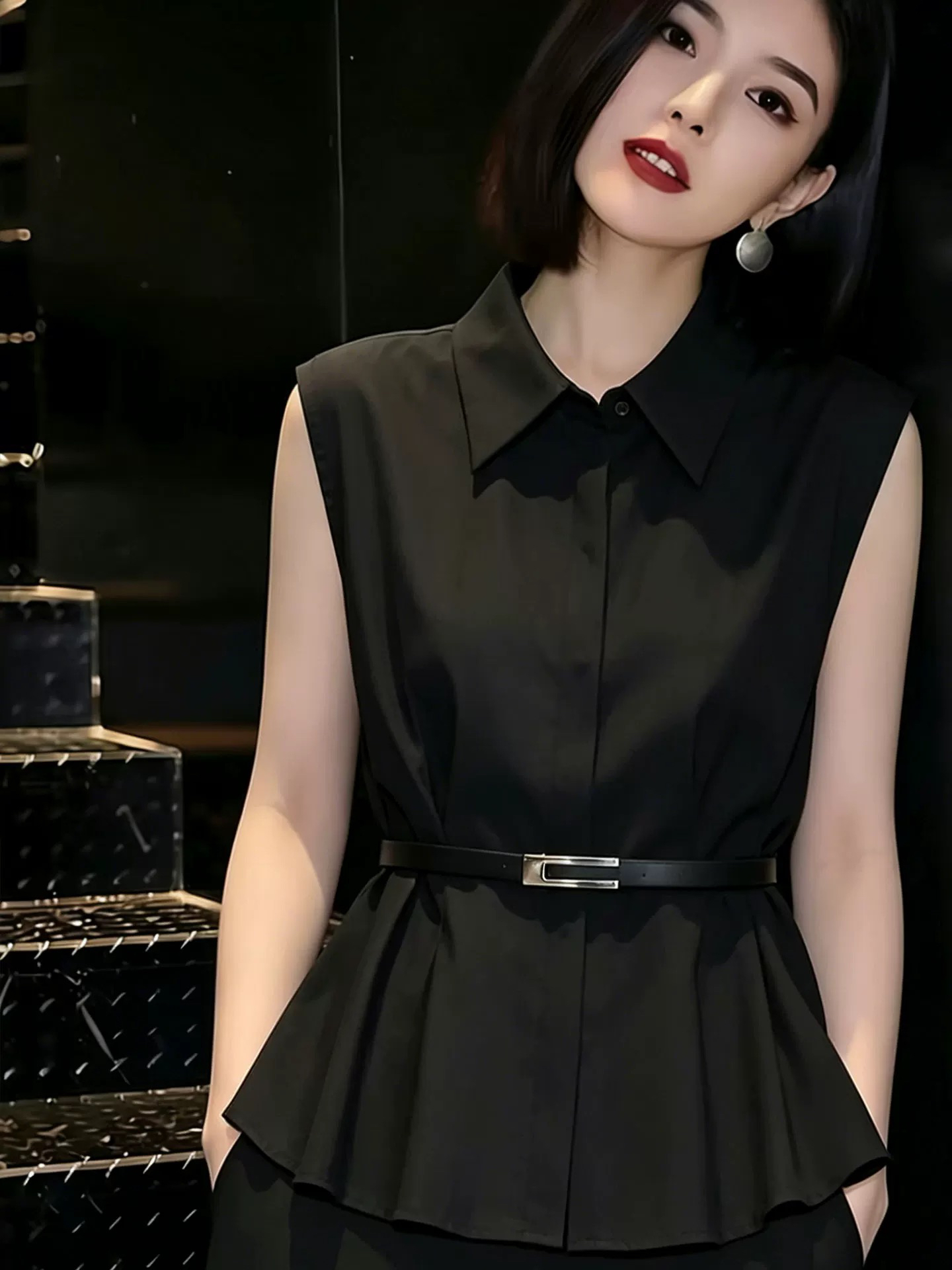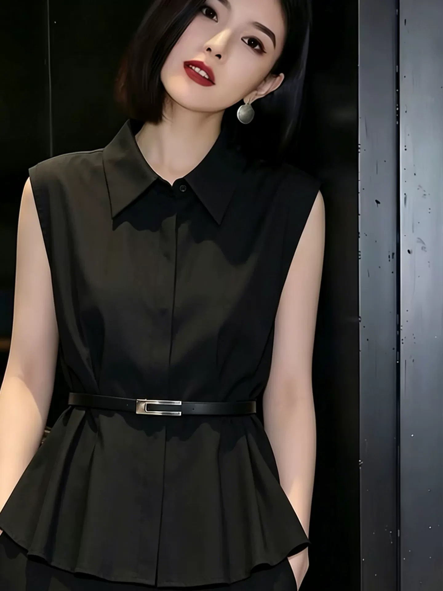 빛 요리 한 우아함 바람 검정색 민소매 폴로 칼라 허리 수축 레이스업 맨위 여성 2026 여름 새로운 품격 슬림해 보이는 인사이드 가져 가라.