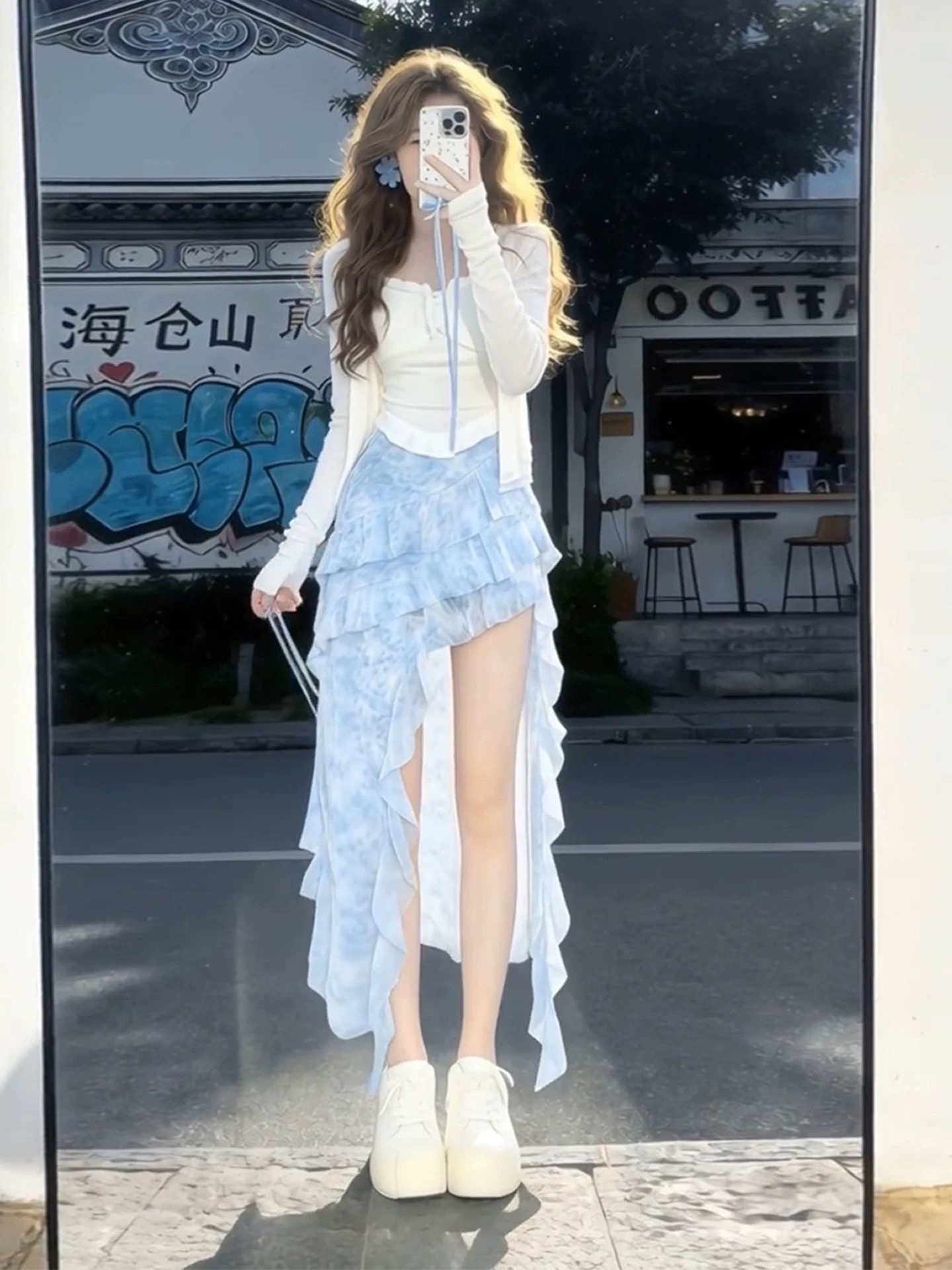 조기 봄 점프 슈트 치마 여성 의류 2026 새로운 부드러운 한 부서 달콤한 자매 착용 가져 가라. 파란색 불규칙 롱 스커트 세트