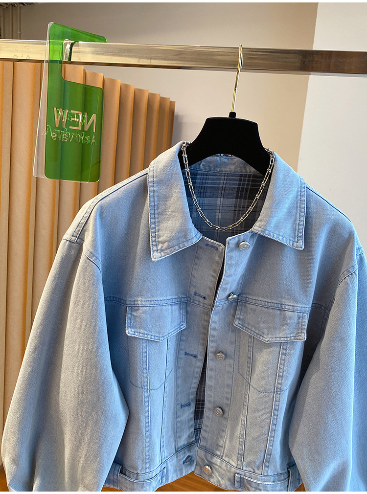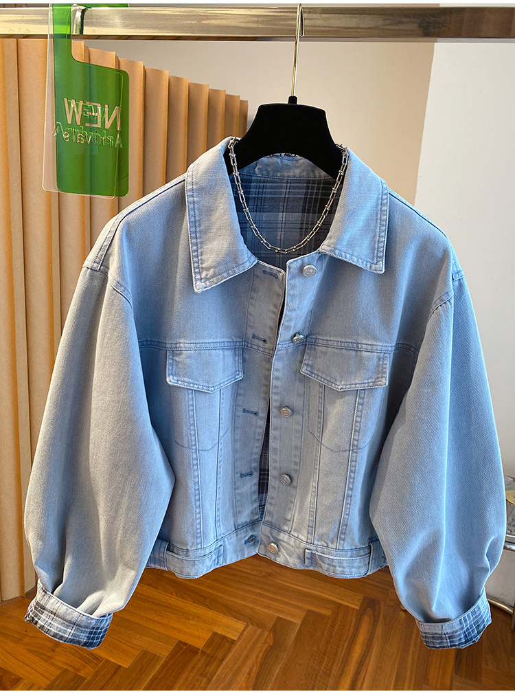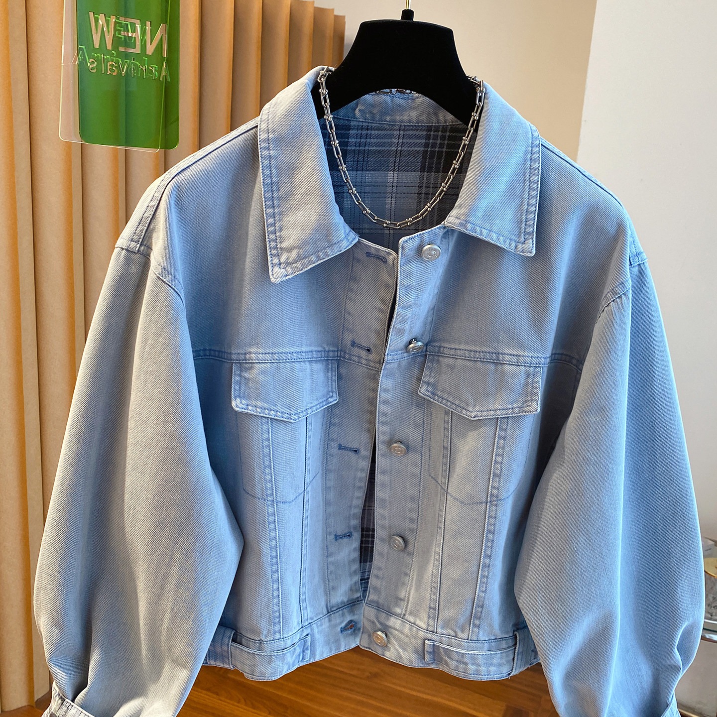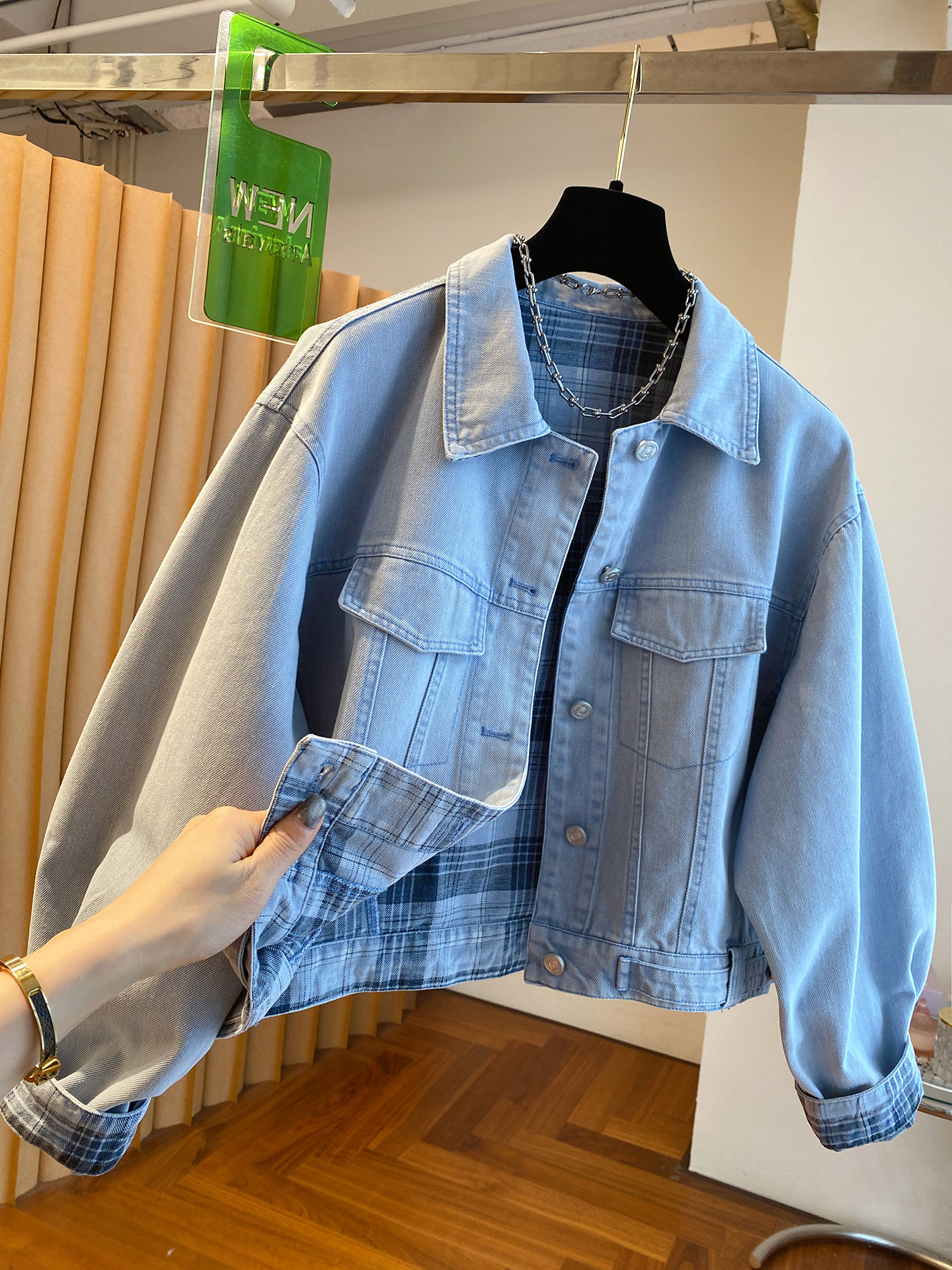 유럽 상품 밝은색 데님 여성 코트 2026 봄 드레스 새로운 루즈핏 슈퍼 잘 생긴 체크무늬 네리 쇼트 스타일 폴로 칼라 맨위