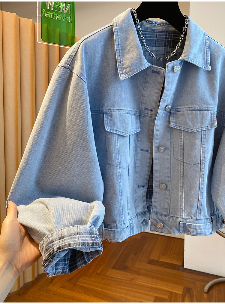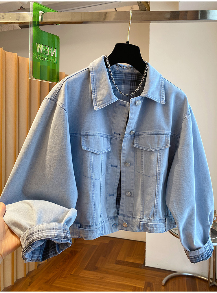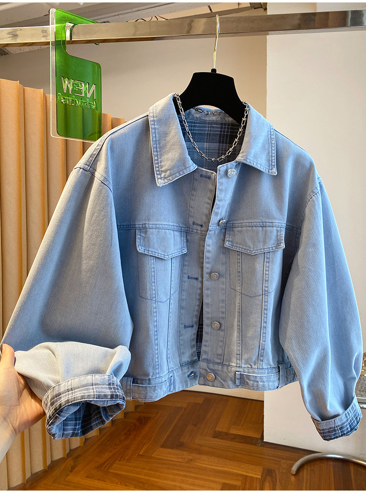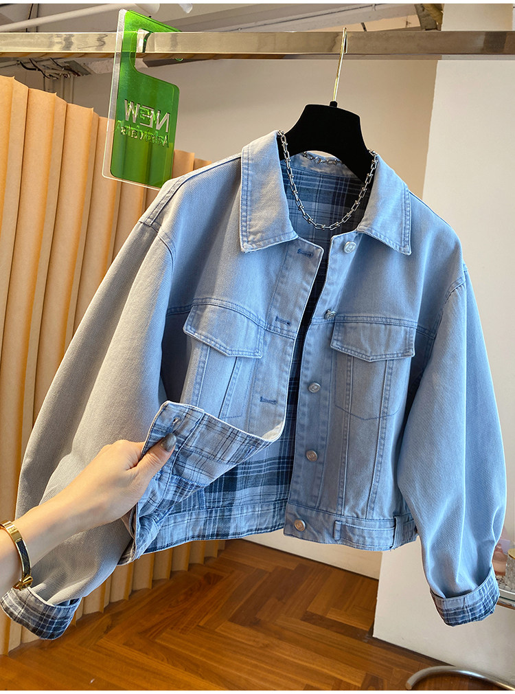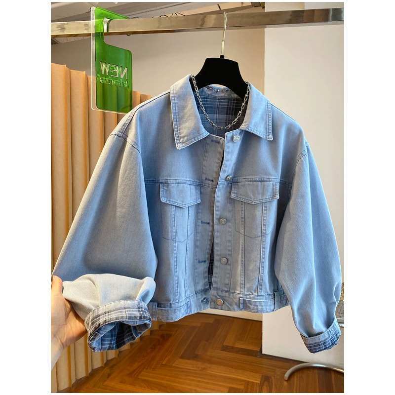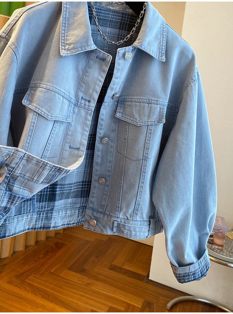 유럽 상품 밝은색 데님 여성 코트 2026 봄 드레스 새로운 루즈핏 슈퍼 잘 생긴 체크무늬 네리 쇼트 스타일 폴로 칼라 맨위