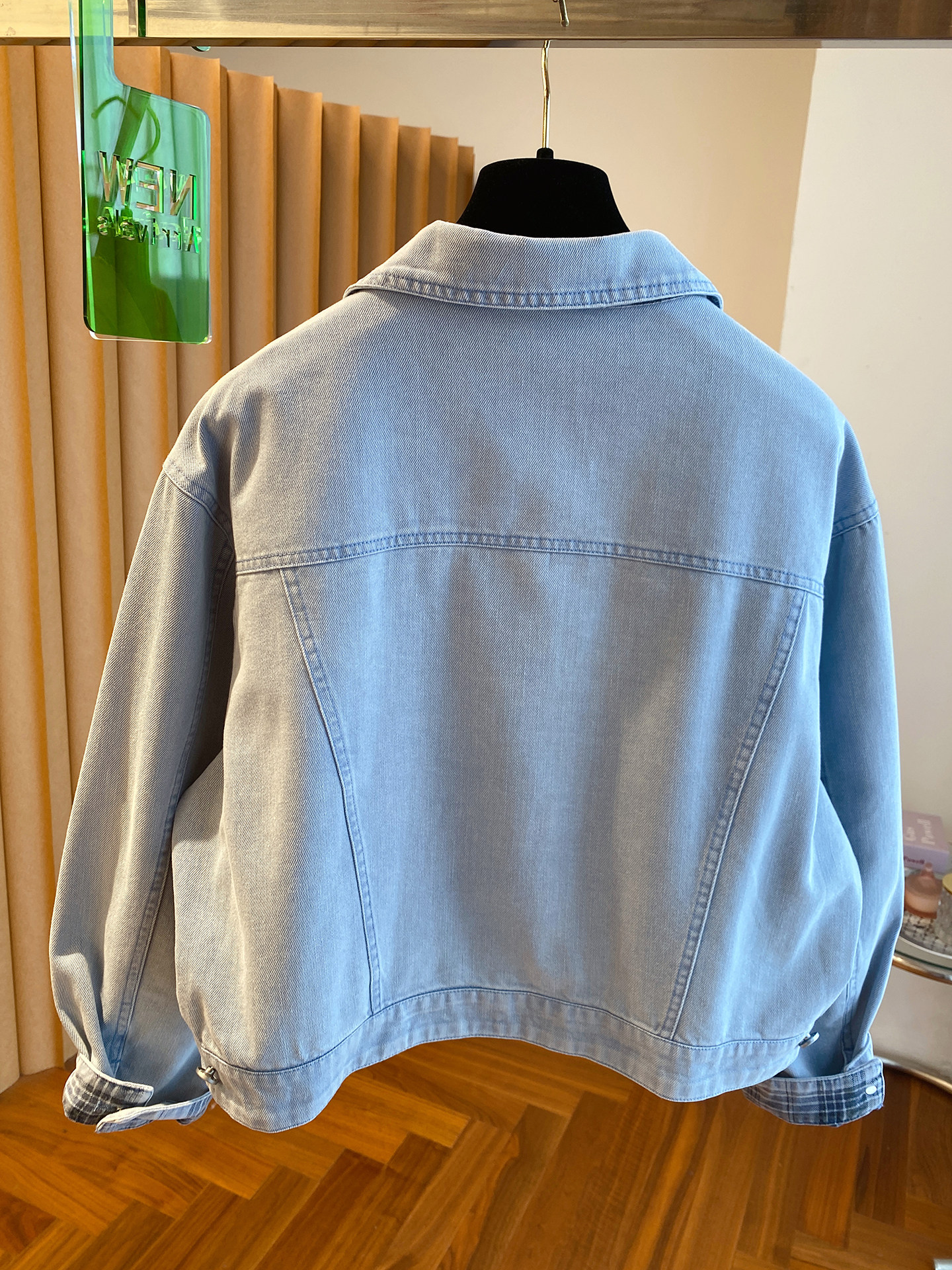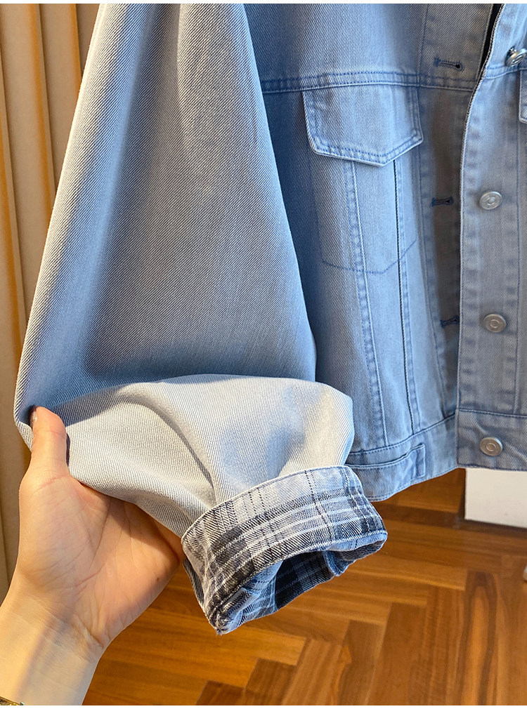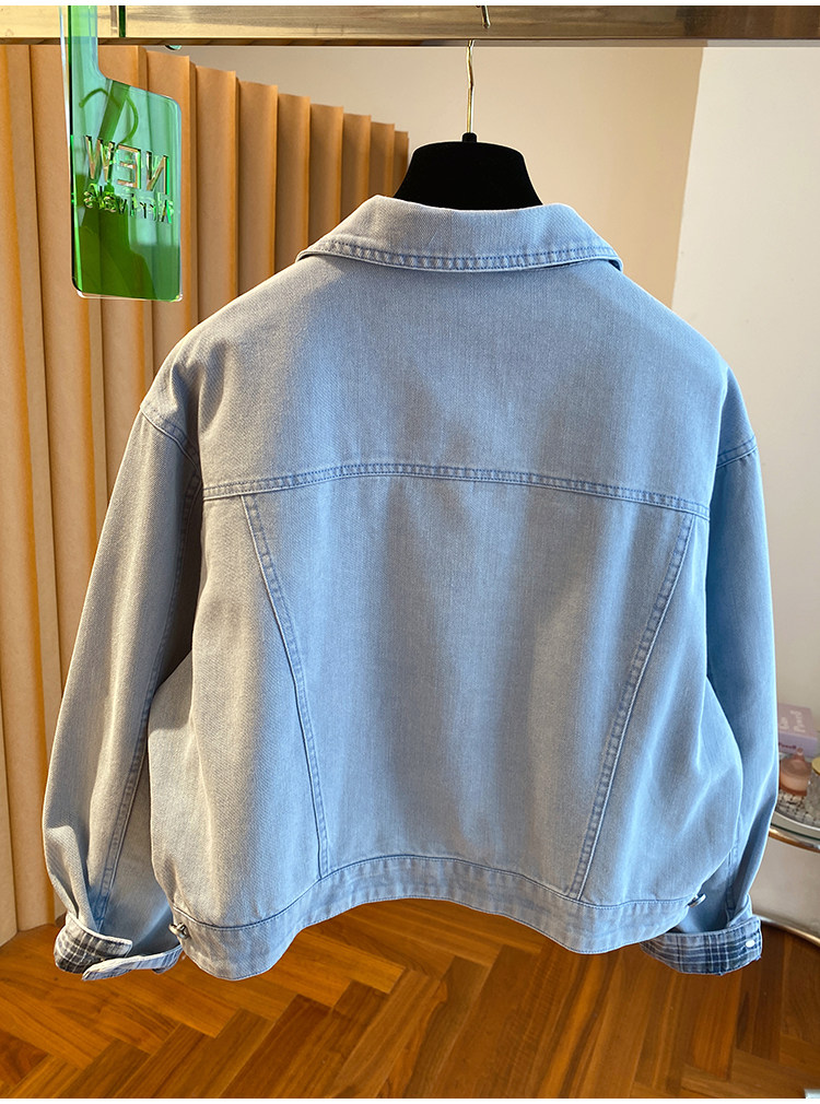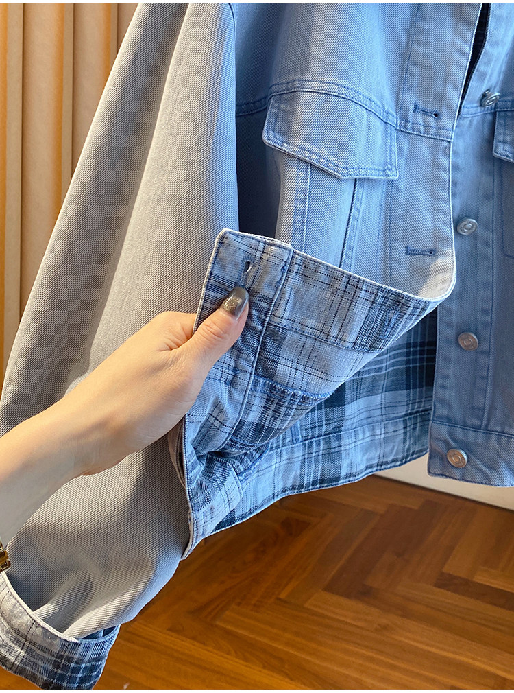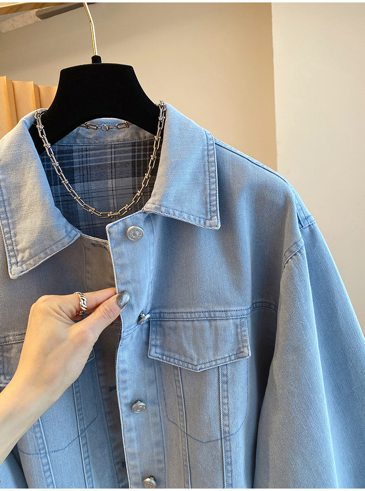 유럽 상품 밝은색 데님 여성 코트 2026 봄 드레스 새로운 루즈핏 슈퍼 잘 생긴 체크무늬 네리 쇼트 스타일 폴로 칼라 맨위