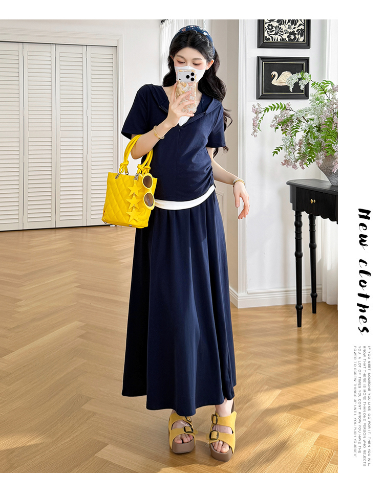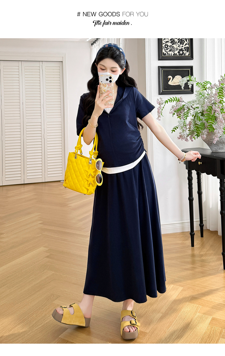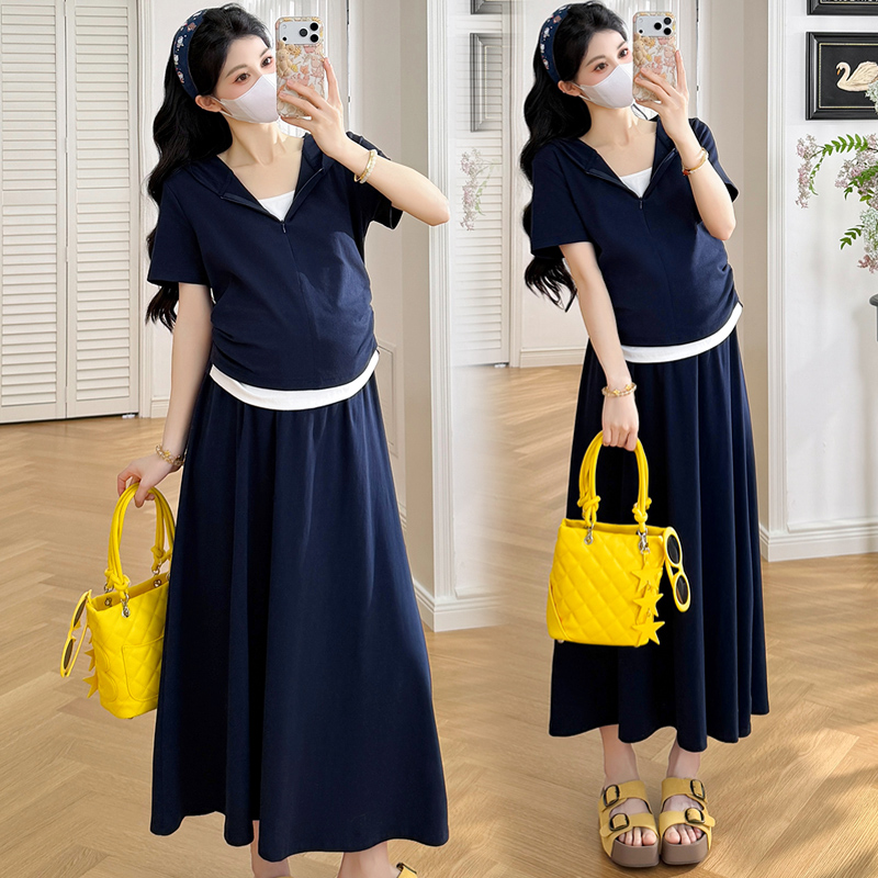 실사 출산 착용 여름 드레스 패션 임산부 드레스 루즈핏 중간 길이 멜빵 치마 세트 외국 가스 트렌디 엄마 반팔