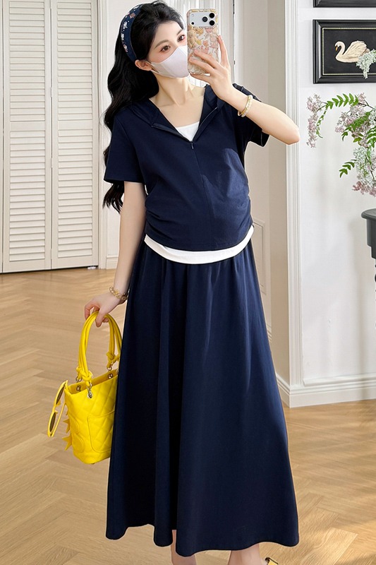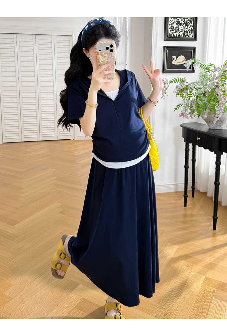 실사 여름 캐주얼 후드 페이크 레이어드 임신 엄마 운동 니트 세트