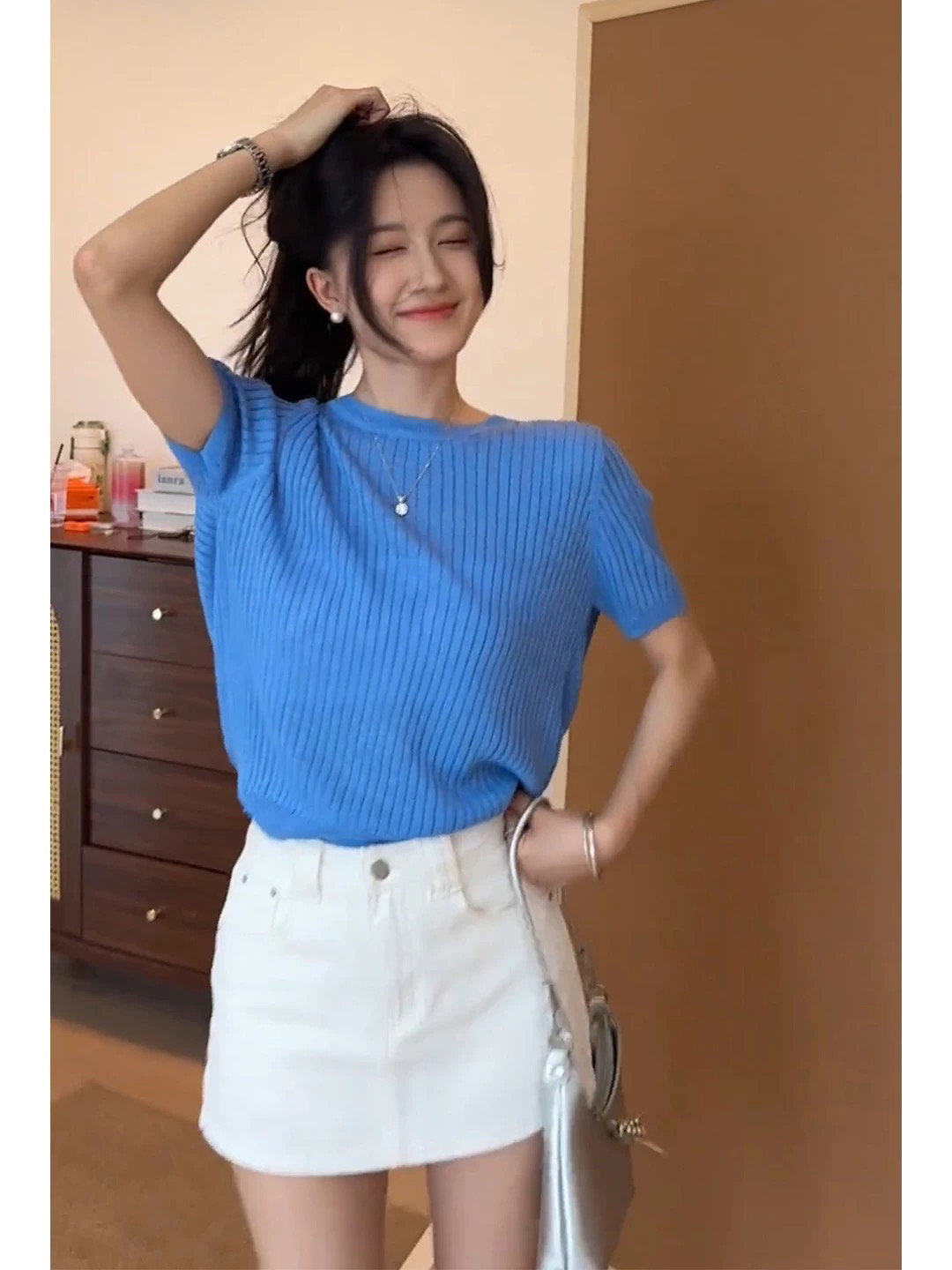 도파민 착용 가져 가라. 파란색 대 백리스 얼음 실크 반팔 니트 스웨터 여름 얇은 스타일 슈퍼 잘 생긴 홀로우 아웃 티셔츠 맨위