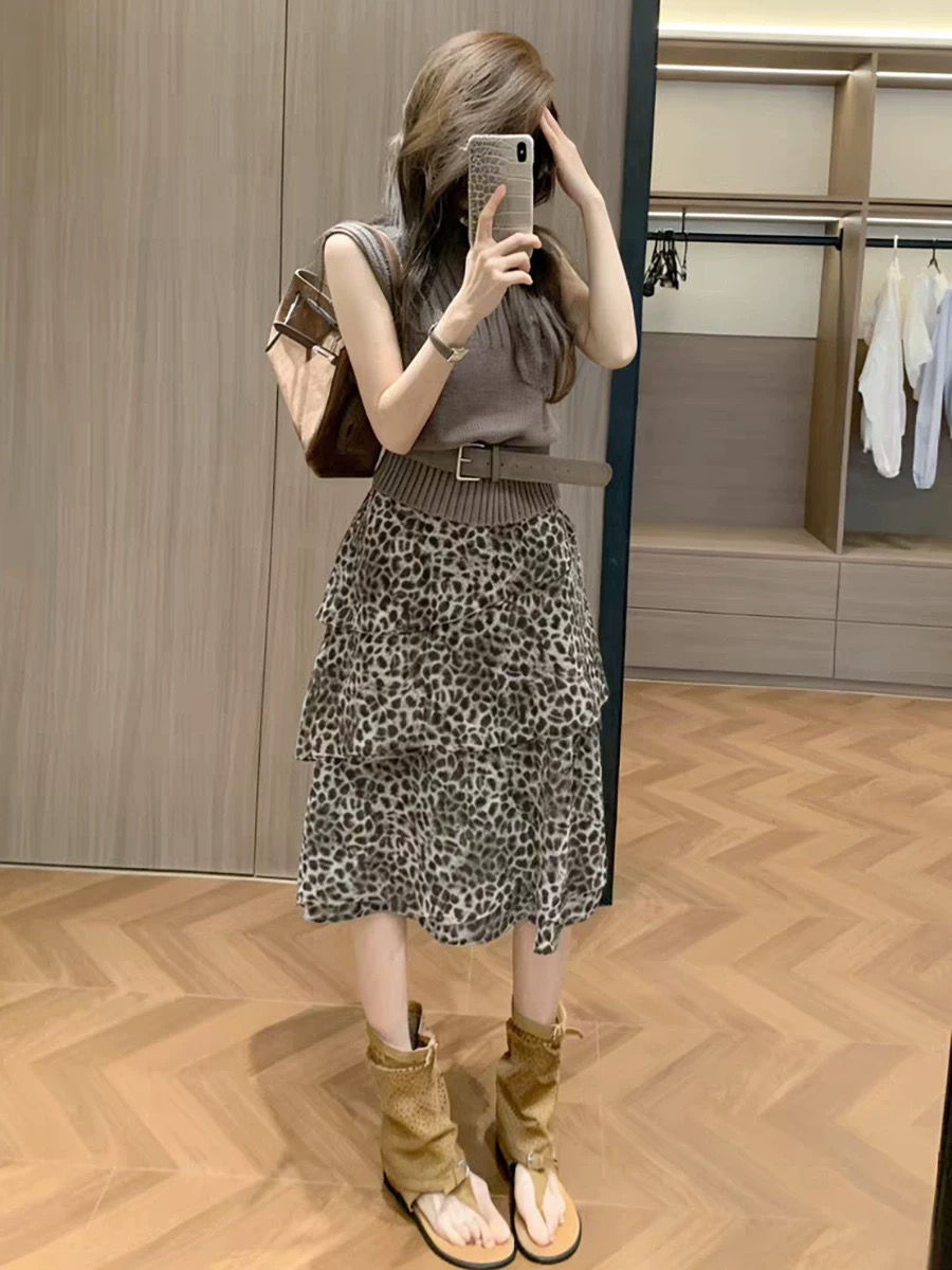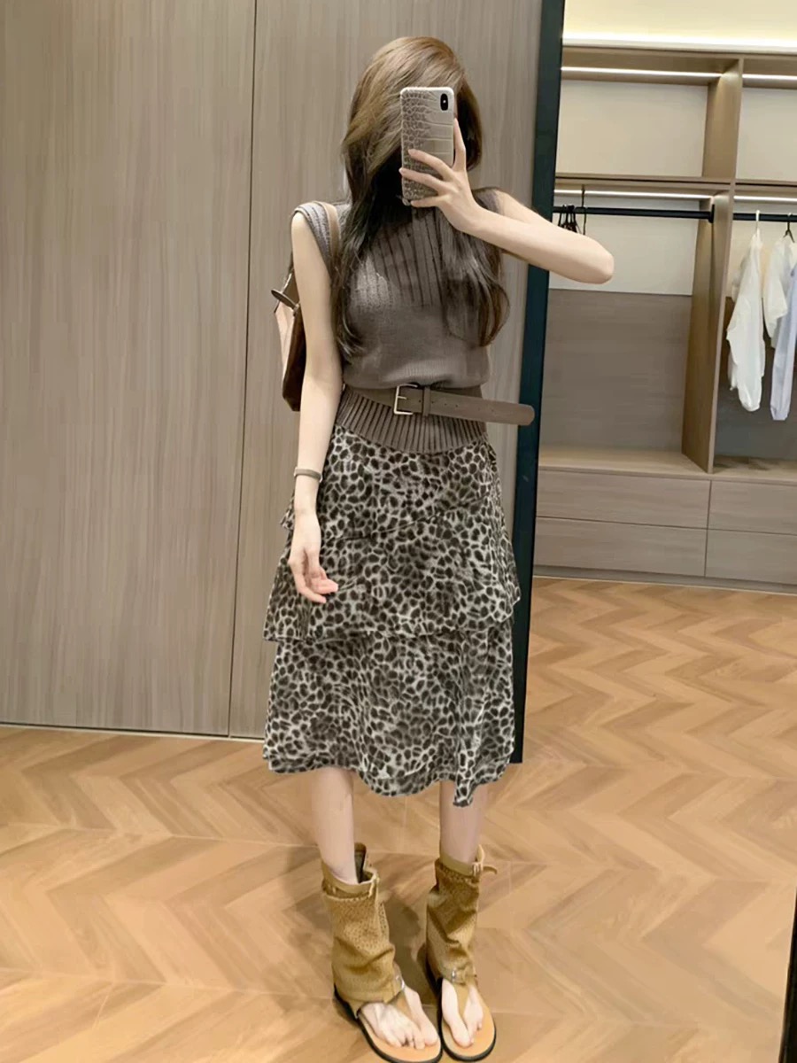 여름 2026 고급 센스 인터넷 유명인 착용 가져 가라. 몸매 가꾸기 슬림해 보이는 맨위 품격 허리 수축 한 마디 레오파드 무늬 반신 치마 세트