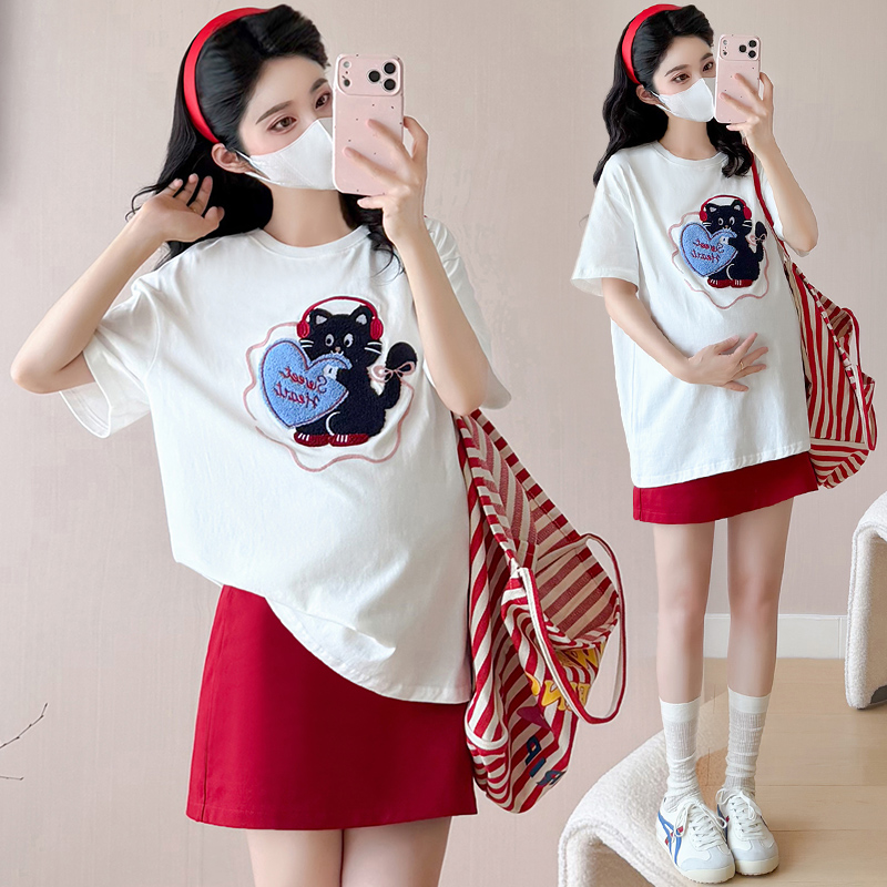 여름 새로운 한국 스타일 루즈핏 무거운 작업 수건 자수 연령 감소 순면 티셔츠 운동 반신 스커트 트렌디 엄마 세트