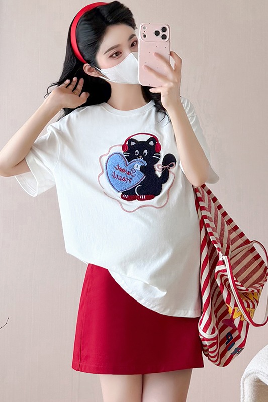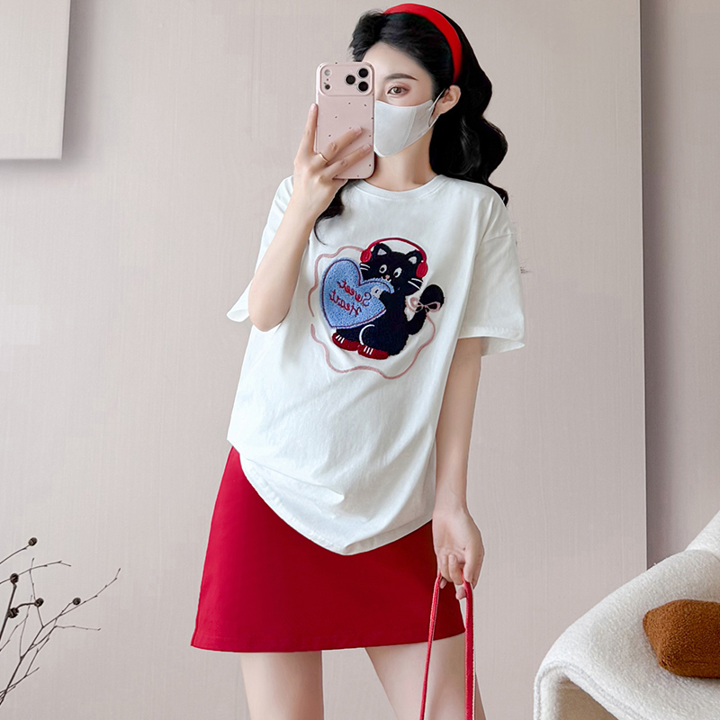 실사 여름 한국 스타일 루즈핏 무거운 작업 수건 자수 연령 감소 티셔츠 운동 반신 스커트 트렌디 엄마 세트