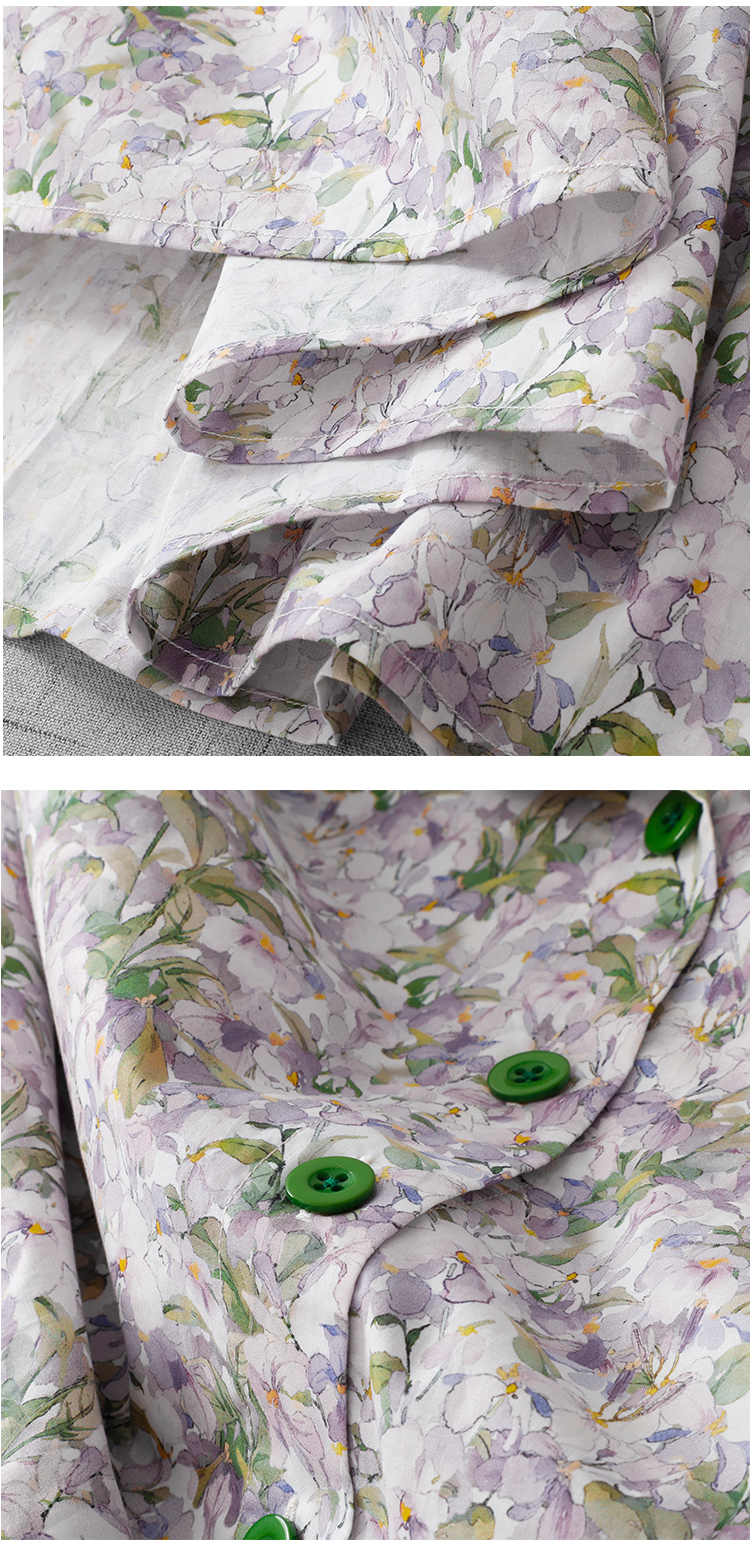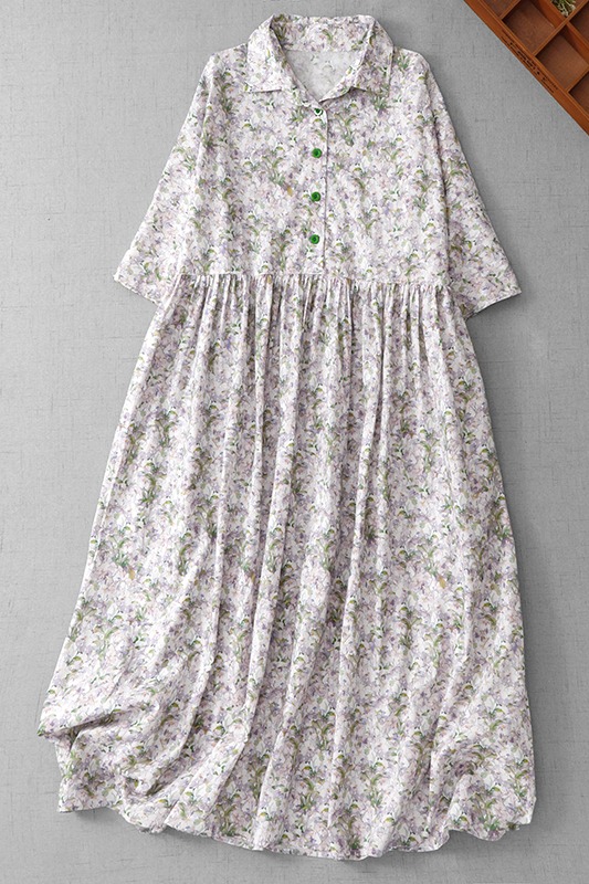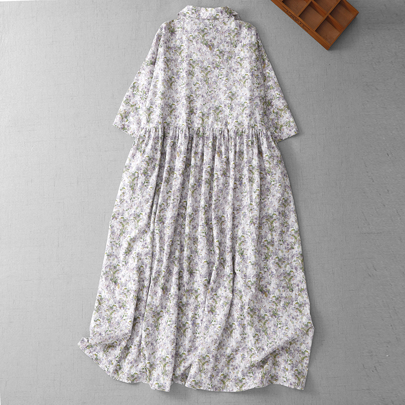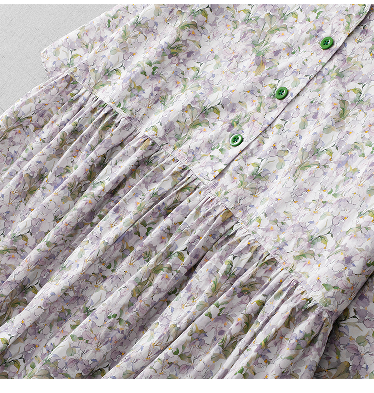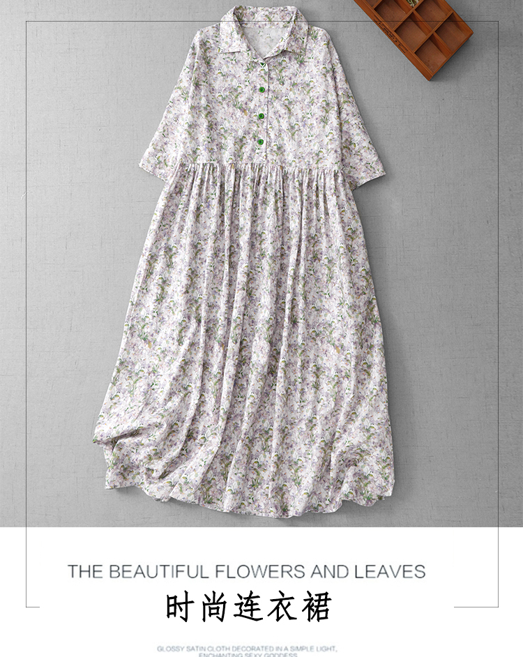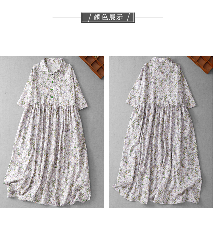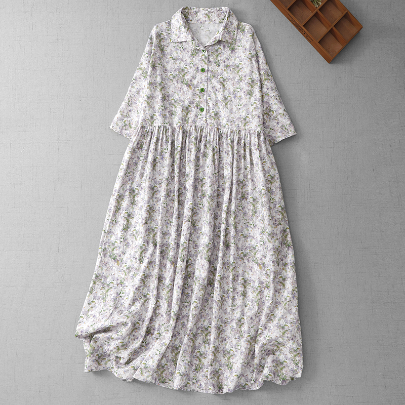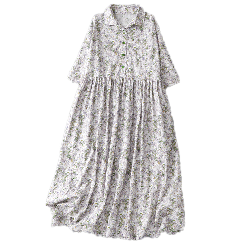 3928 일본식 좋은 제직 면 꽃무늬 셔츠 칼라 드레스 부드러운 품격 루즈핏 가을 어깨 소매 꽃무늬 중간 길이 스커트