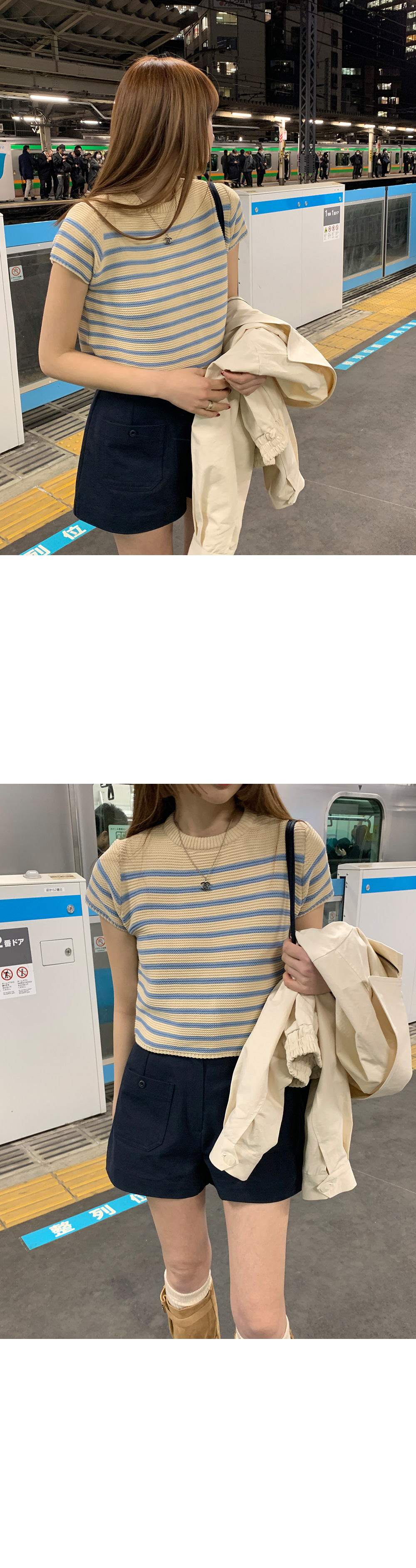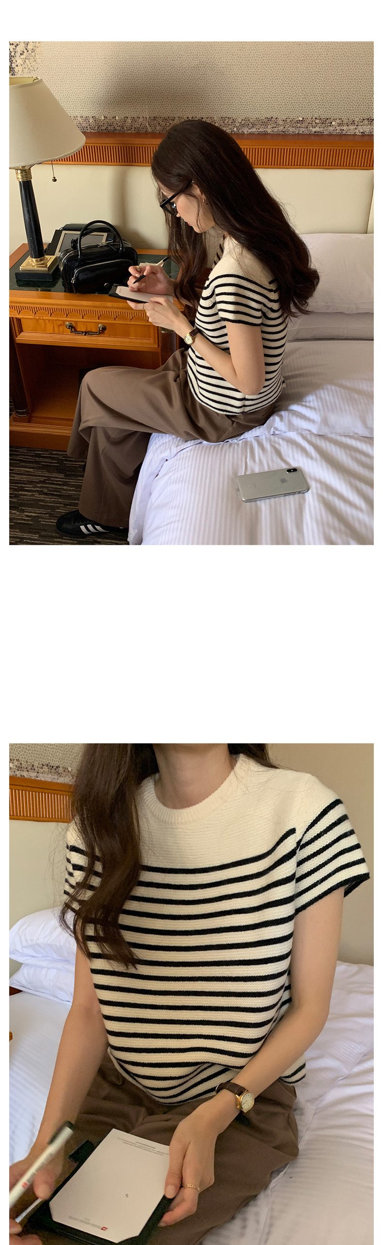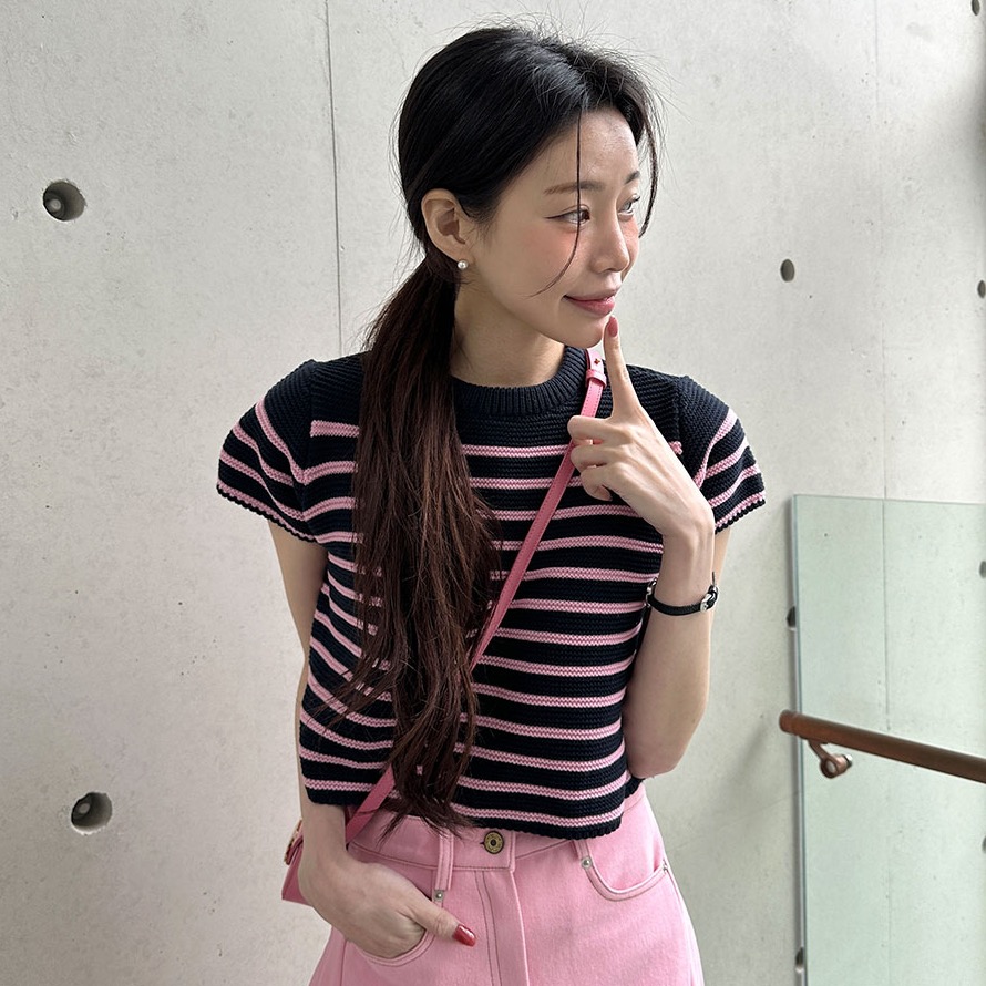 있음 선적 한국 ins 디자인 센스 패치워크 색상 스트라이프 라운드 넥 반팔 이후 진자 두 버클 니트 스웨터