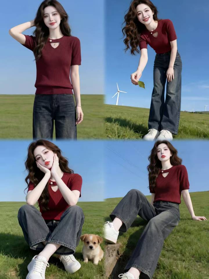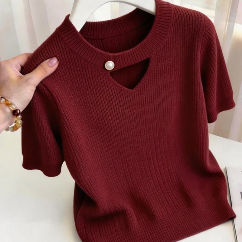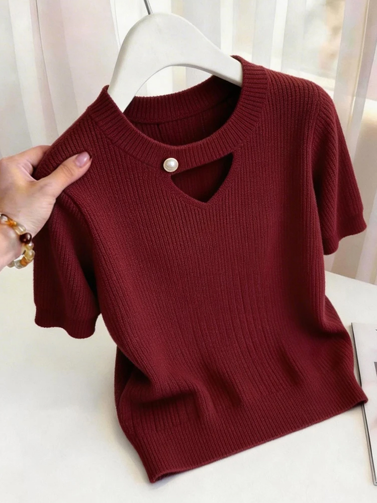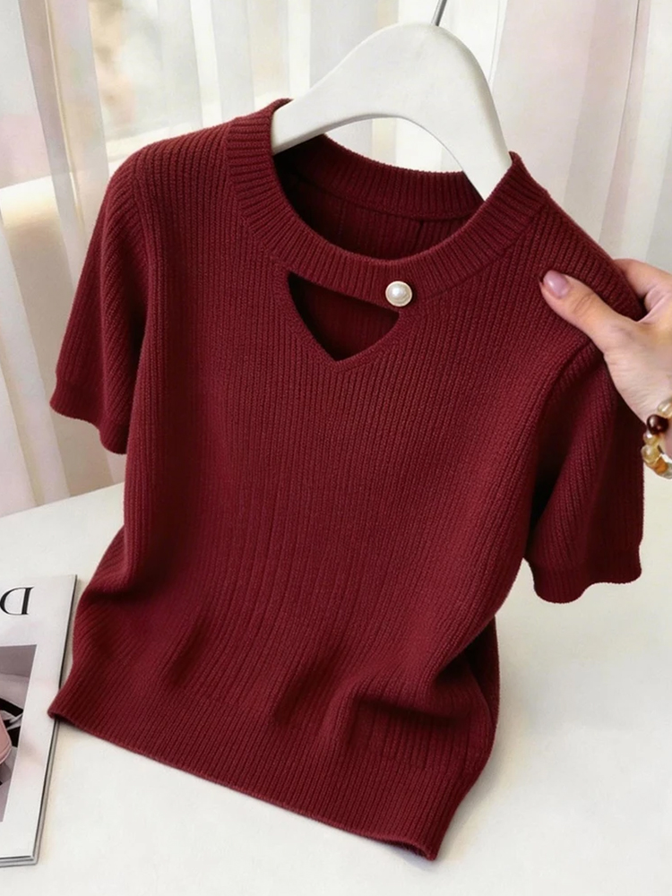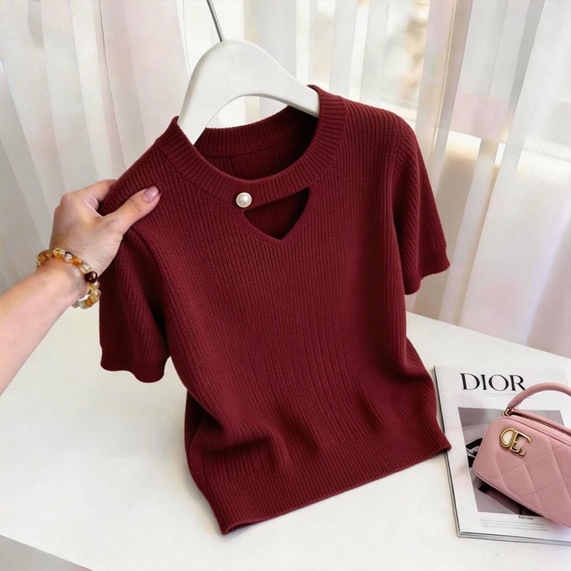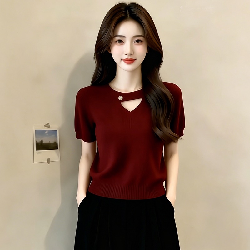 디자인 센스 홀로우 아웃 패치워크 반팔 니트 스웨터 여성 2026 여름 새로운 외국 가스 몸매 가꾸기 슬림해 보이는 맨위