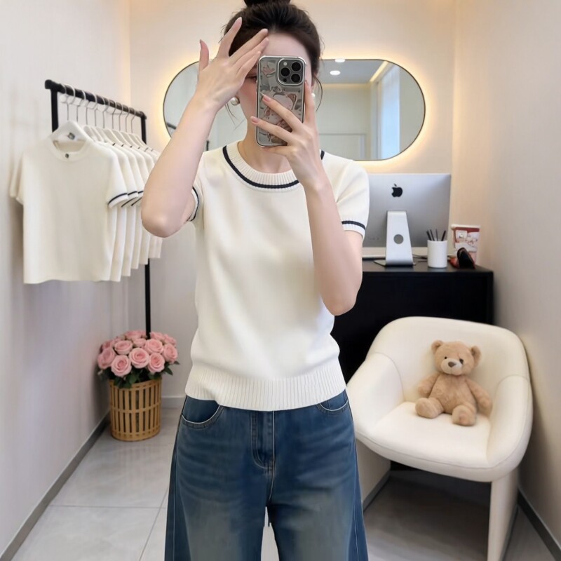 라운드 넥 배색 측면 니트 반팔 여성 2026 여름 몸매 가꾸기 출퇴근 바람 작은 대중 디자인 센스 연령 감소 다용도 맨위